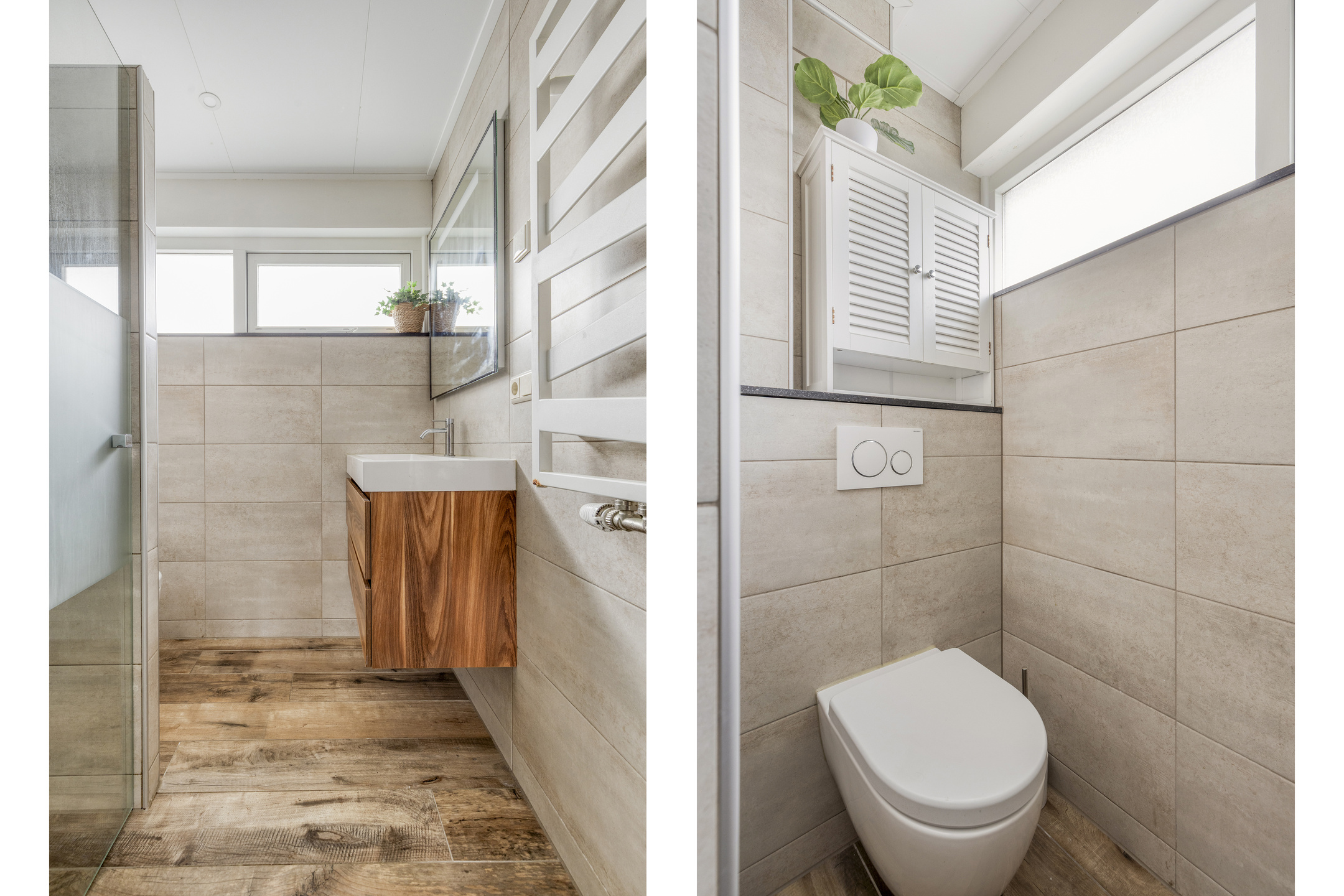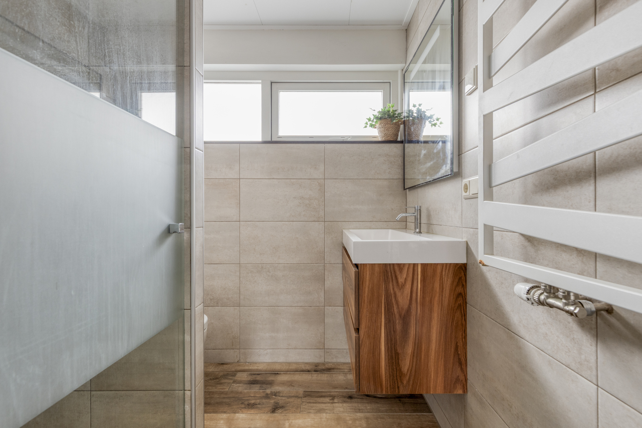 The second bedroom is equally attractive: located at the rear, overlooking greenery and water. The third bedroom can also serve as a nursery, home office, or guest room. The bathroom is modern, sleek, and warm in appearance, featuring a washbasin cabinet, designer radiator, second toilet, and a generous walk-in shower with both a rain shower and hand shower.