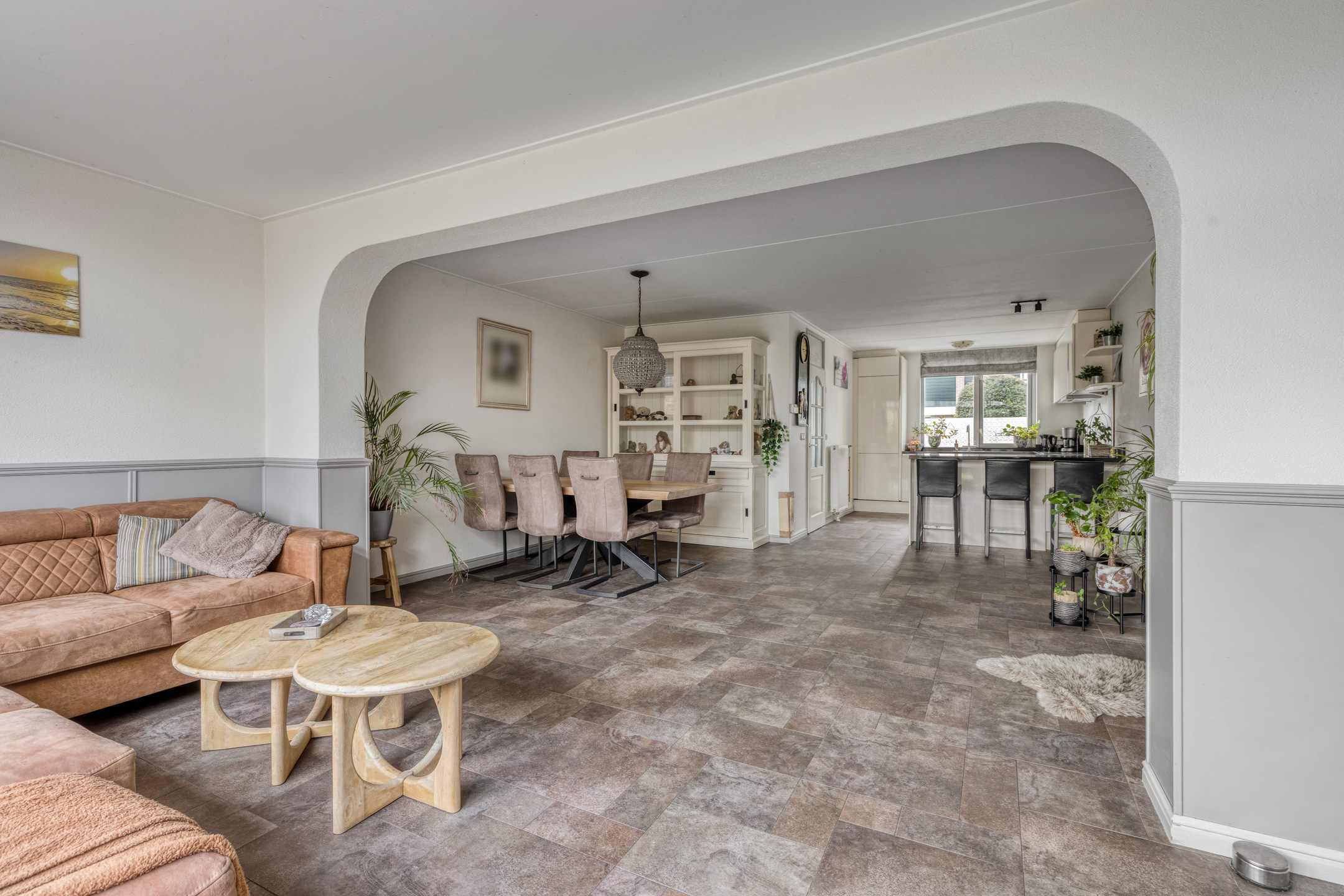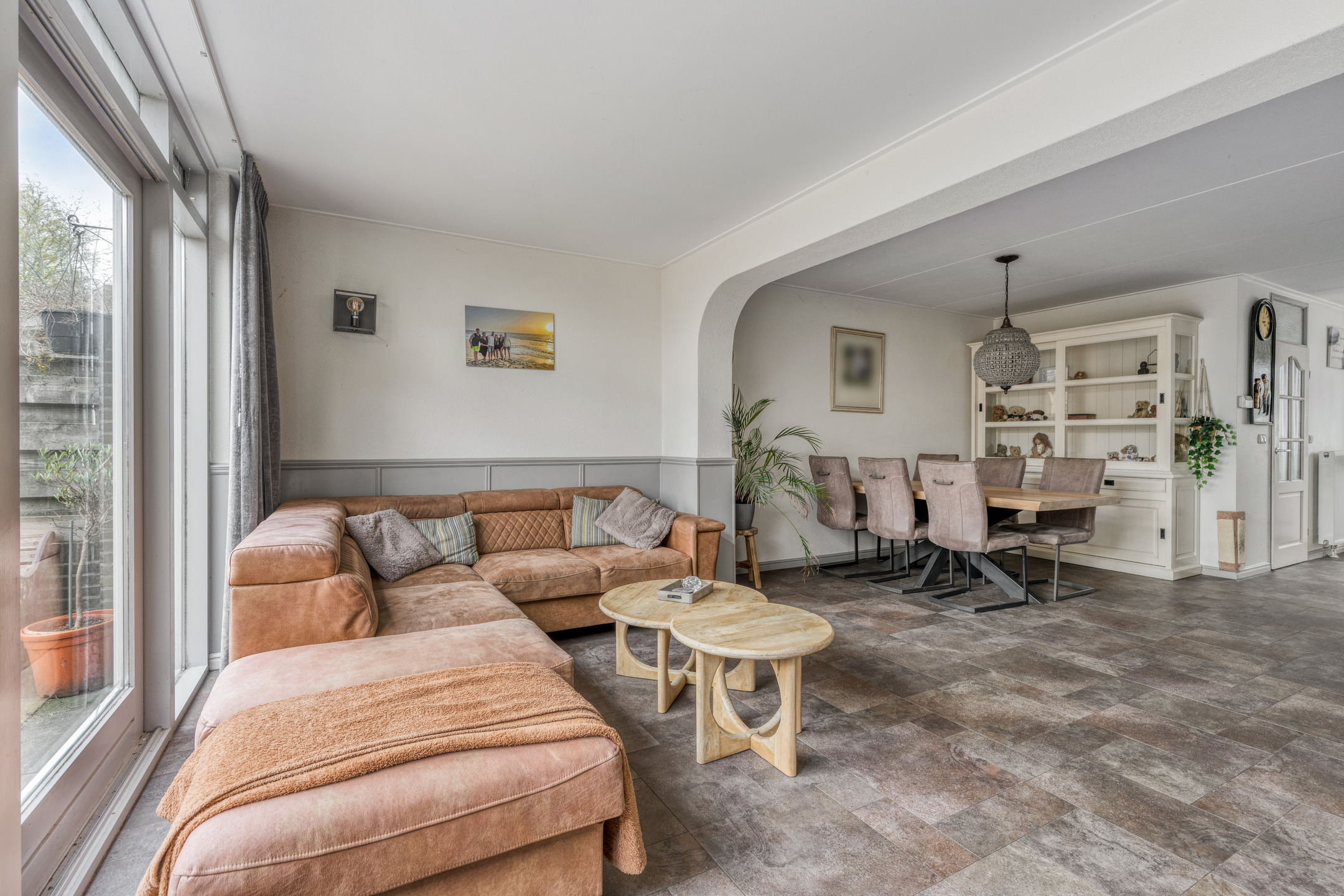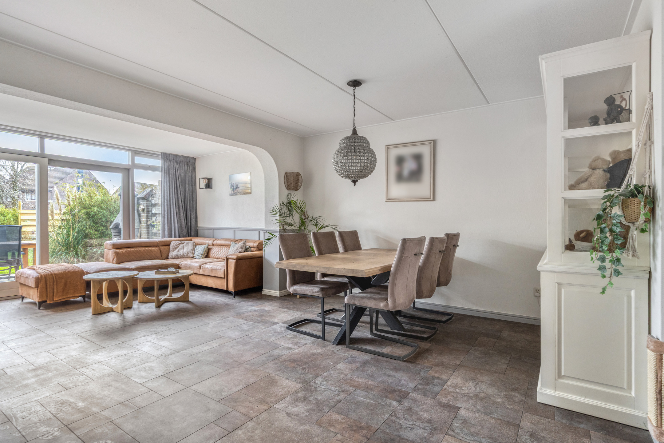 And we haven’t even mentioned the fantastic living room yet. It features large sliding doors that provide direct access to the sunny garden. There is also plenty of space for both a dining and sitting area. The utility room offers ample storage space, ideal for a large family. From the utility room, you have access to the large garage of over 25 m², perfect for parking a car and/or other uses.