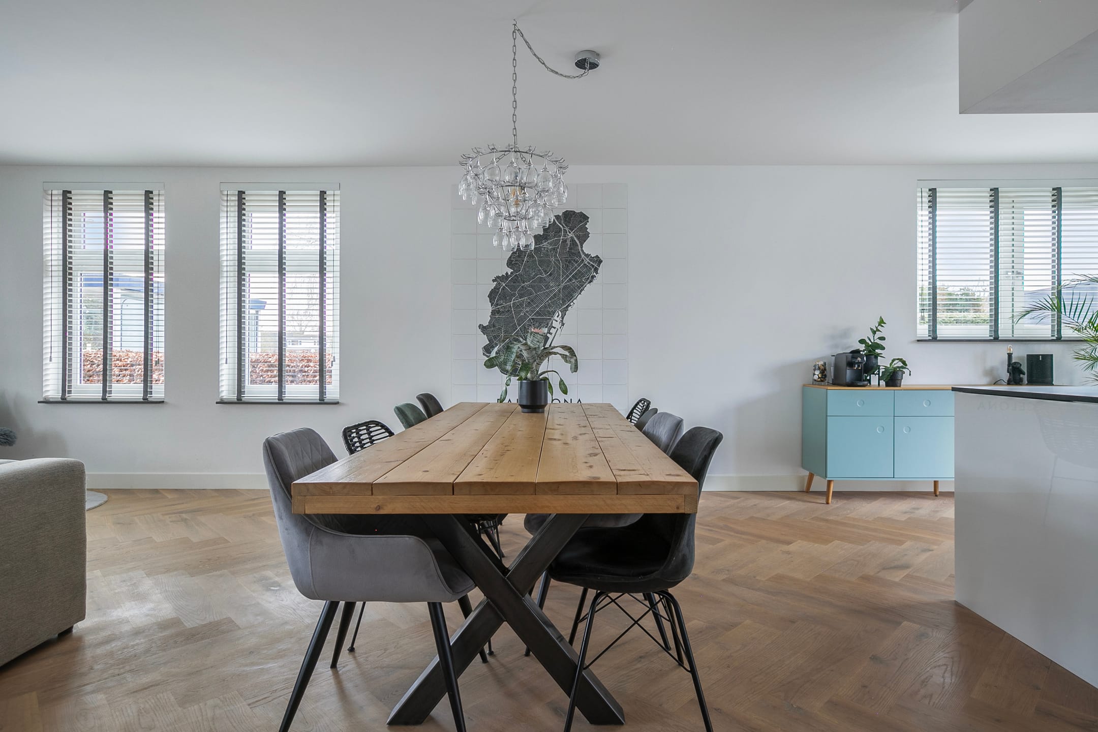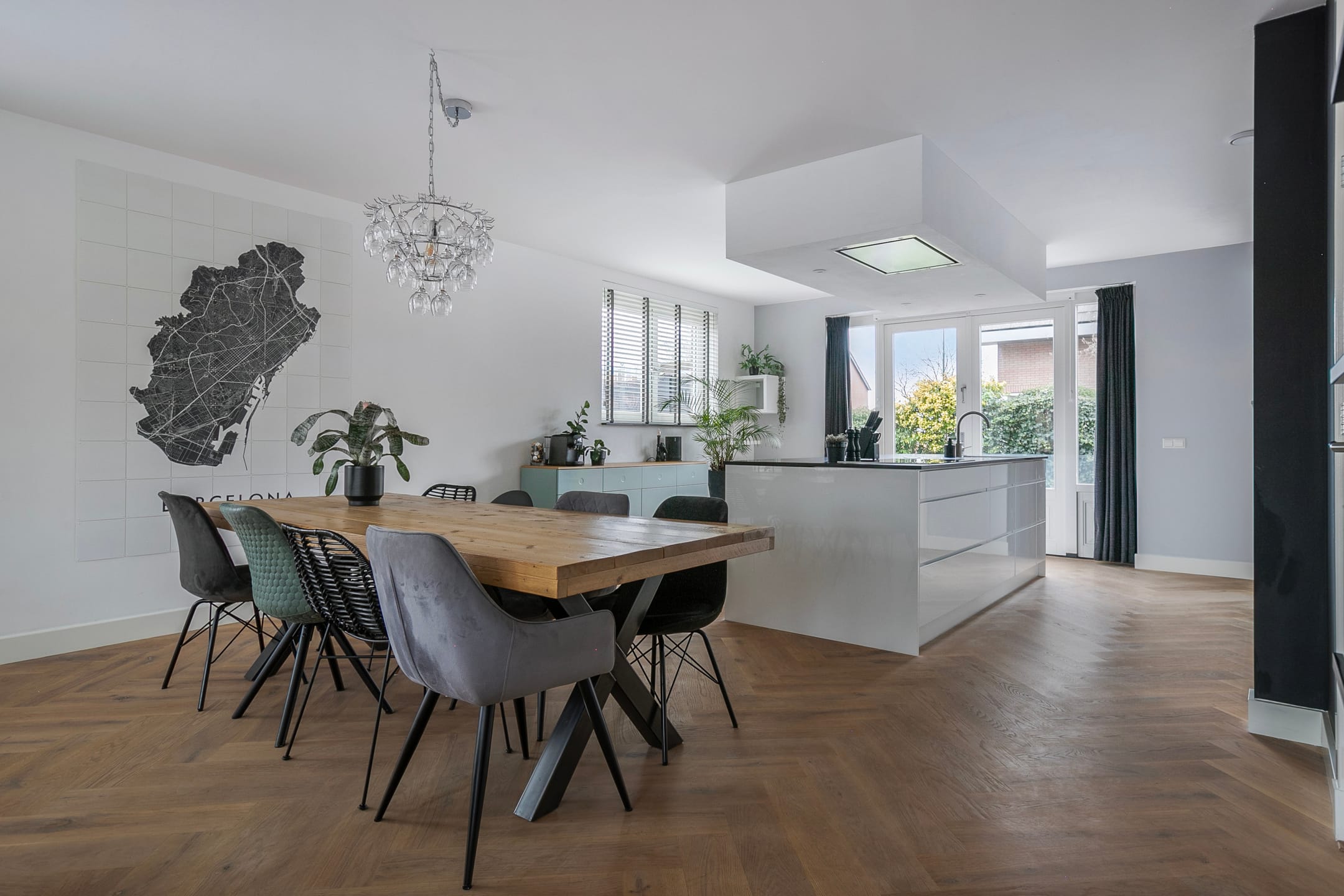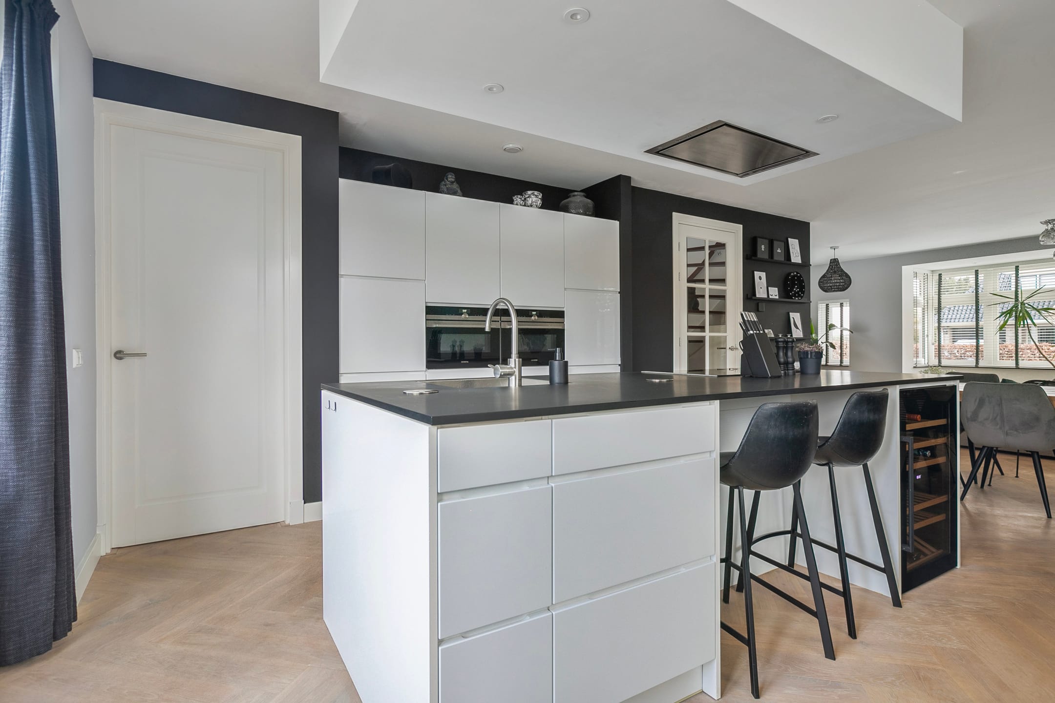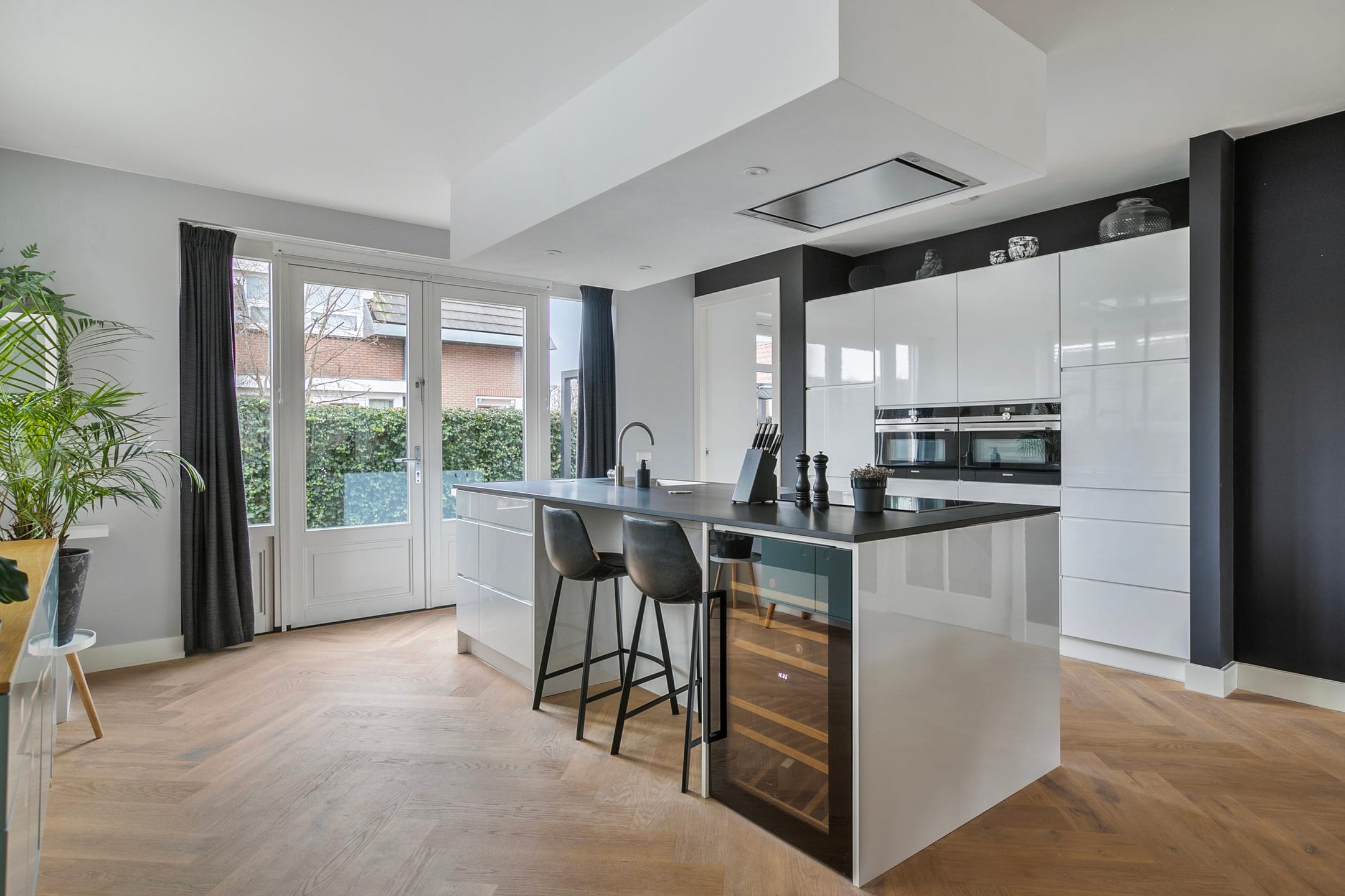 The house has a private driveway with charging facilities for an electric car. Through the spacious hall with cloakroom and toilet, you enter the bright, spacious living room. Thanks to the large windows and open layout, the living space is bright, inviting and uncluttered – perfect for both family life and receiving guests.