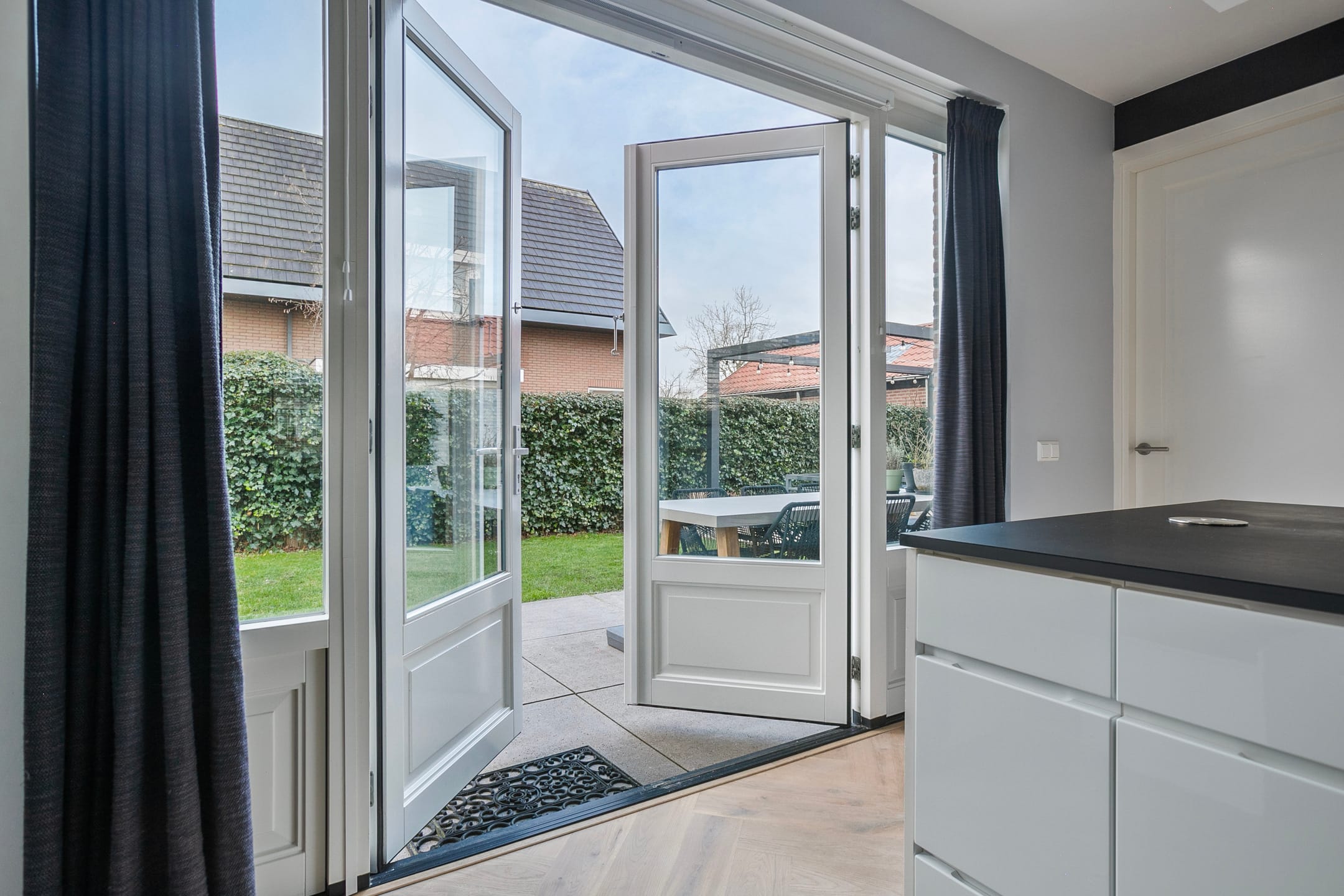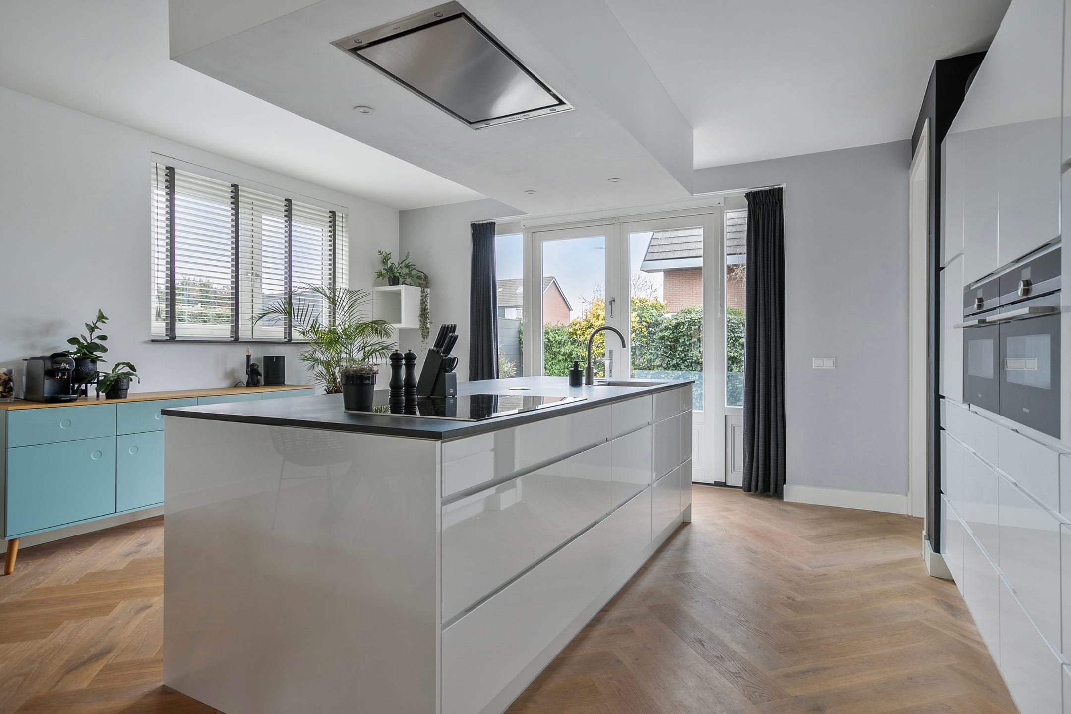 The open-plan kitchen is the heart of the house and is equipped with modern built-in appliances. Here you can cook with a view of the sunny garden, located on the beloved south-west, where children can play freely and parents can relax and enjoy long summer evenings.