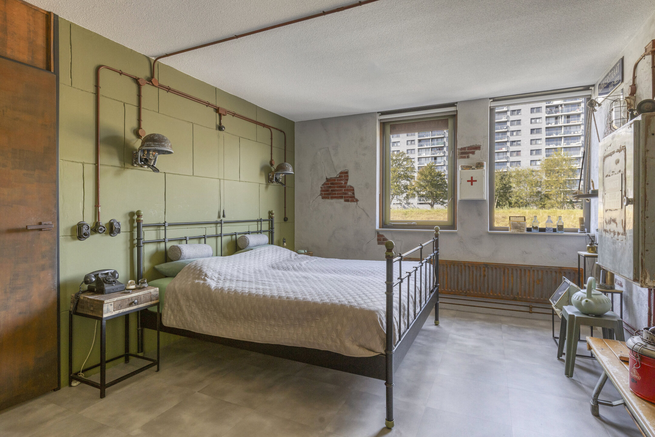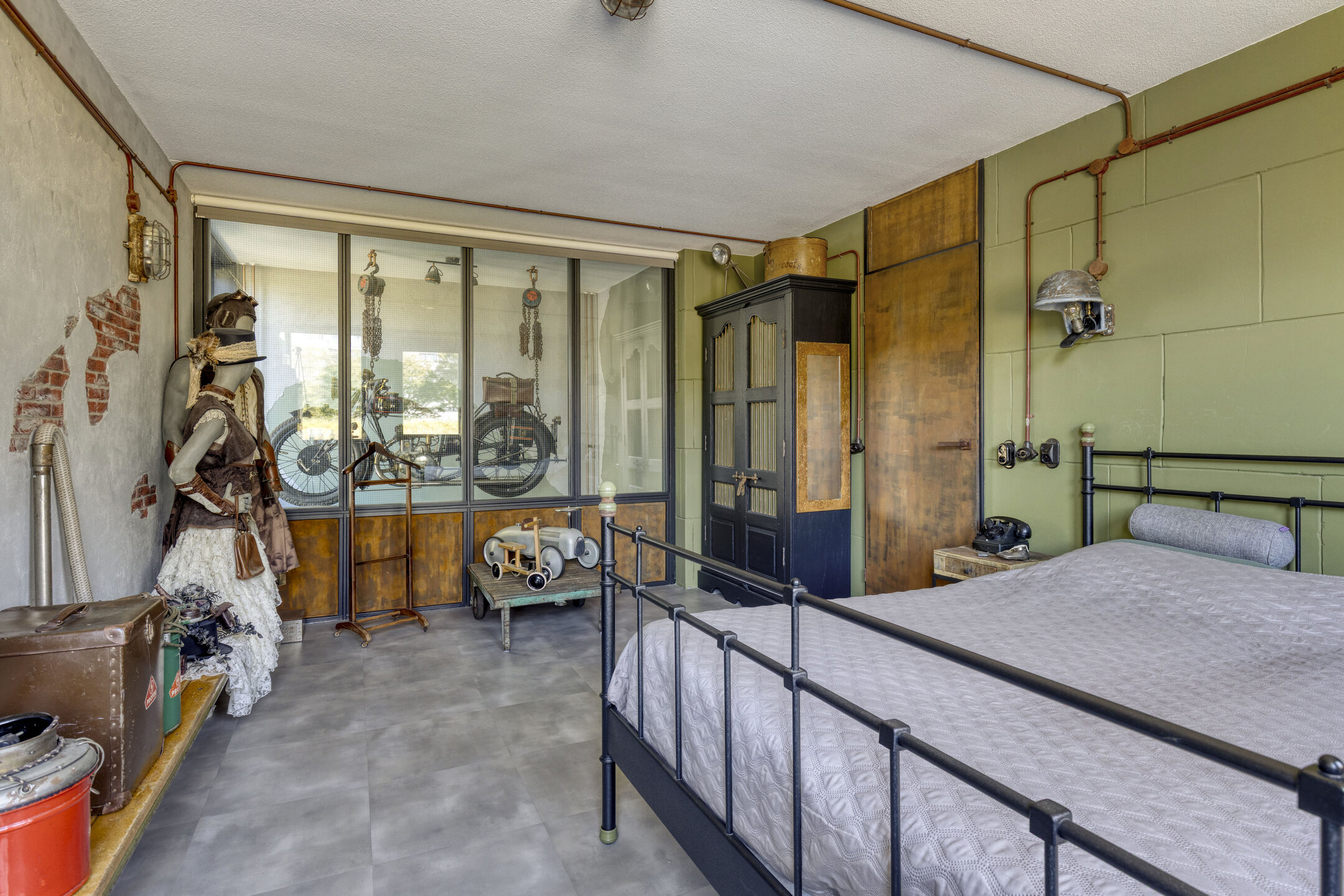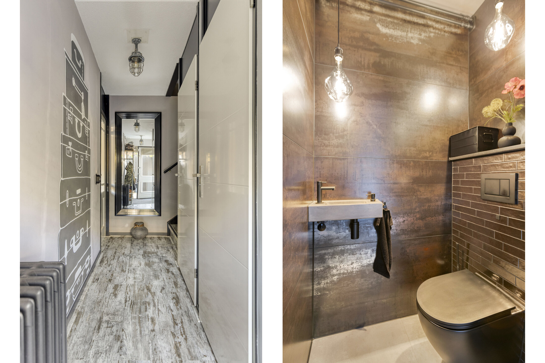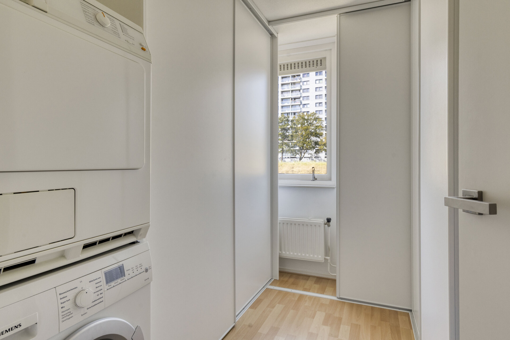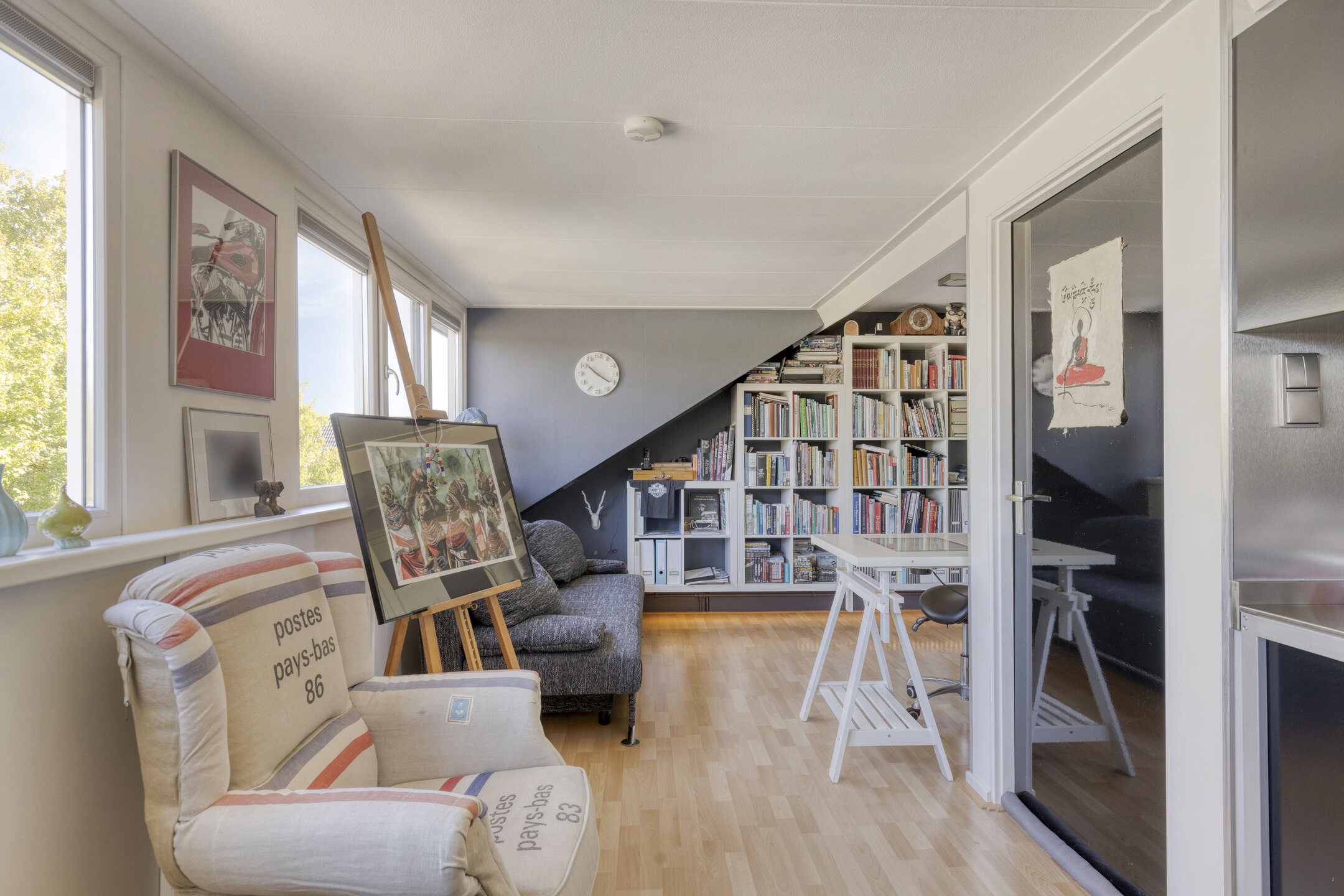 In the hallway, you’ll find the modern, renovated toilet and meter cupboard. The stairs lead to the first floor, where you’ll find a very spacious bedroom and another smaller bedroom. The master bedroom looks down through a window and offers a stunning view of the dike and greenery on the other side. The smaller bedroom is designed as a convenient dressing room with tall cabinets and laundry facilities.