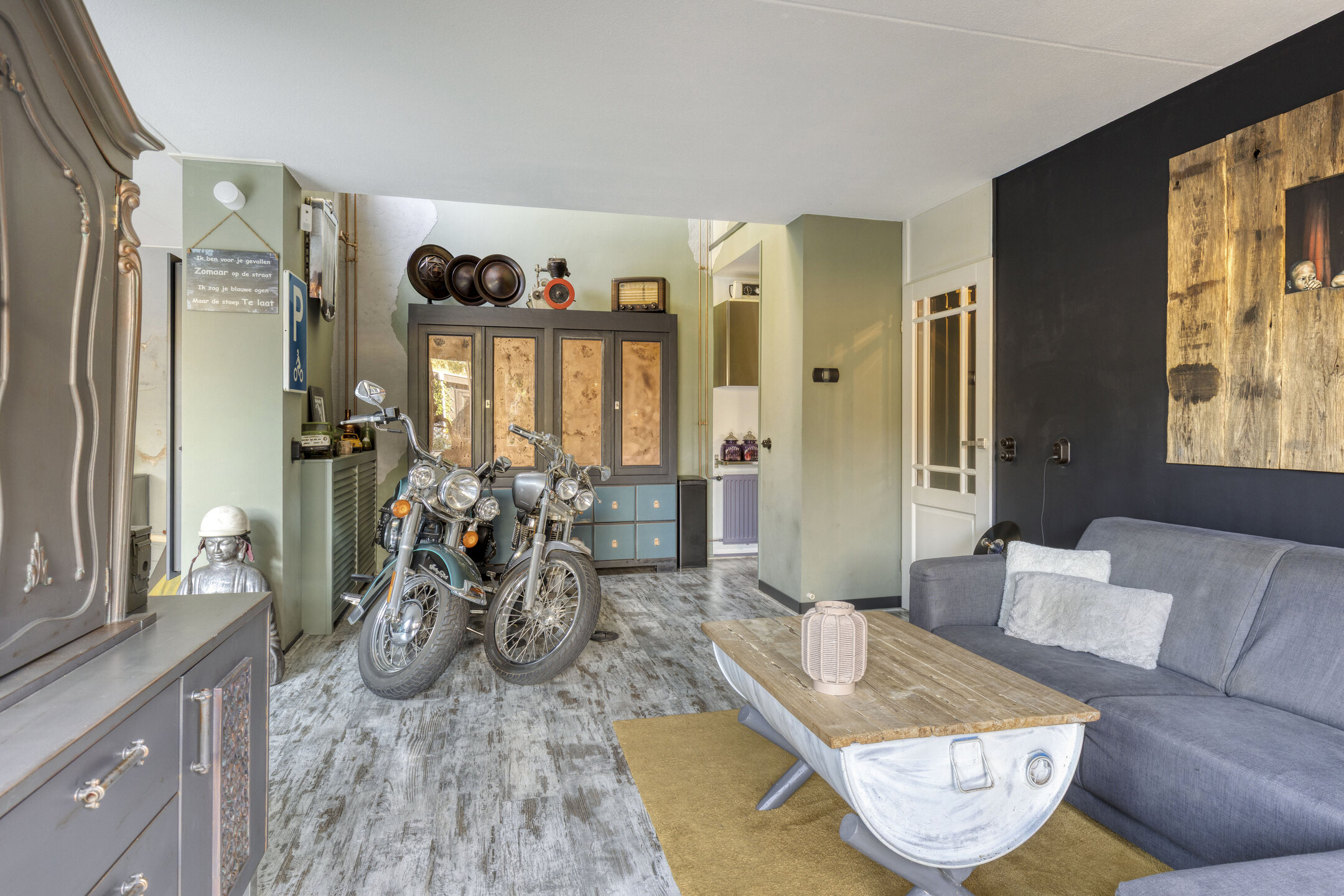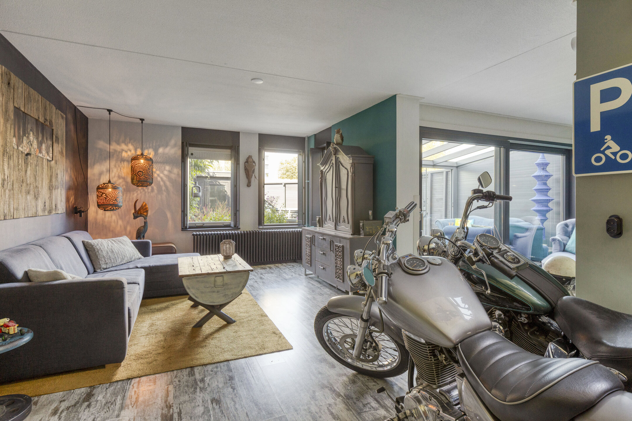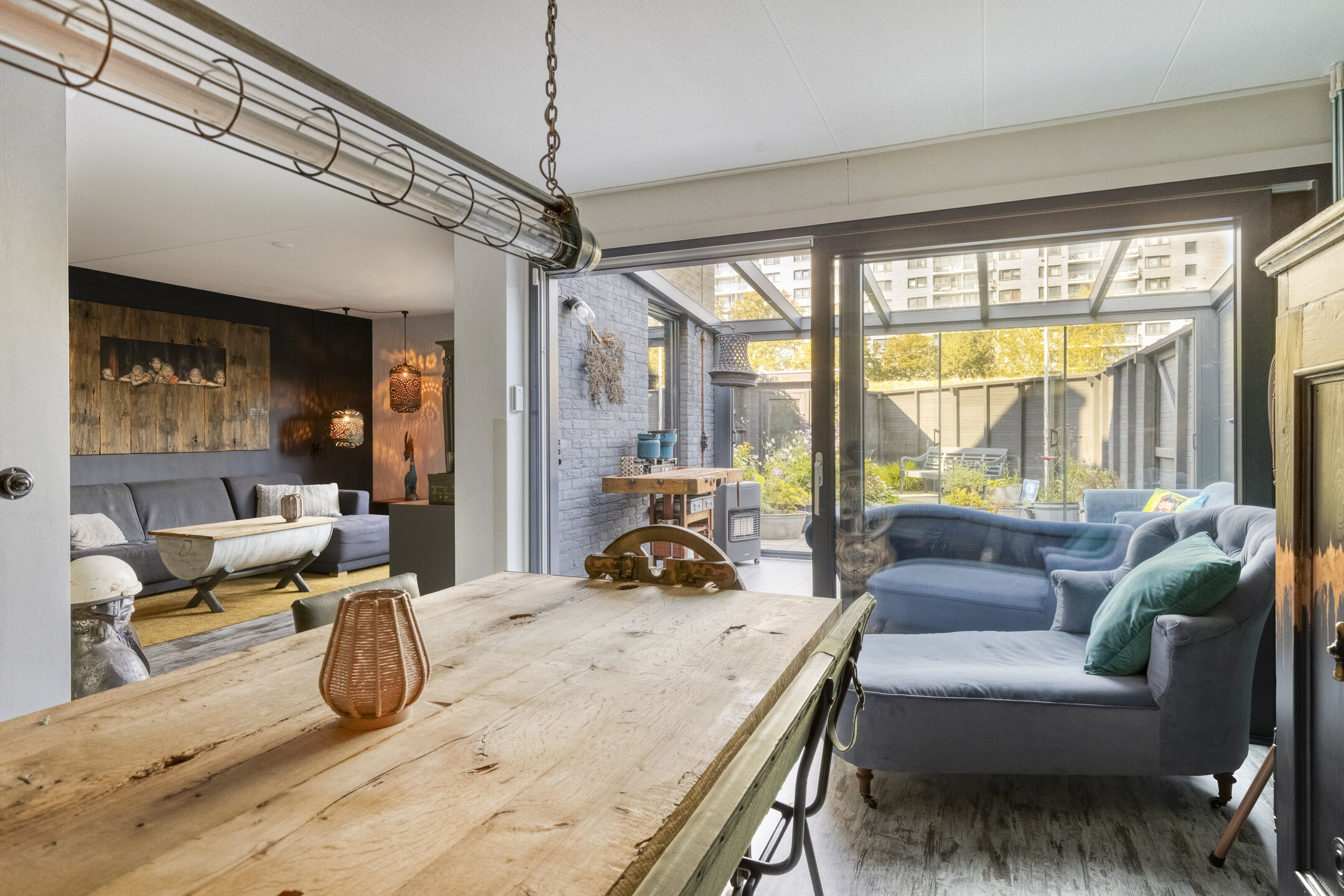 Via de zwarte poort beland je direct in de verzorgde tuin van de woning. Hier kun je naar binnen via de voordeur of via de serre, waar het gehele jaar goed vertoeven is doordat deze volledig is afgesloten. Op het terrein bevindt zich een ruime berging en een vrijstaande garage met plek voor een auto. In de speelse woonkamer heb je diverse gezellige zithoeken, een moderne keuken en tevens een gedeelte waar je helemaal tot aan het plafond van de eerste verdieping kunt kijken. Je ervaart ontzettend veel ruimte door deze goede indeling, en toch heb je een knusse sfeer in een stoer jasje!