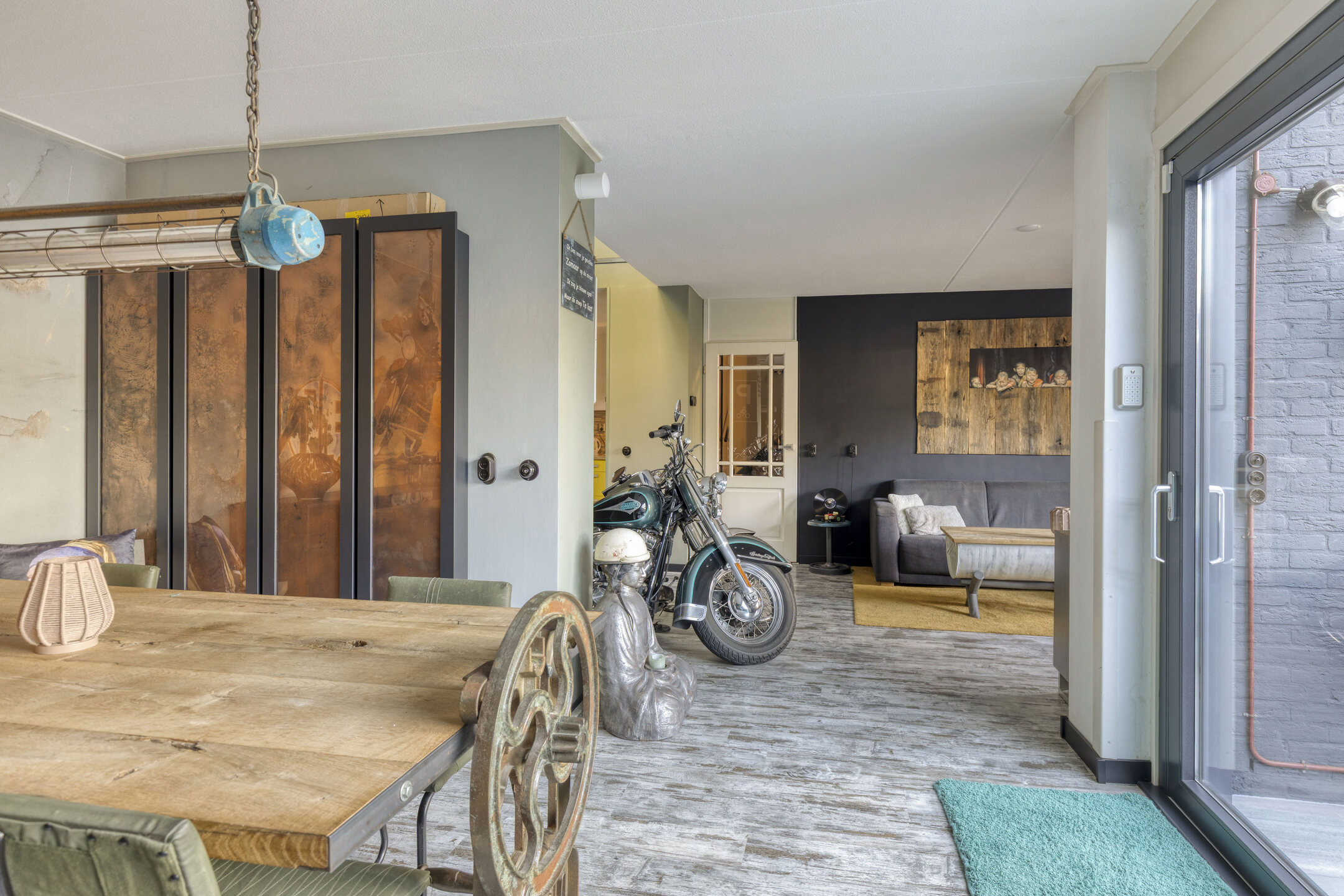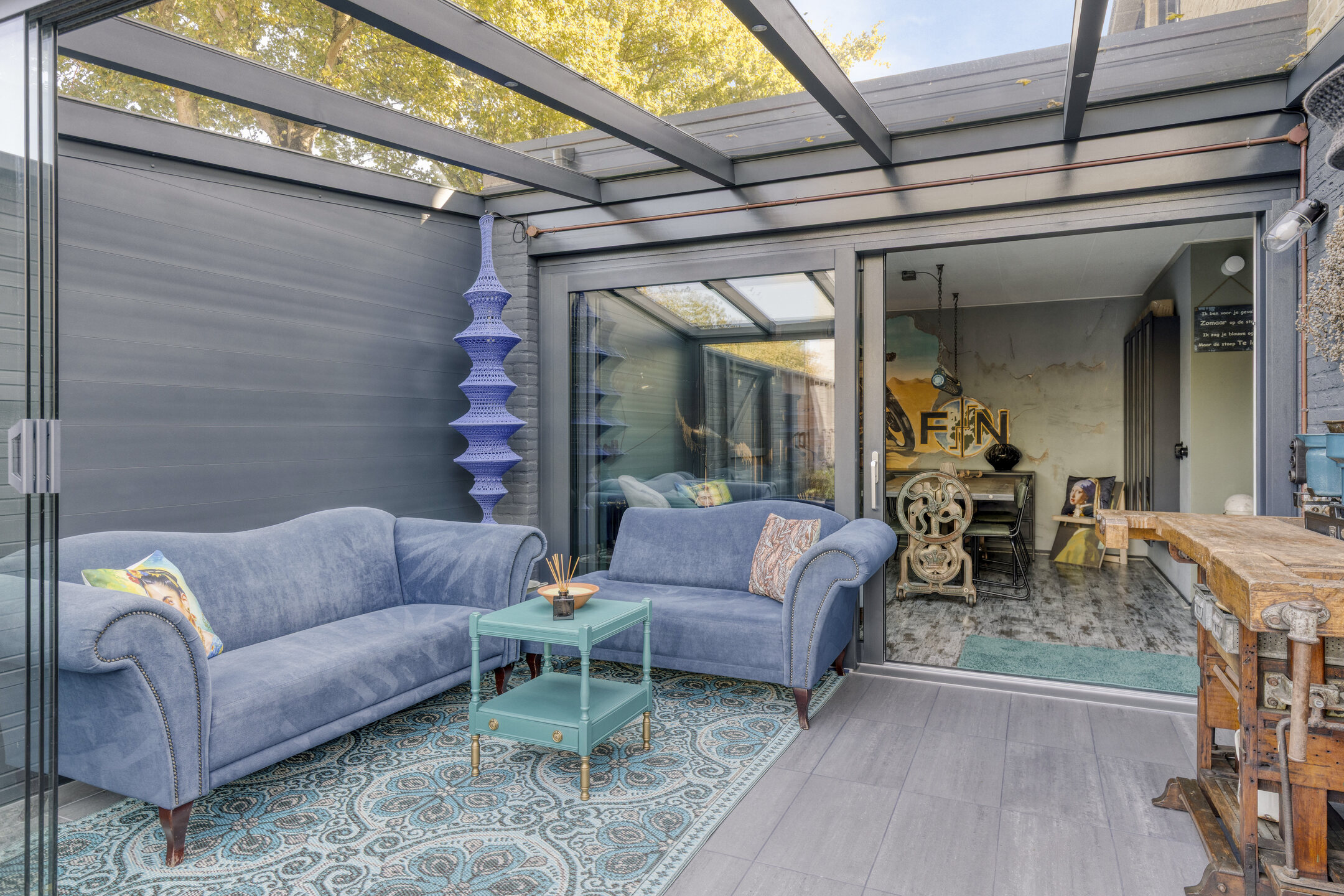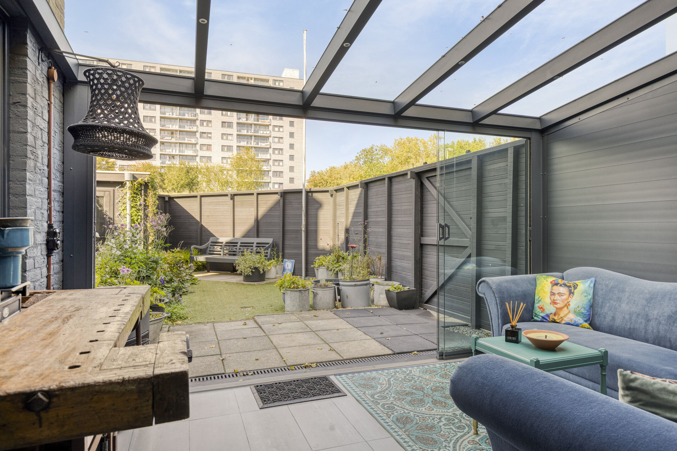 Via de zwarte poort beland je direct in de verzorgde tuin van de woning. Hier kun je naar binnen via de voordeur of via de serre, waar het gehele jaar goed vertoeven is doordat deze volledig is afgesloten. Op het terrein bevindt zich een ruime berging en een vrijstaande garage met plek voor een auto. In de speelse woonkamer heb je diverse gezellige zithoeken, een moderne keuken en tevens een gedeelte waar je helemaal tot aan het plafond van de eerste verdieping kunt kijken. Je ervaart ontzettend veel ruimte door deze goede indeling, en toch heb je een knusse sfeer in een stoer jasje!