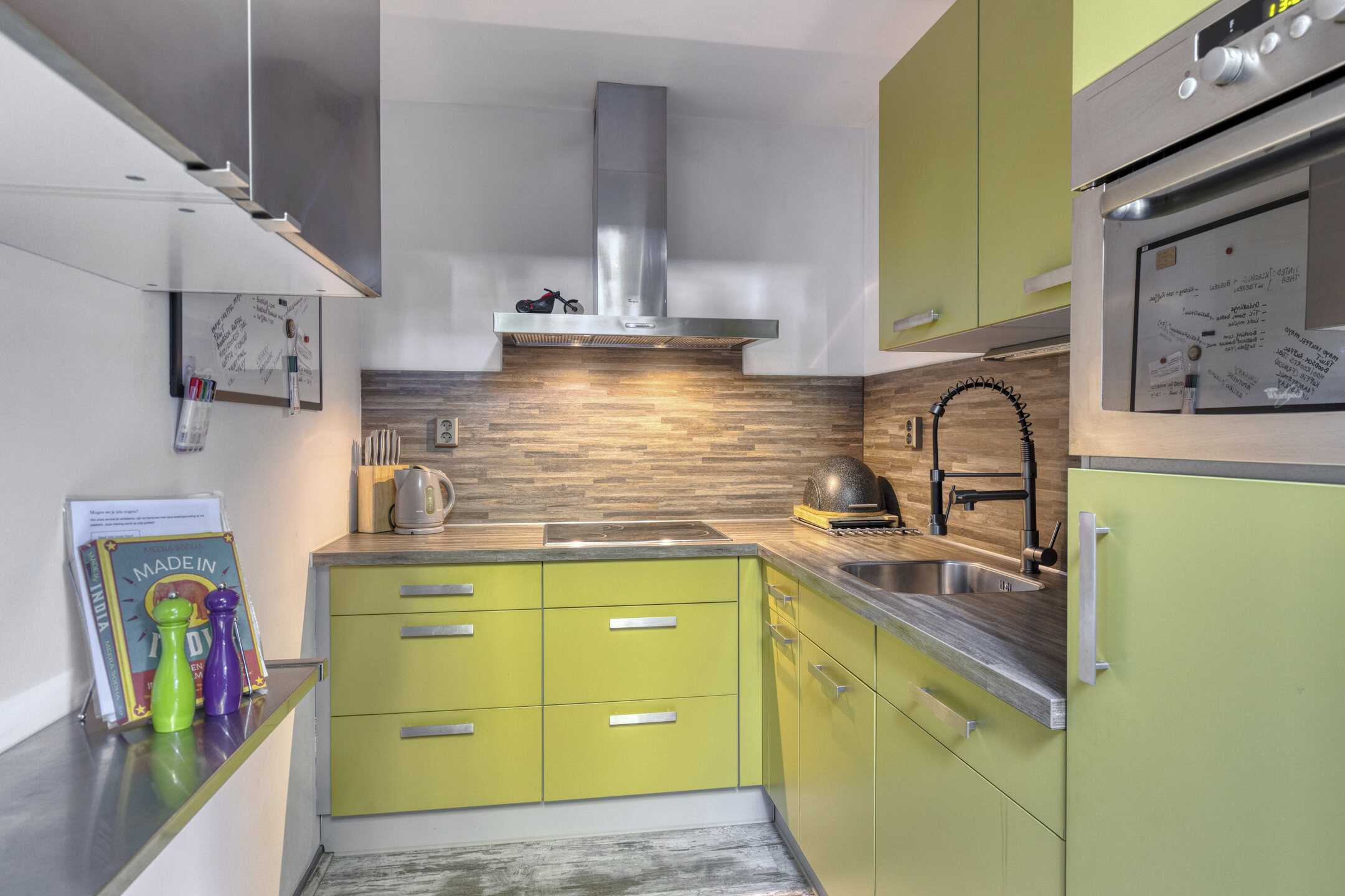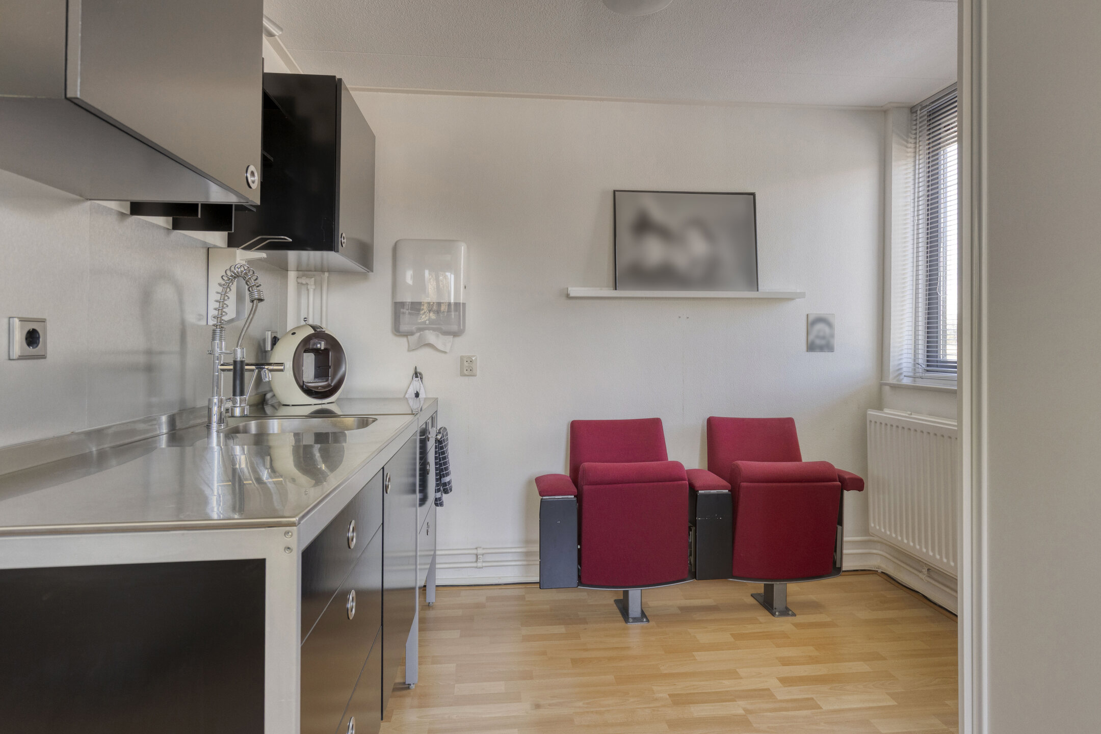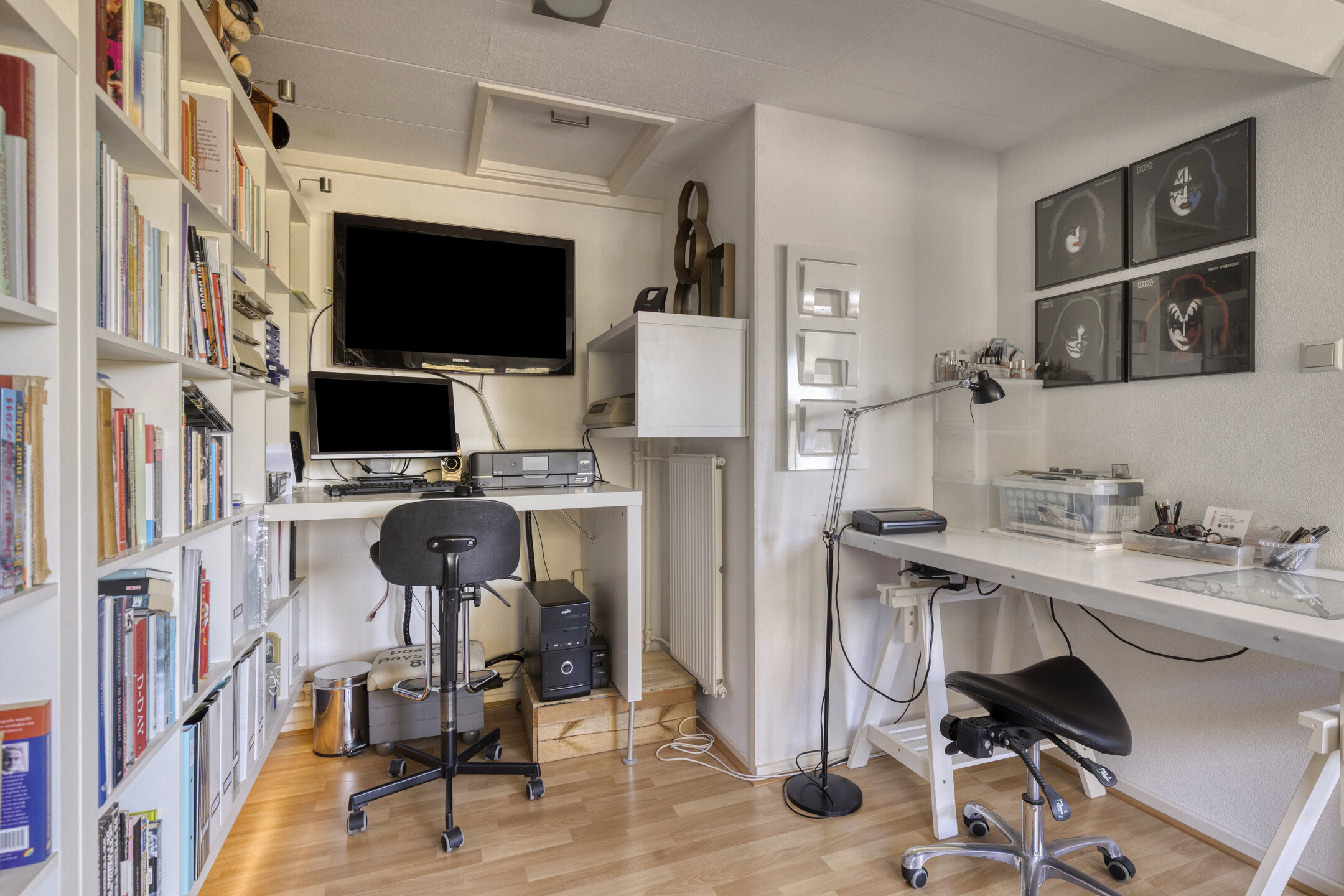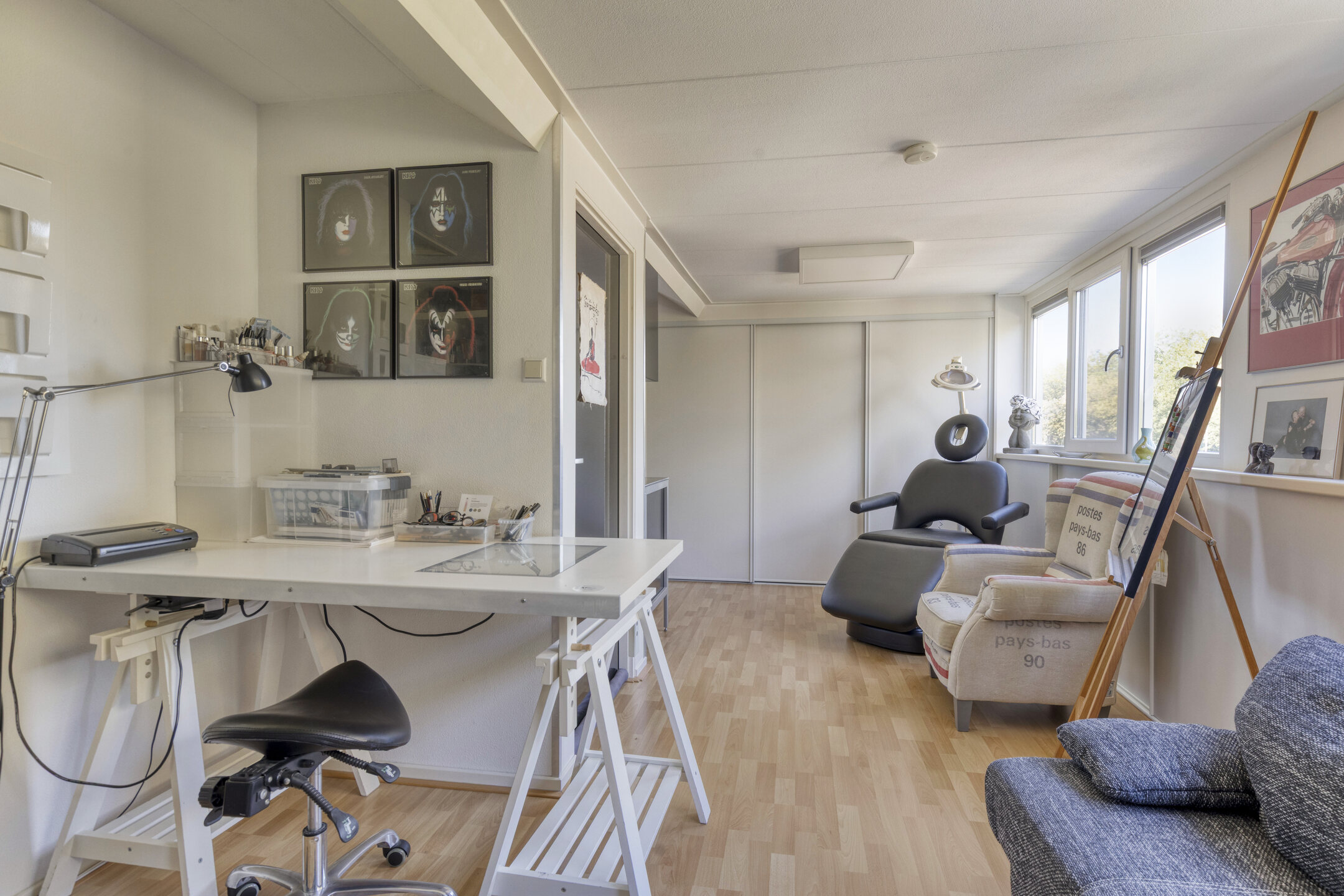 Op de bovenste verdieping van de woning is een thuiswerkplek gecreëerd. Ook hier is voldoende bergruimte en plaats genoeg voor bijvoorbeeld een salon aan huis, een thuiskantoor of eventueel een gasten appartement. Als klap op de vuurpijl heeft deze verdieping een eigen keuken, wat natuurlijk onmisbaar is bij een werkplek aan huis.
