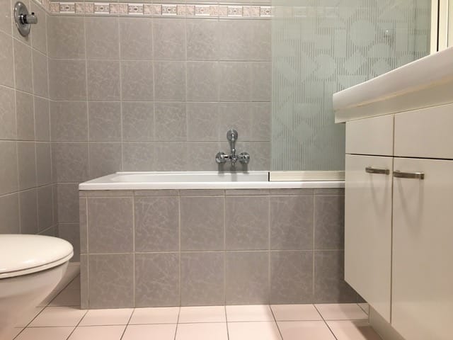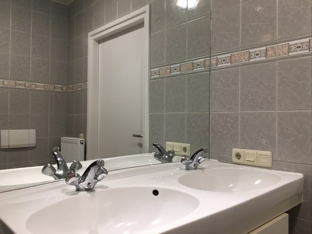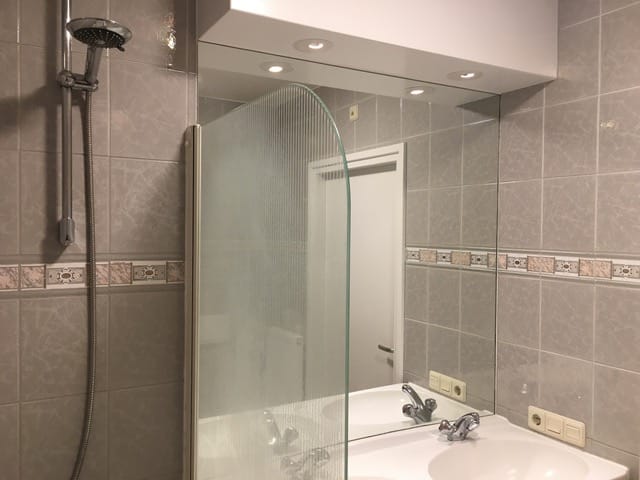shower-bath combination and sink with bathroom furniture. One door further you enter the