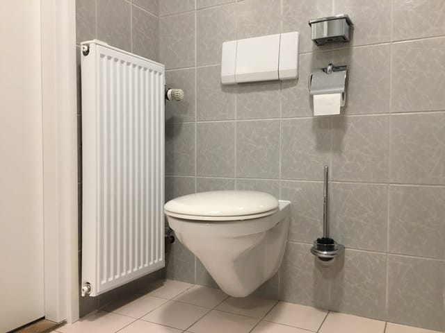 douche- bad combinatie en dubbele wasbak met badkamermeubel. Een deur verder betreed u de