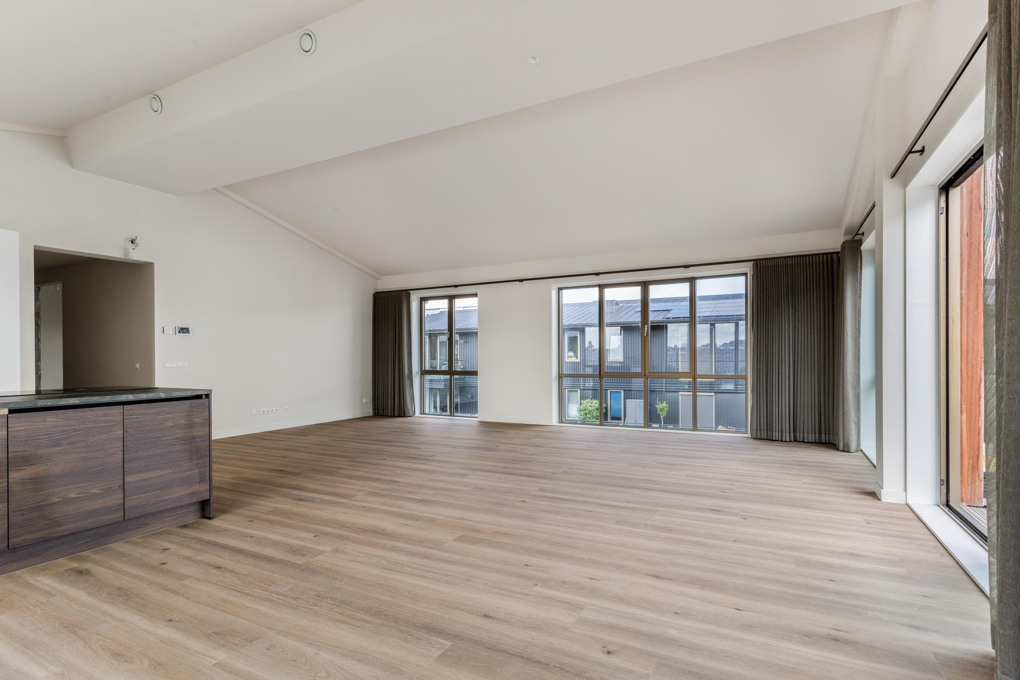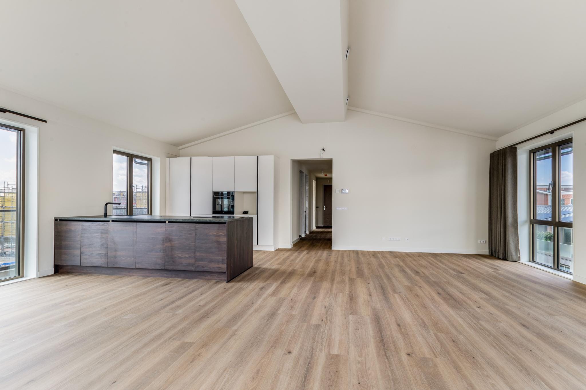 De woonkamer heeft een indrukwekkend hoog plafond dat het gevoel van ruimte versterkt. Met aan drie zijden vrij uitzicht over de stad én een aansluitend balkon van maar liefst ca. 27 m², waar u tot in de late uurtjes kunt genieten van de zon en het water. De open keuken is volledig uitgerust met een kookeiland en alle bijbehorende gemakken. Tevens is er ruimte voor een koffiebar en vormt dit het kloppend hart van de woning — ideaal voor wie van koken én gezelligheid houdt.