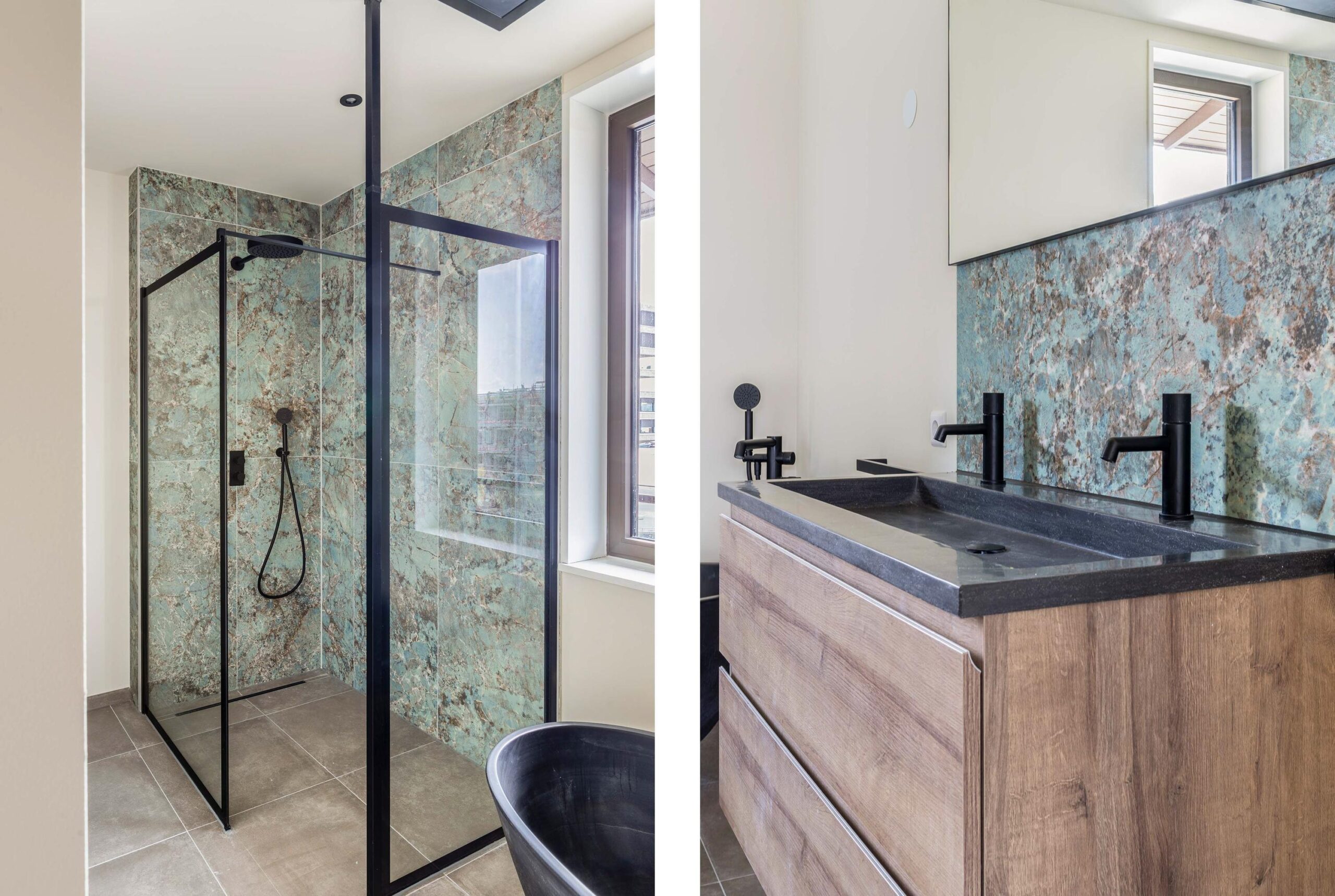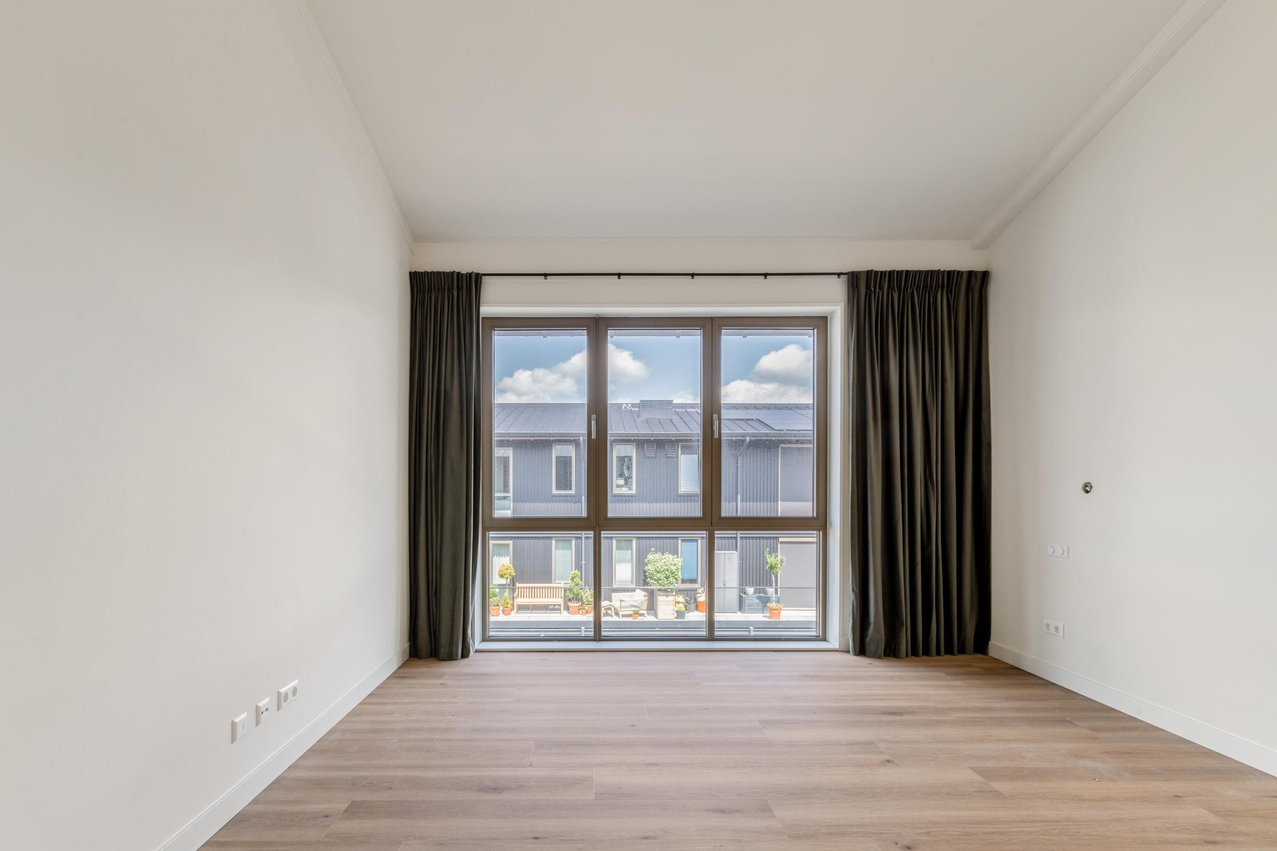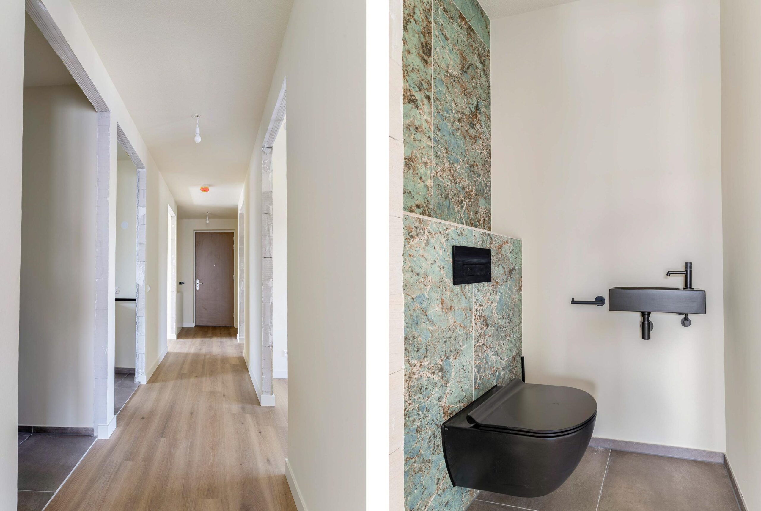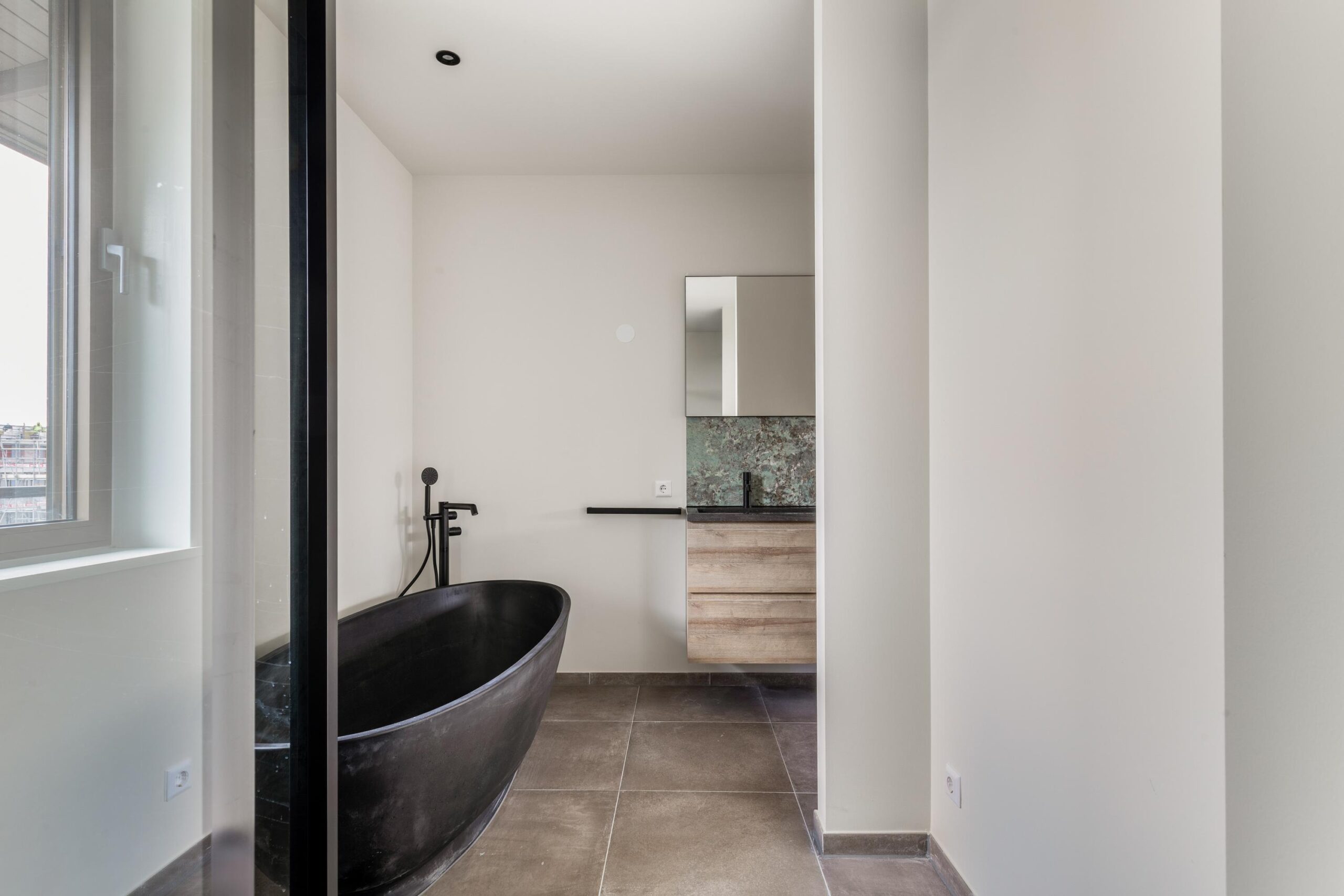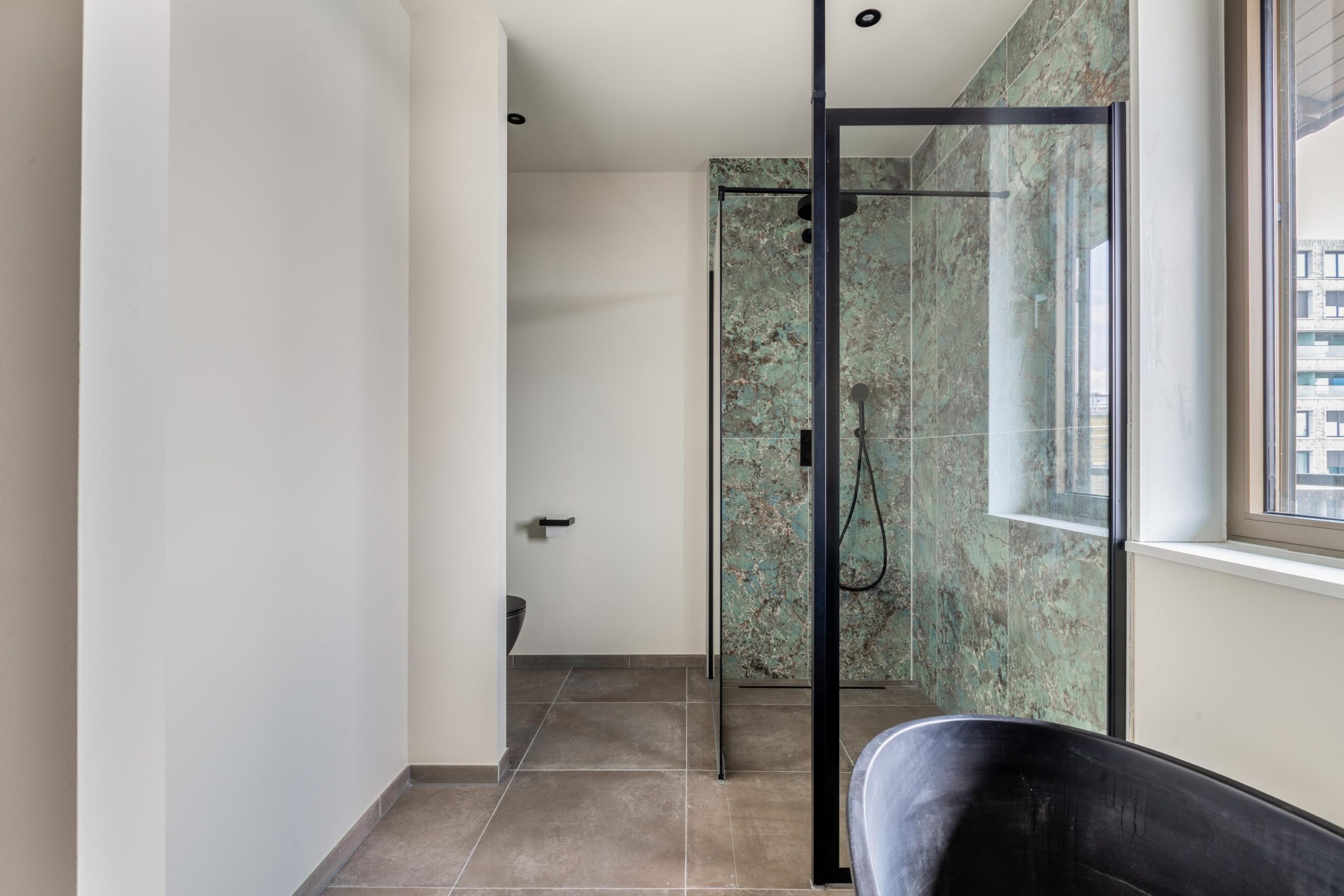 You can reach this luxurious apartment on the third floor by elevator or stairs. What immediately stands out? The light, the space — and the view! Upon entering, you’ll find three bedrooms. Thanks to the high ceilings and large windows, they feel bright and spacious. The modern bathroom features a walk-in shower, toilet, freestanding bathtub, and a double sink with mixer taps. Off the hallway, there’s also a separate guest toilet with a small sink and a utility room with space for a washer and dryer.