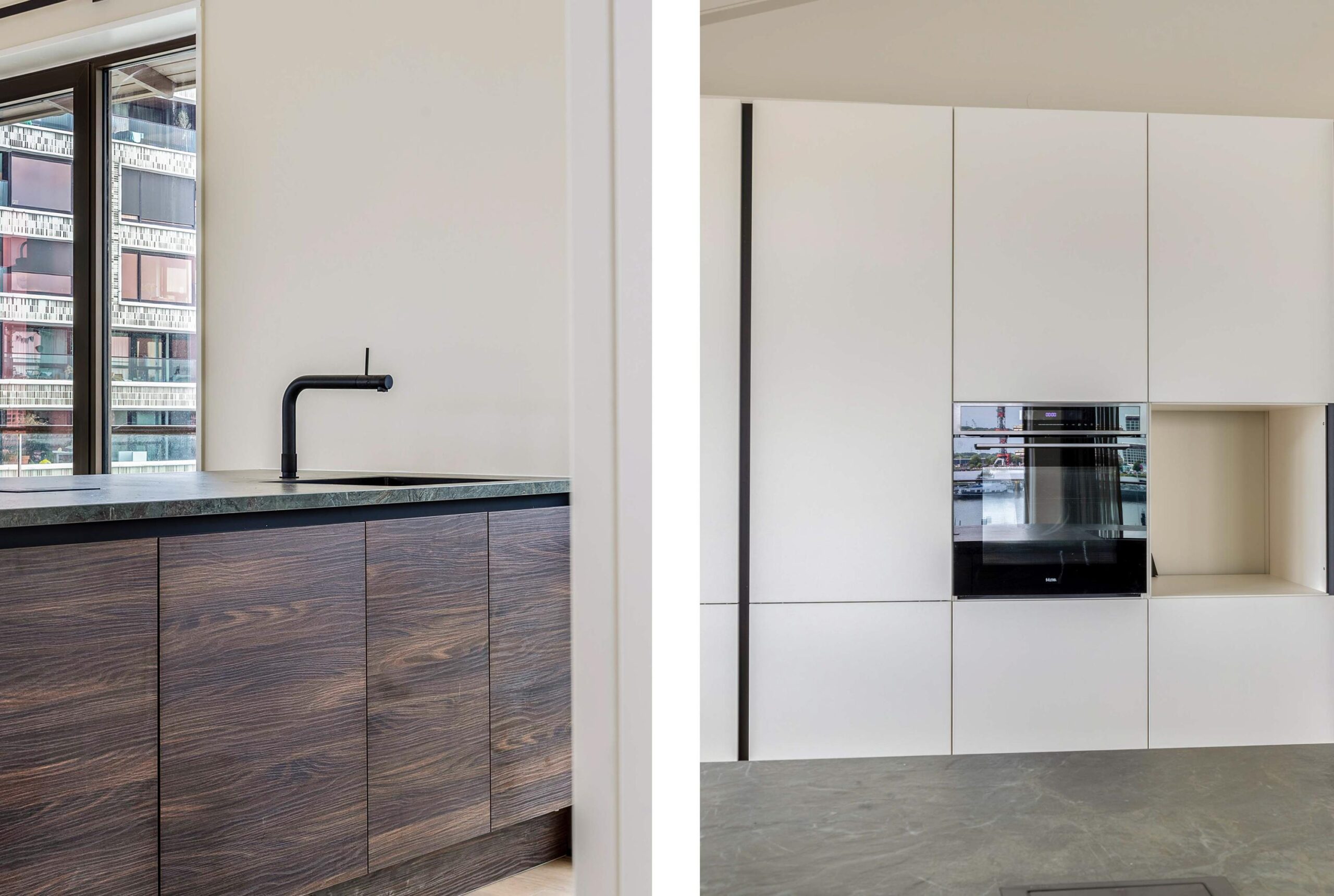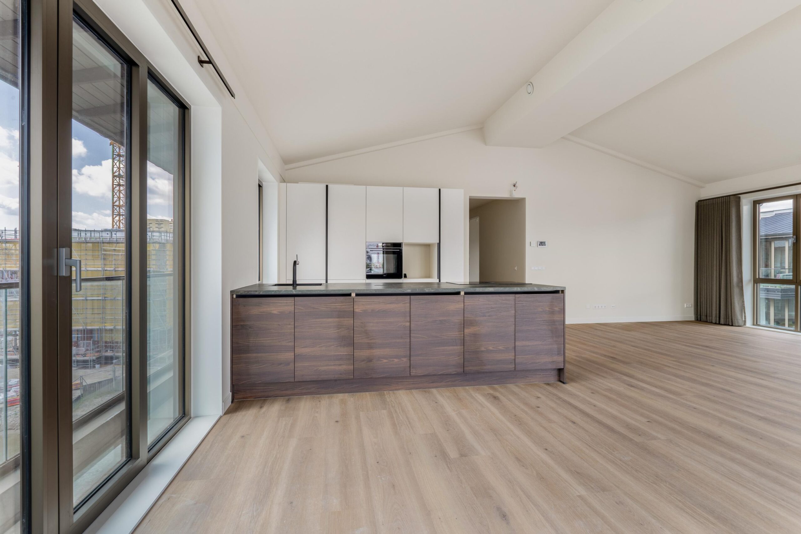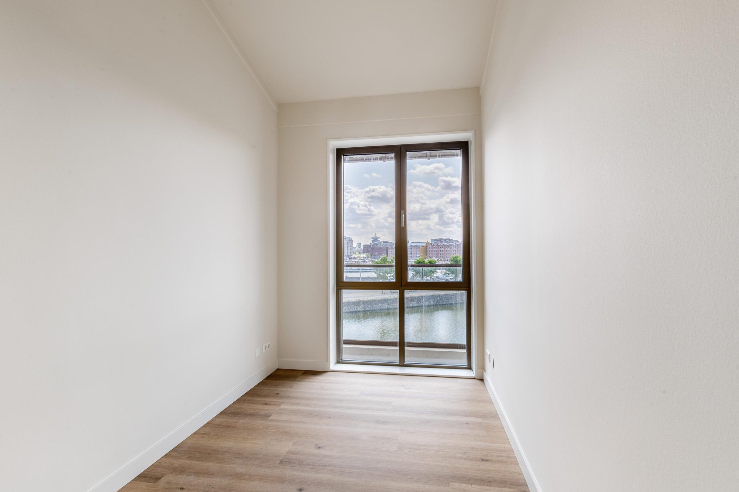The living room boasts impressively high ceilings, enhancing the sense of space. On three sides, you have unobstructed views of the city — and a connected balcony of approximately 27 m², where you can enjoy the sun and water until late in the evening. The open-plan kitchen is fully equipped with a cooking island and all the conveniences you’d expect. There’s even room for a coffee bar, making it the beating heart of the home — perfect for cooking enthusiasts and entertainers alike.