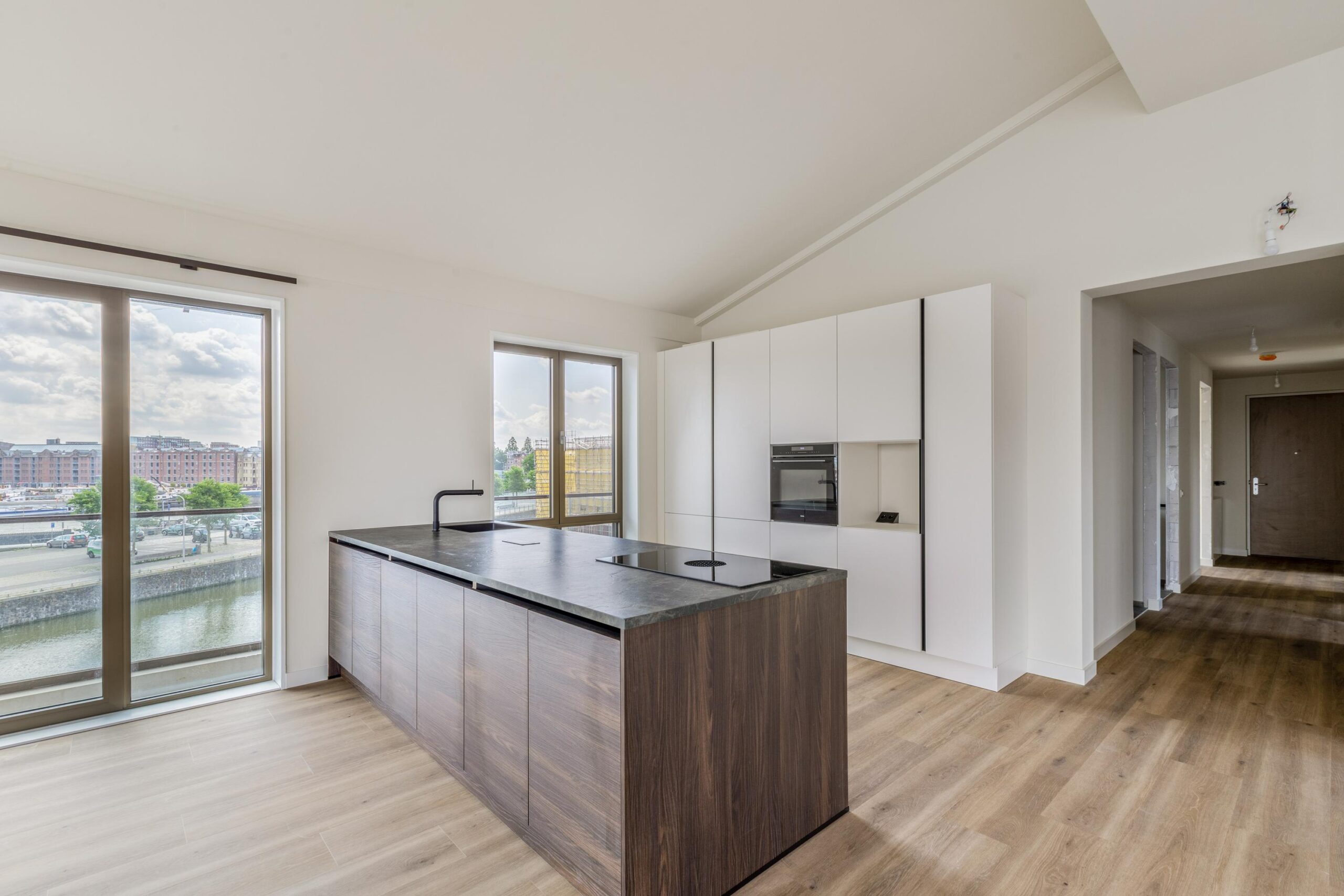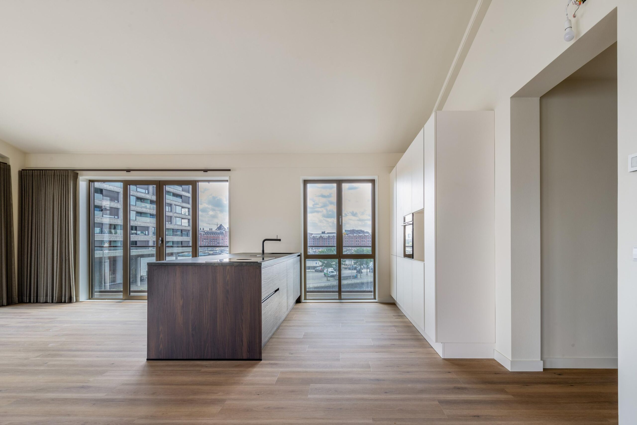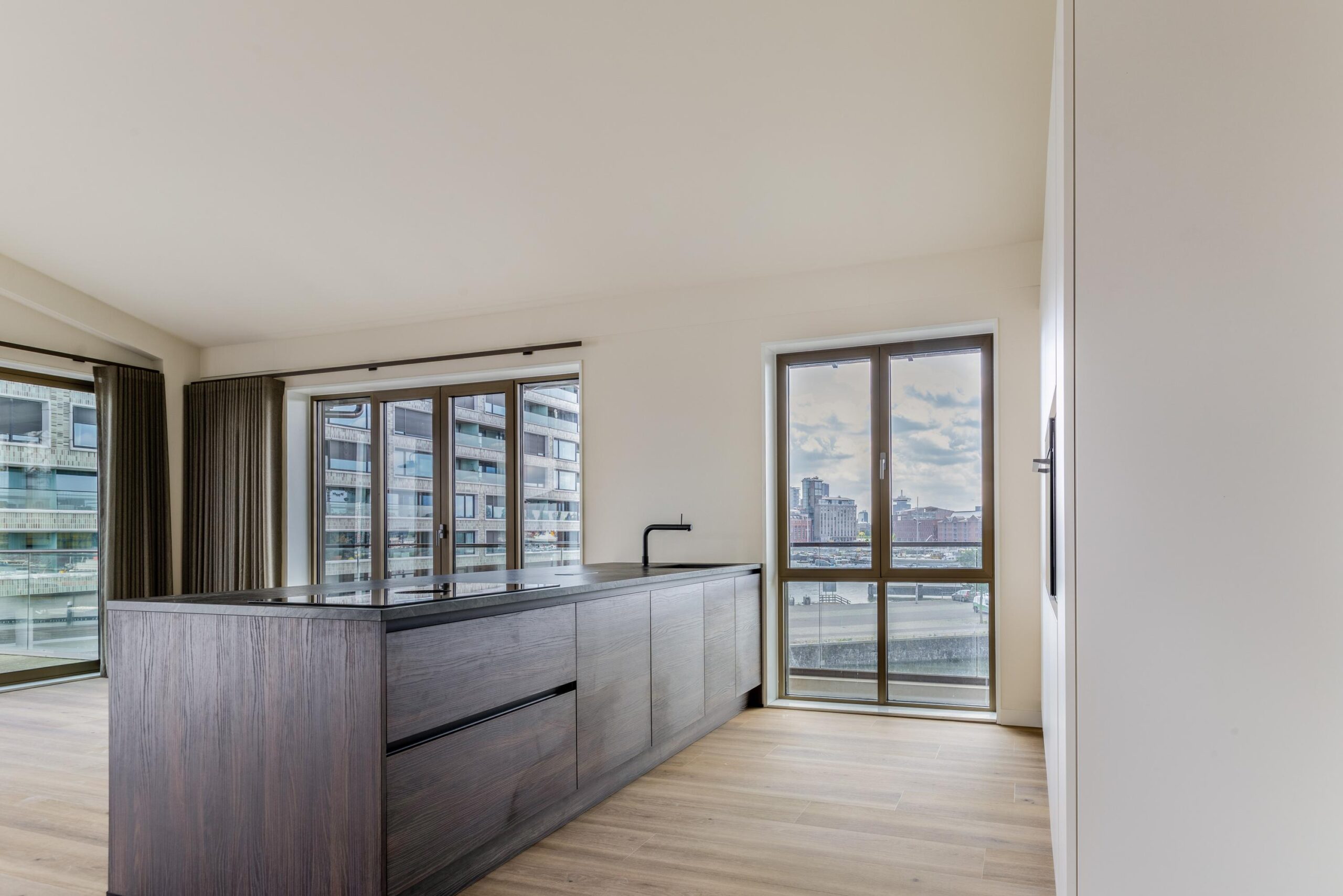 De woonkamer heeft een indrukwekkend hoog plafond dat het gevoel van ruimte versterkt. Met aan drie zijden vrij uitzicht over de stad én een aansluitend balkon van maar liefst ca. 27 m², waar u tot in de late uurtjes kunt genieten van de zon en het water. De open keuken is volledig uitgerust met een kookeiland en alle bijbehorende gemakken. Tevens is er ruimte voor een koffiebar en vormt dit het kloppend hart van de woning — ideaal voor wie van koken én gezelligheid houdt.