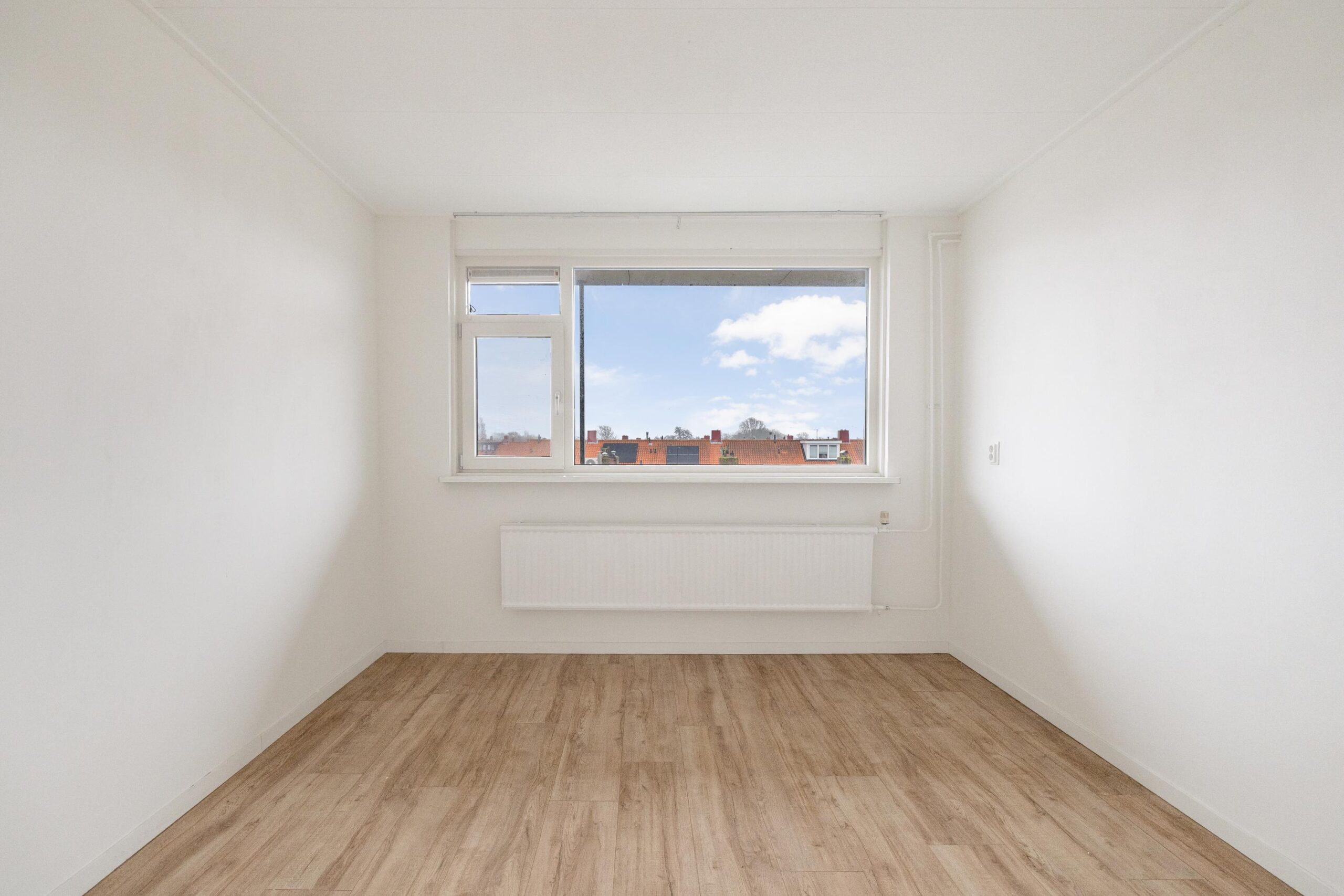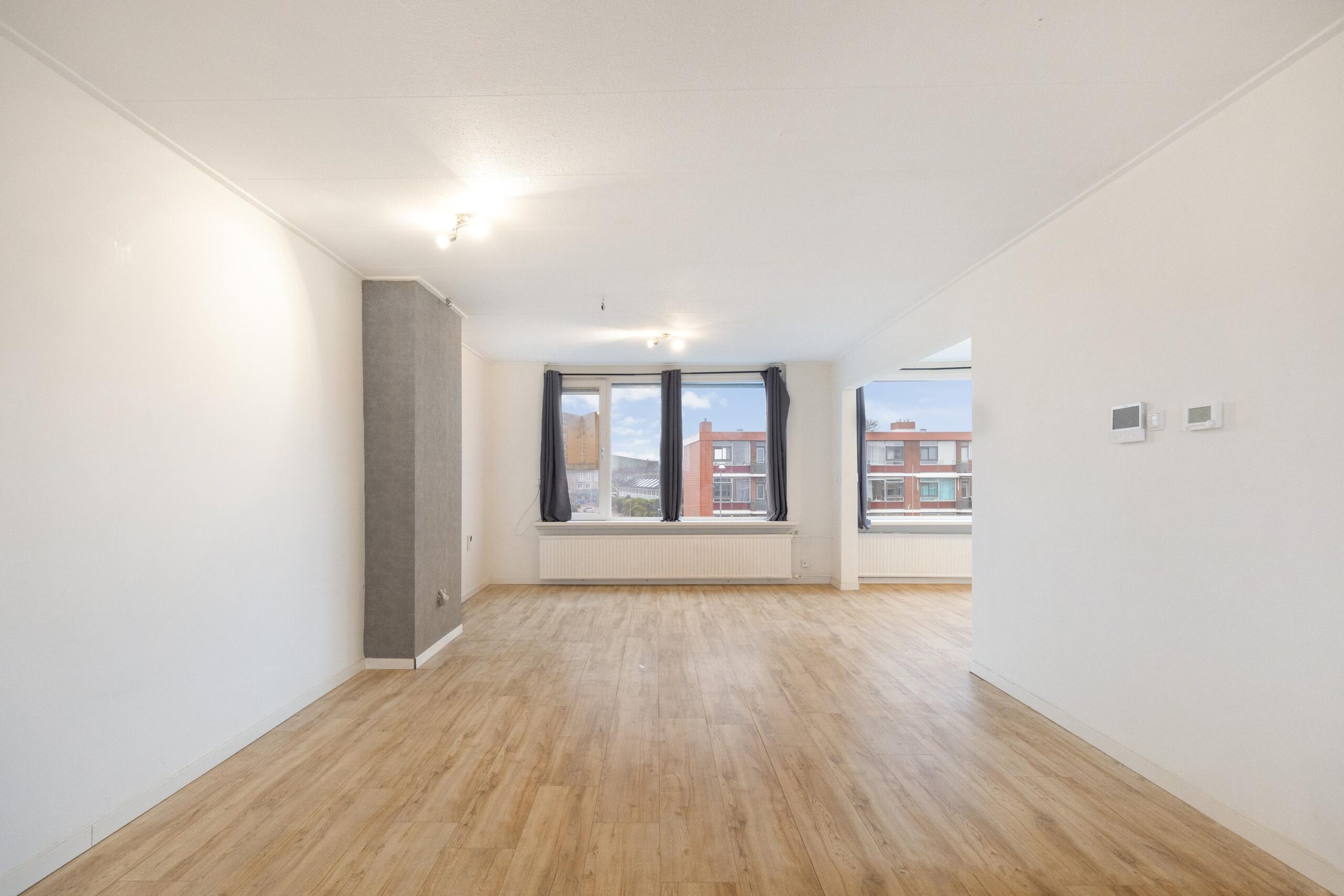 De ruime L-vormige woonkamer is strak en door de twee grote ramen bijzonder licht te noemen. Hier bevindt zich ook een van de twee toegangen tot het balkon. De keuken is prettig ingericht met veel werkruimte en voorzien van vaatwasser, 5pits gasfornuis met afzuigkap en oven. De twee slaapkamers zijn ruim en bieden meer dan genoeg plek aan een tweepersoonsbed en daarbij een kledingkast. De achterste slaapkamer heeft de tweede toegangsdeur naar het balkon.