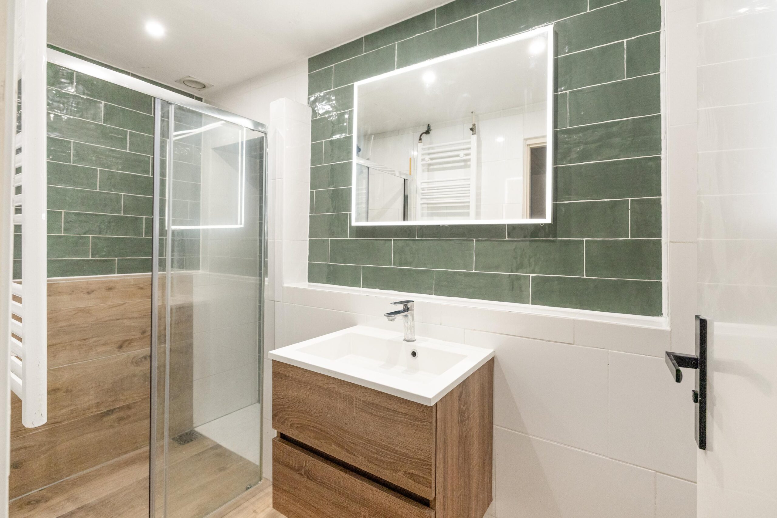 The adjacent bathroom is also modern and features a neat vanity, a walk-in shower, and a towel radiator. Several alcoves have been created here, providing ample space for all your beauty products.