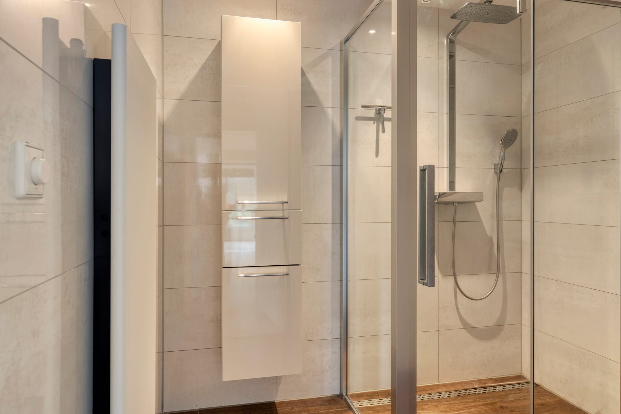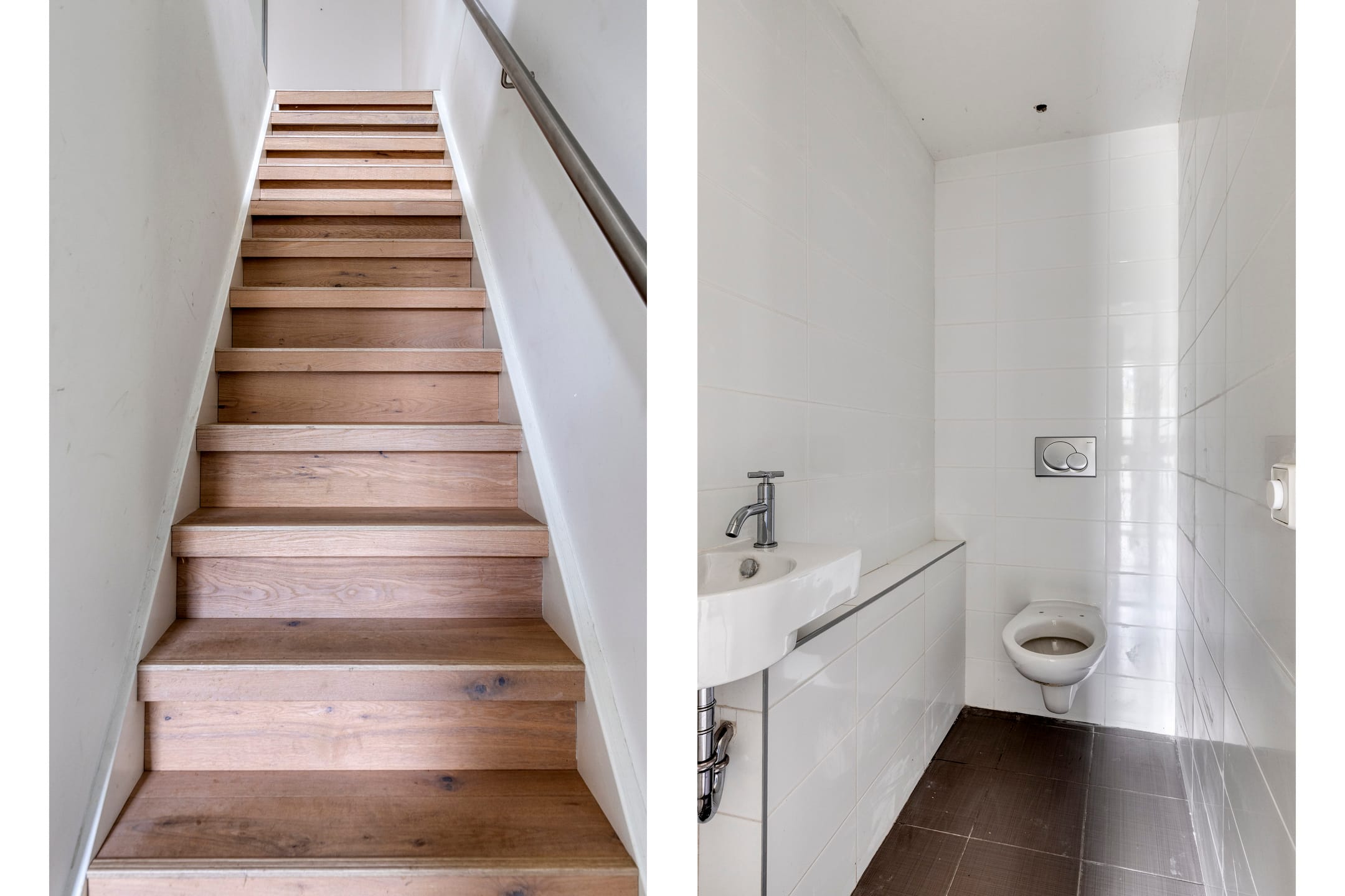Upstairs, the landing gives access to a second separate toilet, a storage cupboard housing the central heating combi boiler and mechanical ventilation system, and the bathroom. The bathroom is neatly finished and fully equipped with a spacious walk-in shower and vanity unit. At the front, there are two generous bedrooms. The large living room is located at the rear and is wonderfully bright thanks to large windows. It is playfully divided into a sitting and dining area, offering unobstructed views of the canal and park.