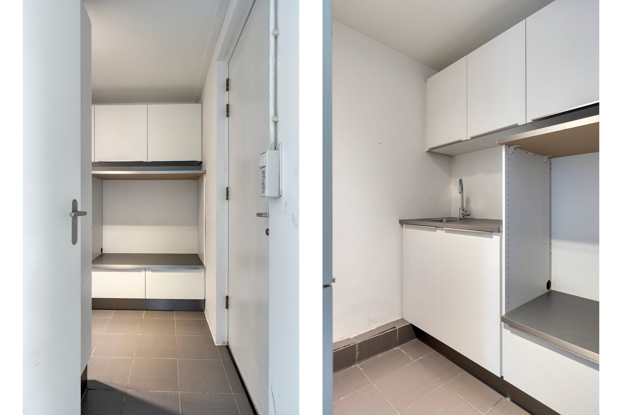 You enter via the east-facing terrace garden – a lovely spot for breakfast or a morning coffee in the sunshine. Inside, a neat hallway welcomes you with a staircase, separate toilet, and a convenient storage cupboard under the stairs. The spacious kitchen-diner has been fully modernised and features a luxurious kitchen island with high-quality built-in appliances, including a 5-burner hob with wok burner and integrated extractor, double combi oven, fridge, dishwasher, and – for wine lovers – a generous wine climate cabinet. The layout is practical, with plenty of room for a large dining table. Adjacent to the kitchen is the utility room, fitted with a back door and its own sink unit. This space is so generous that it can also be used as a bike storage room, pantry, or hobby space. The entire ground floor is beautifully finished with ceramic wood-look floor tiles.
