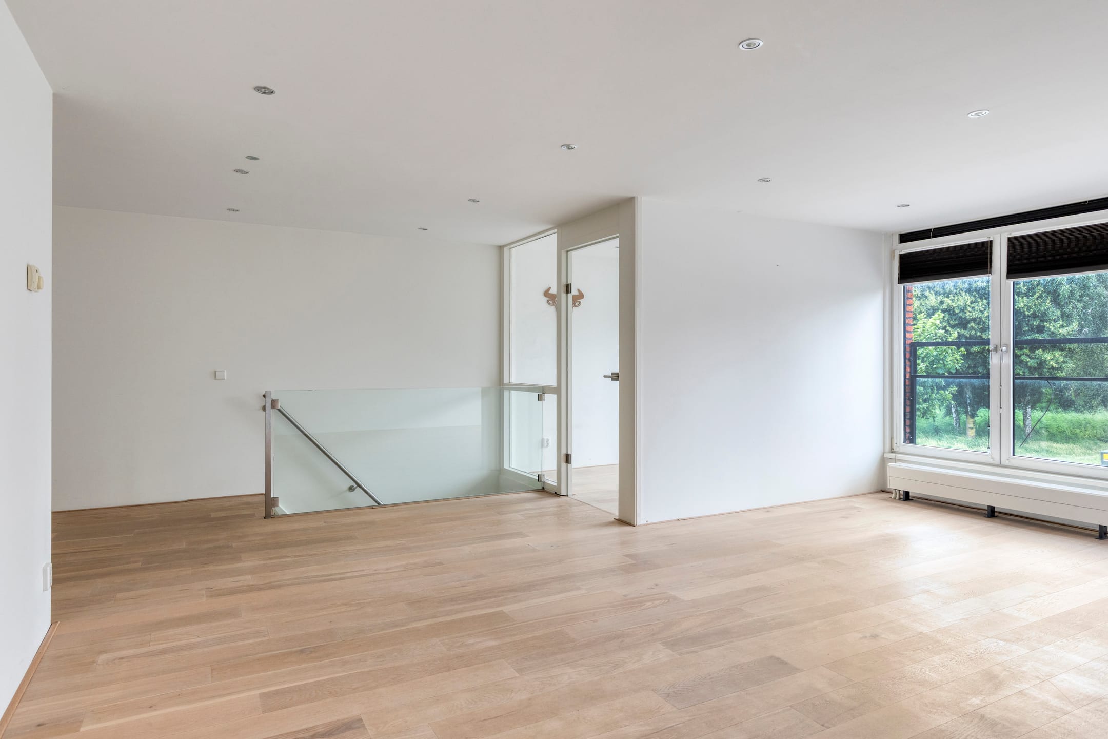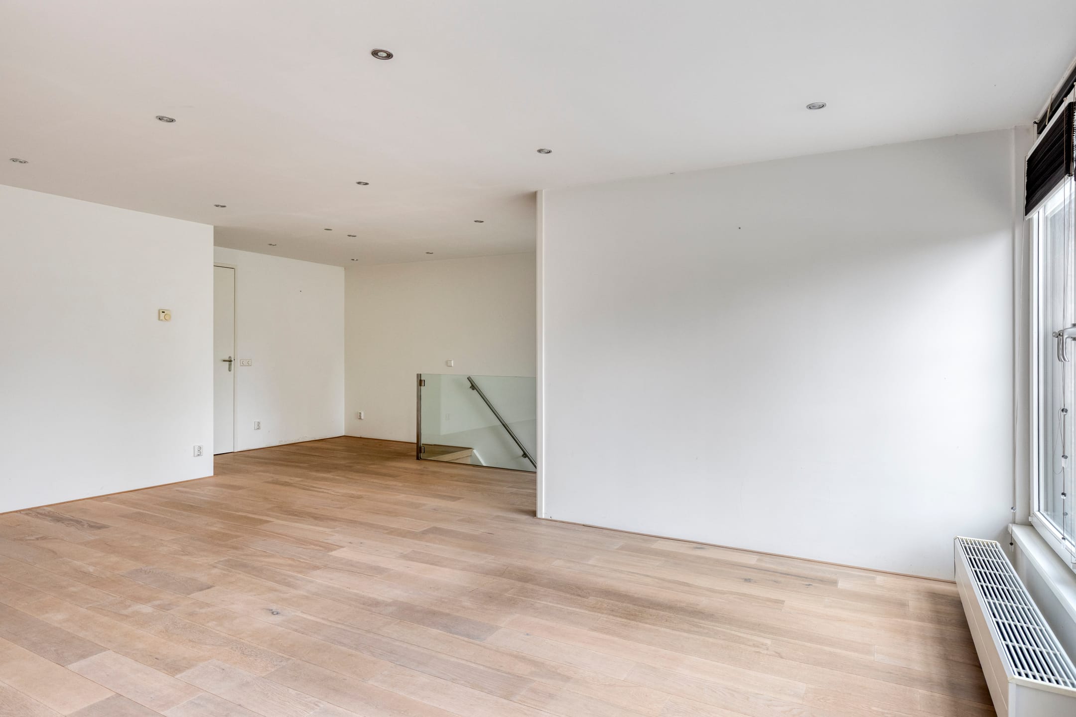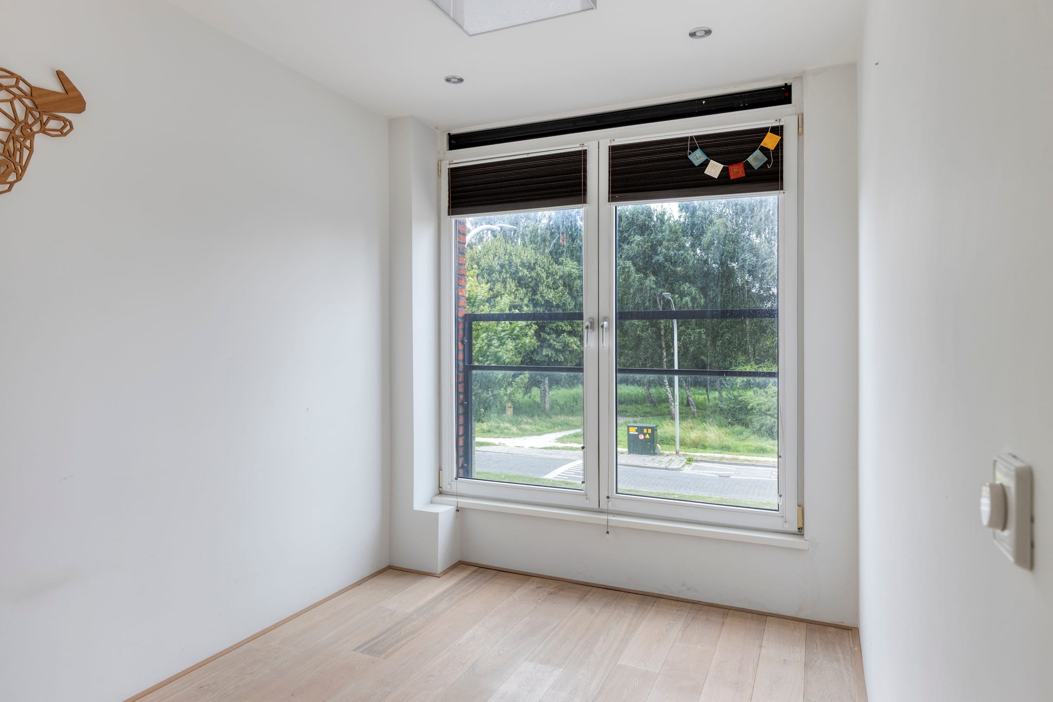 Boven kom je uit op een overloop met toegang tot het tweede separate toilet, een bergkast met de cv-combiketel en centrale afzuiginstallatie, én de badkamer. Die is netjes en compleet ingericht met een ruime inloopdouche en wastafelmeubel. Aan de voorzijde bevinden zich twee ruime slaapkamers. De royale woonkamer ligt aan de achterzijde en is heerlijk licht dankzij grote raampartijen. De kamer is speels ingedeeld in een zit- en eetgedeelte en biedt vrij uitzicht op de singel en het park. De voormalige loggia is slim dichtgemaakt en doet nu dienst als extra slaap-, werk- of studeerkamer (ca. 6 m²). Ook deze verdieping is voorzien van een mooie houten vloer.