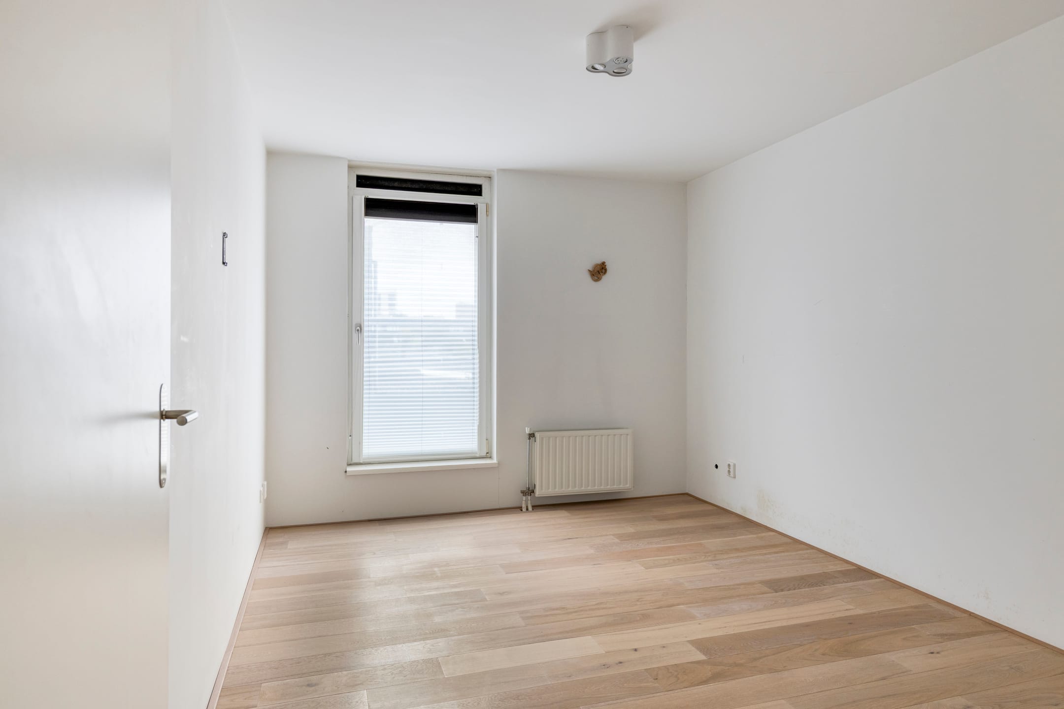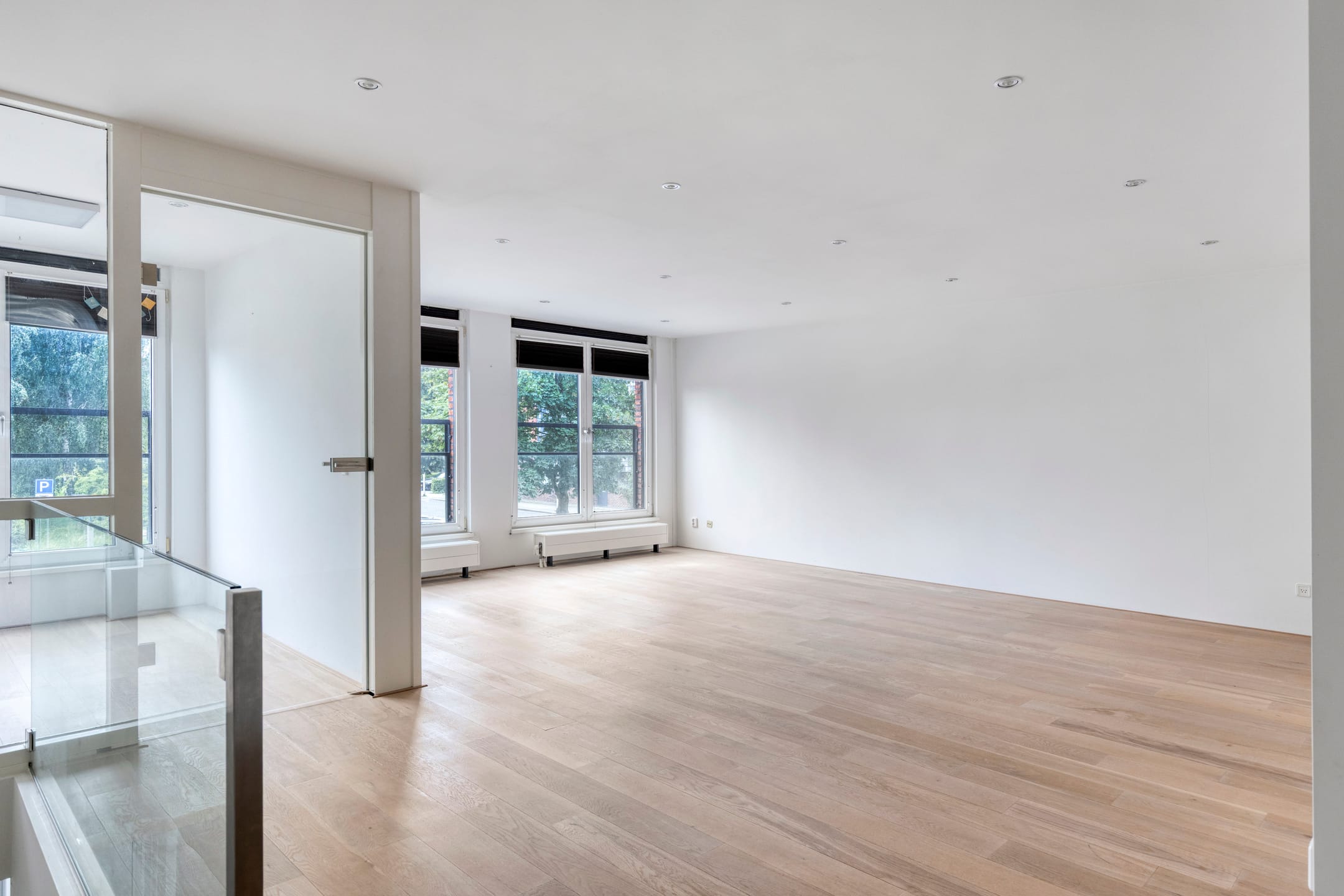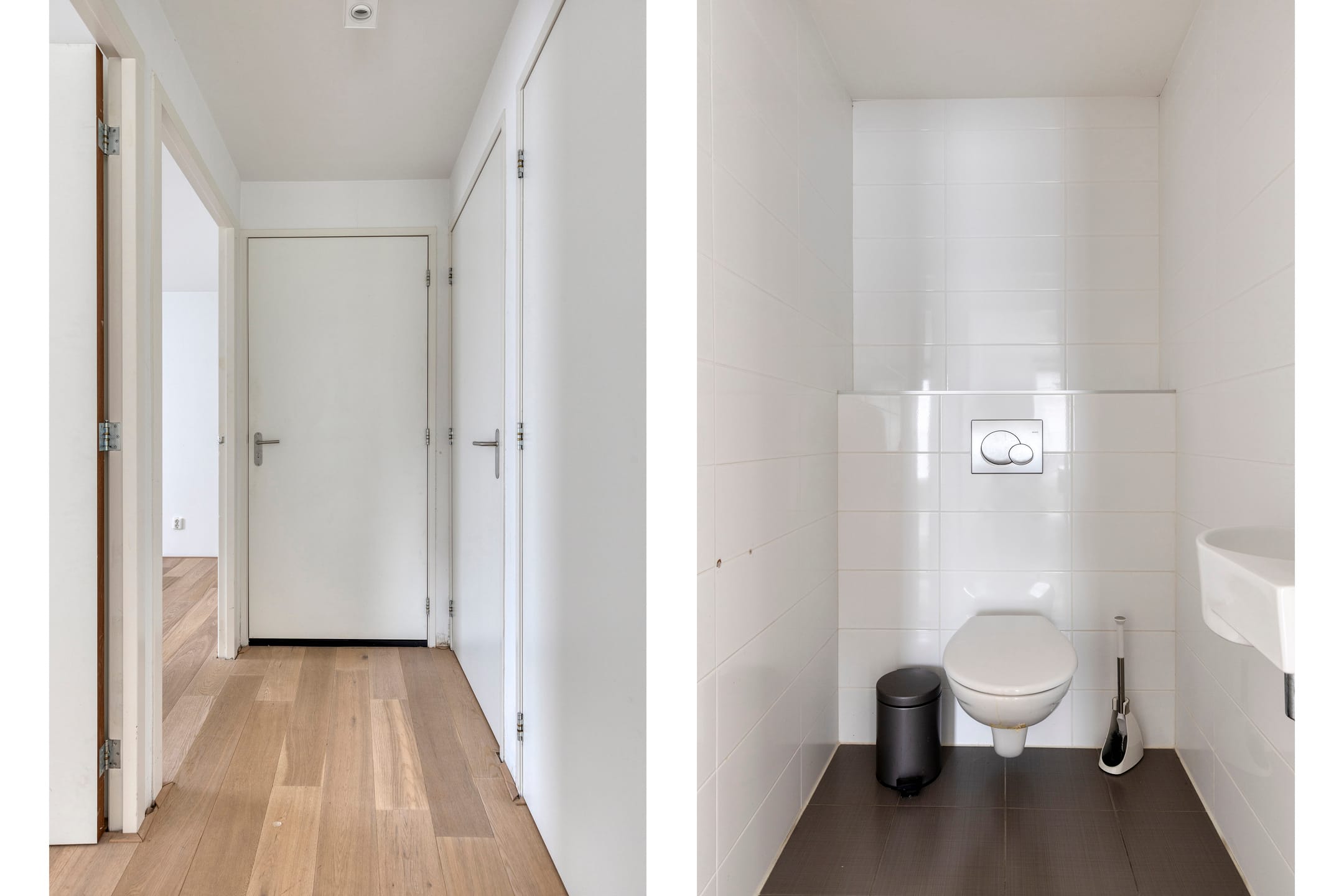 Boven kom je uit op een overloop met toegang tot het tweede separate toilet, een bergkast met de cv-combiketel en centrale afzuiginstallatie, én de badkamer. Die is netjes en compleet ingericht met een ruime inloopdouche en wastafelmeubel. Aan de voorzijde bevinden zich twee ruime slaapkamers. De royale woonkamer ligt aan de achterzijde en is heerlijk licht dankzij grote raampartijen. De kamer is speels ingedeeld in een zit- en eetgedeelte en biedt vrij uitzicht op de singel en het park. De voormalige loggia is slim dichtgemaakt en doet nu dienst als extra slaap-, werk- of studeerkamer (ca. 6 m²). Ook deze verdieping is voorzien van een mooie houten vloer.