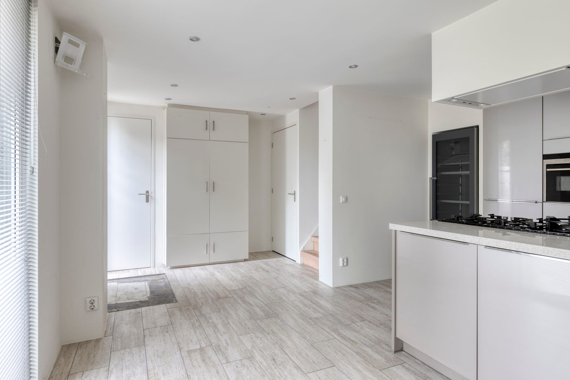 Je komt binnen via de terrastuin op het oosten – een fijne plek voor een ontbijtje of koffietje in de ochtendzon. Achter de voordeur vind je een nette hal met trapopgang, apart toilet en een handige trapkast. De ruime woonkeuken is volledig gemoderniseerd en uitgerust met een luxe kookeiland met hoogwaardige inbouwapparatuur, waaronder een 5-pits kookplaat inclusief wokbrander met geïntegreerde afzuiging, dubbele combimagnetron, koelkast en vaatwasser, en voor de liefhebber een royale wijnklimaatkast. Deze ruimte is verder praktisch ingericht en biedt voldoende plek voor een grote eettafel. Grenzend aan de keuken ligt de bijkeuken, die voorzien is van een achterdeur en een eigen spoelcomponent. Deze ruimte is zó ruim dat je ’m ook perfect kunt gebruiken als fietsenberging, voorraadruimte of hobbykamer. De gehele begane grond is fraai afgewerkt met mooie keramische tegels in houtlook.