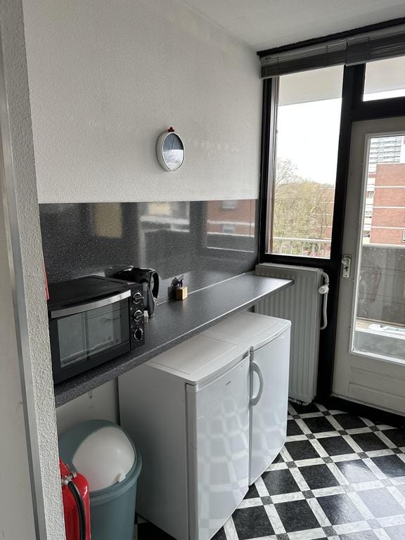 Entrance apartment on the fourth floor, central hall which provides access to one of the three bedrooms. From the hall access to the cozy living room with lots of light and a spacious west-facing balcony. The kitchen is equipped with a ceramic hob, extractor hood, microwave, fridge freezer, dishwasher and washing machine. A second cupboard wall with a worktop provides sufficient work space. Separate toilet with a hanging closet, built-in cistern and a fountain. The bathroom has a jacuzzi with shower facilities, a wide washbasin and a towel radiator. The master bedroom is located on the side wall with access to a balcony, followed by another bedroom where the space and the light immediately stand out, and as if that were not enough, a third bedroom. In short, spacious living in a very centrally located location in bustling The Hague.