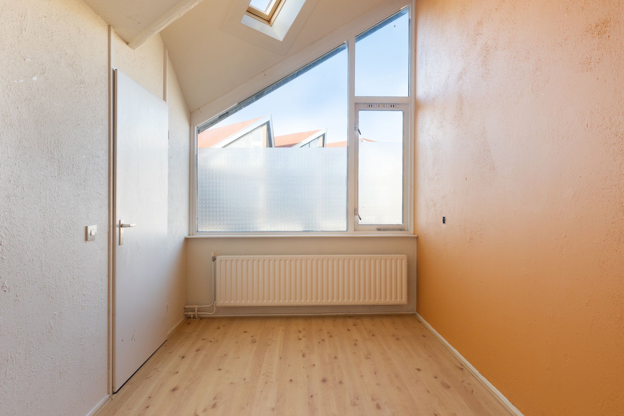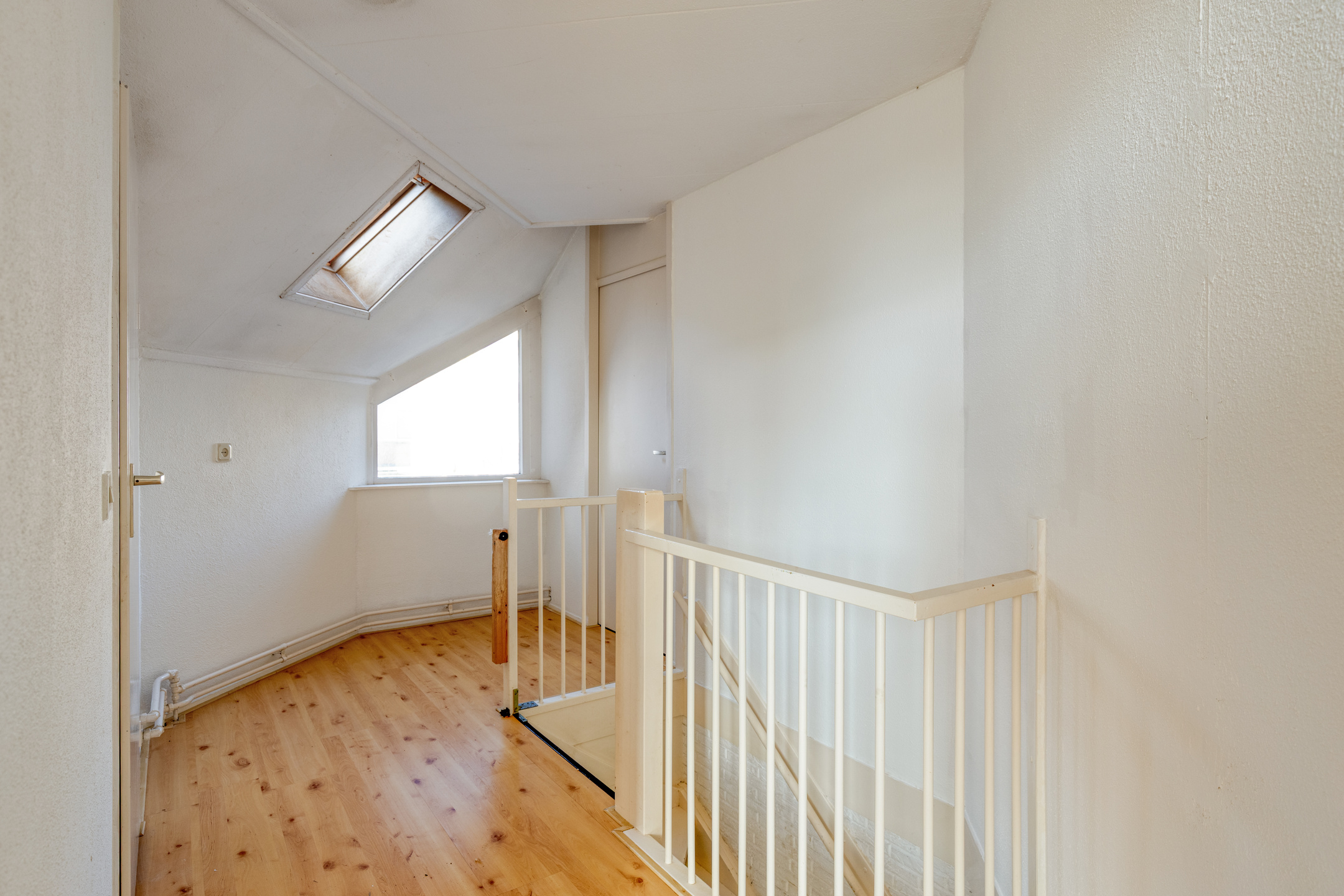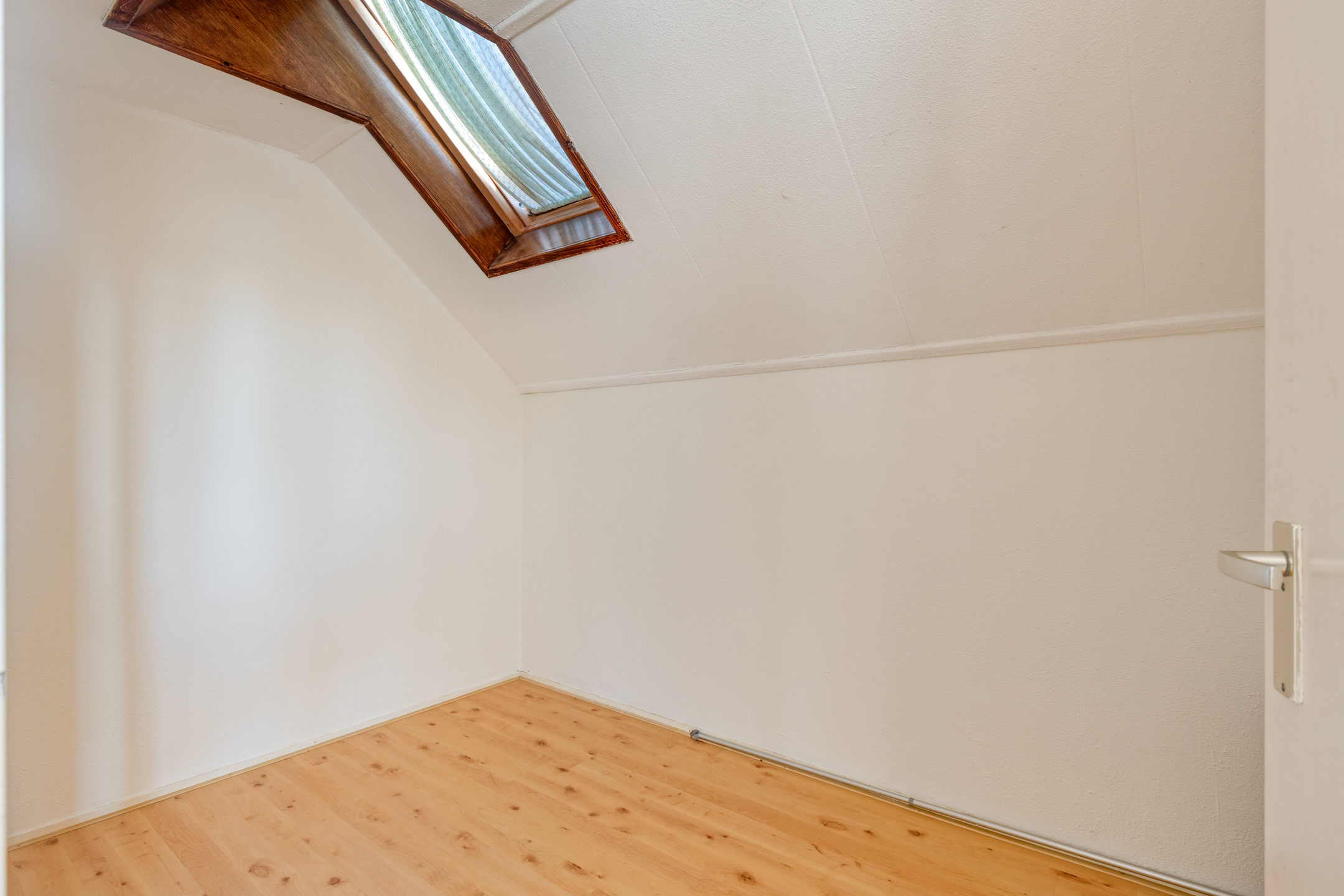 De badkamer is basic uitgevoerd en toe aan vernieuwing. Het aanwezige dakraam brengt veel daglicht binnen en maakt het eenvoudig om hier een frisse, comfortabele gezinsbadkamer te creëren, bijvoorbeeld met een inloopdouche, dubbele wastafel en extra kastruimte.