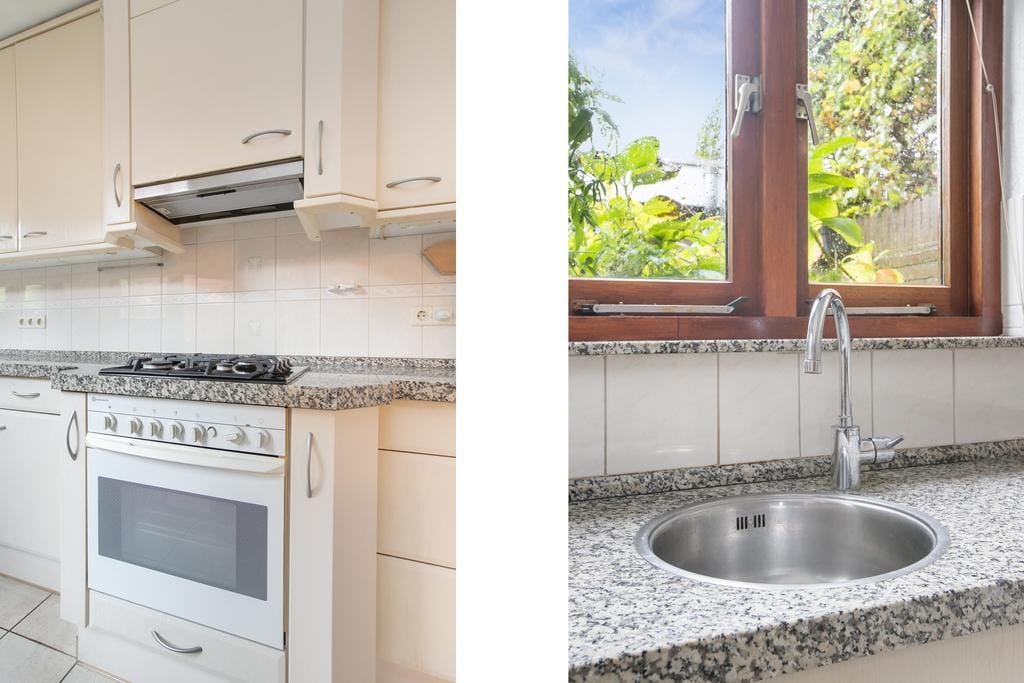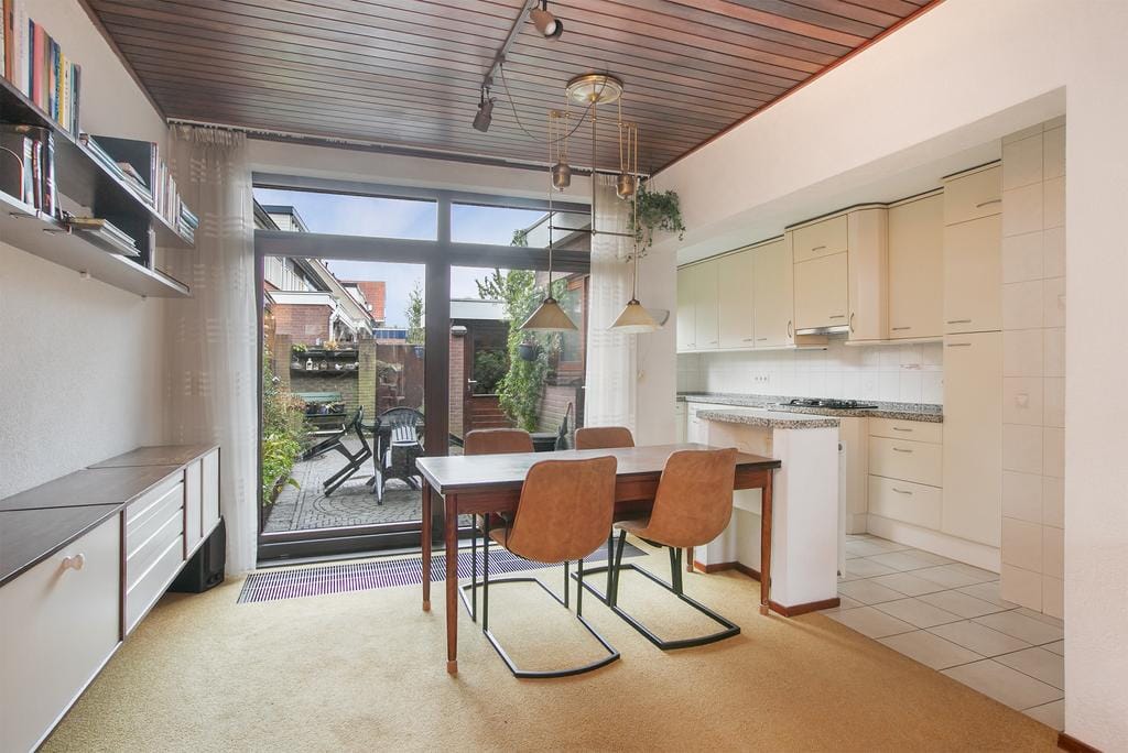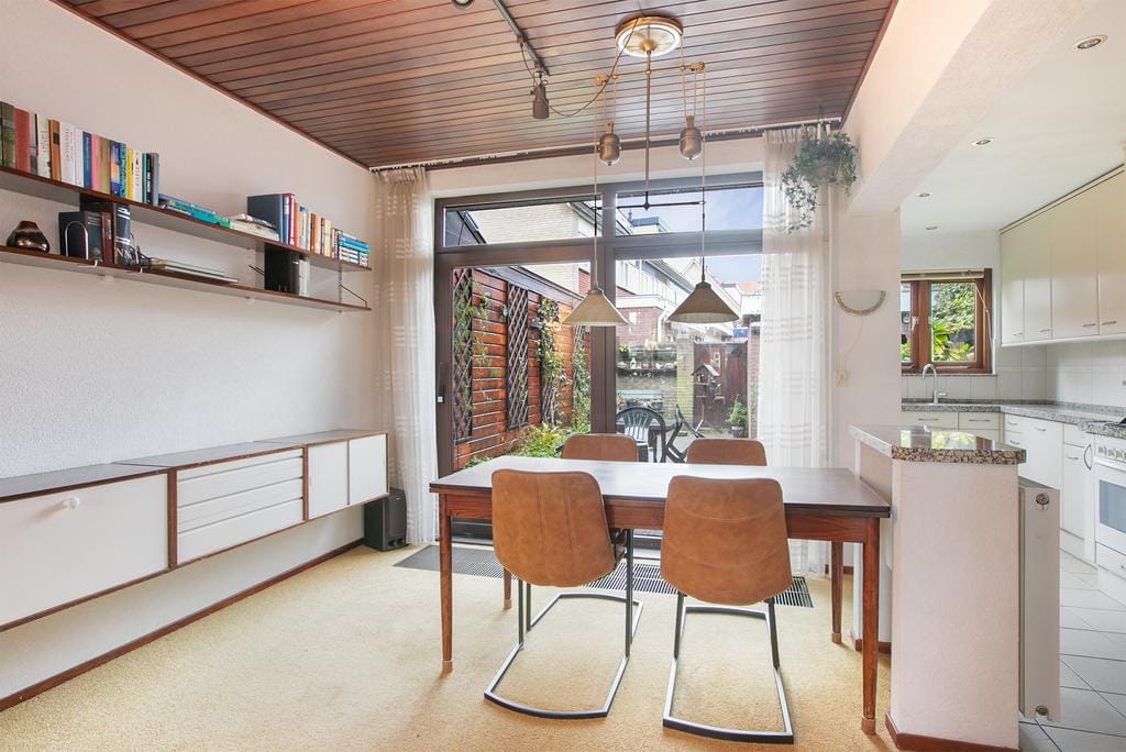 On the outside of the house, the characteristic features of the much-loved 1930s style are immediately noticeable. Through the graceful round arched door you enter the spacious hall with the stairs with built-in storage space and separate toilet on the right. At the end of the hall the door leads to the extensive kitchen. The natural light from the window at the rear gives this entry an open and rich appearance. The kitchen is equipped with an oven, four-burner gas stove, built-in extractor hood, sink with mixer tap and extensive storage and workspace. The kitchen even offers space for an extra kitchen island, transitioning to the living room. Here you immediately notice the large windows in the sliding doors to the garden. Because it is located on the Southeast, you can enjoy the sun all day long and the house is naturally illuminated. The front of the house has a charming bay window, a typical feature of the 1930s construction. Here you can sit comfortably on a Sunday morning with a hot cup of coffee and a good book. The gas fireplace, centrally located in the living room, gives this room a warm and homely appearance. On a cold winter evening you can sit here with friends, family and a good glass of wine!