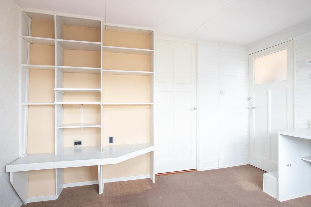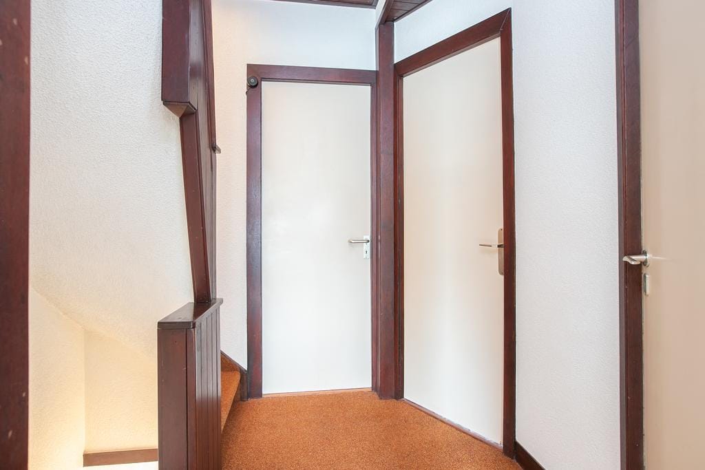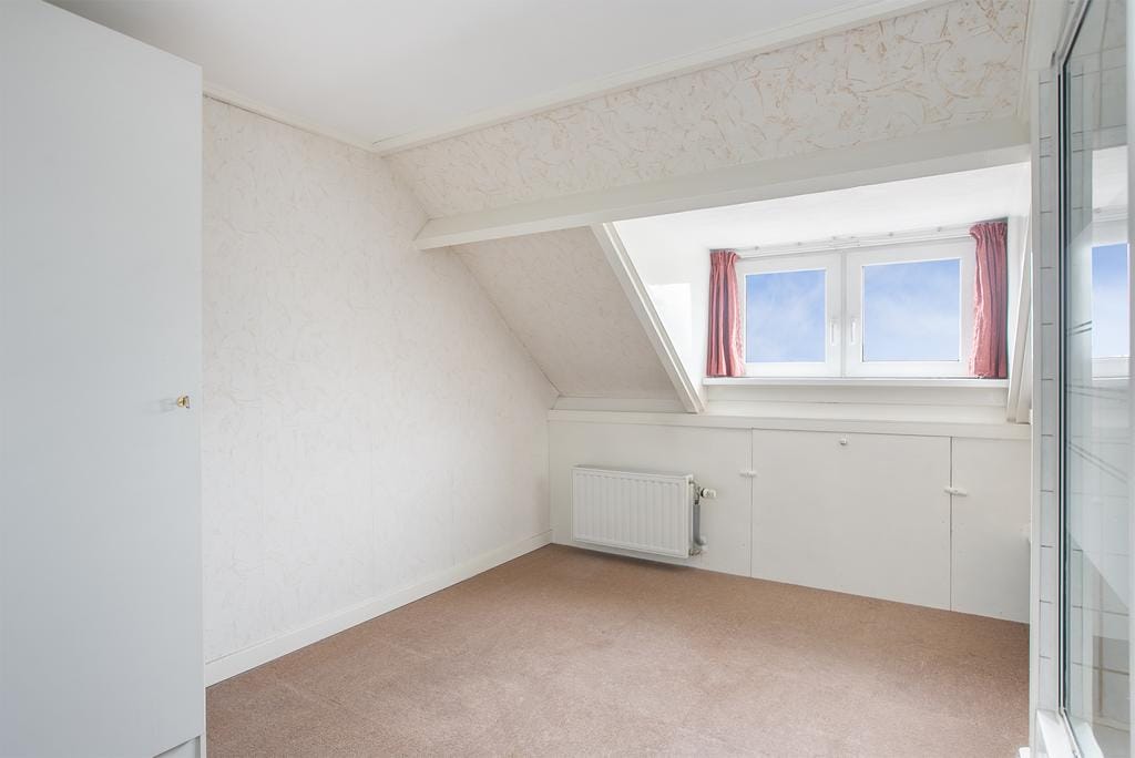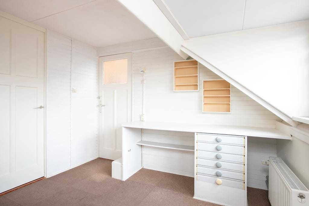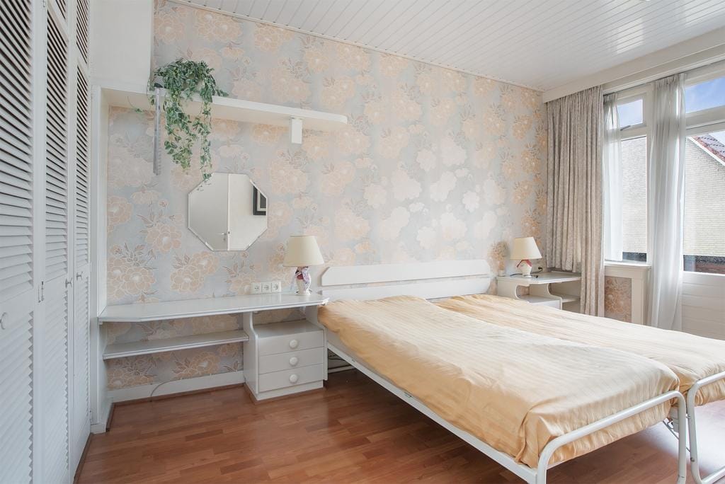 You enter the first floor of the house via the stairs in the hall. The bathroom is located on the right side of the landing. This is equipped with a spacious sink, toilet, shower and heating that is suitable for drying towels. The large window has frosted glass, so there is no view, but a lot of natural light is let in. Next to the bathroom is the first and largest bedroom. The size of the room provides enough space for a king-size bed, dressing table and dresser. The French doors, with access to the balcony, give the room a luxurious and spacious appearance. The large built-in cupboards provide plenty of space for all the necessary clothing and linen.The second bedroom is at the front of the house. Just like the living room, this has an attractive and cozy bay window. The room also has a built-in wardrobe and offers enough space for a large double bed and desk. The smallest bedroom of the house is located on the other side of the front of the house. This is ideal for use as an office space. For starting families, this is the perfect space for a cozy nursery.