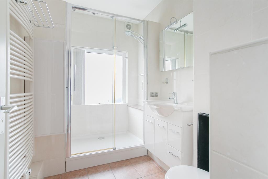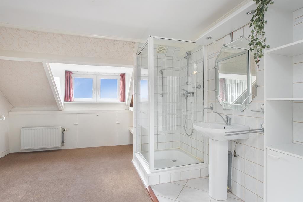 On the second floor you first enter the front attic. The central heating boiler is located here. The skylight provides this space with sufficient light and makes it possible to create your own workshop or extra office space. The door on the landing gives access to the fourth bedroom of the house. Due to the passage to a second bathroom of the house, this is a luxurious ‘en suite’. However, it is also possible to create a second door from the landing. A fifth bedroom with private shower facilities has then been created. Ideal for a large family!
