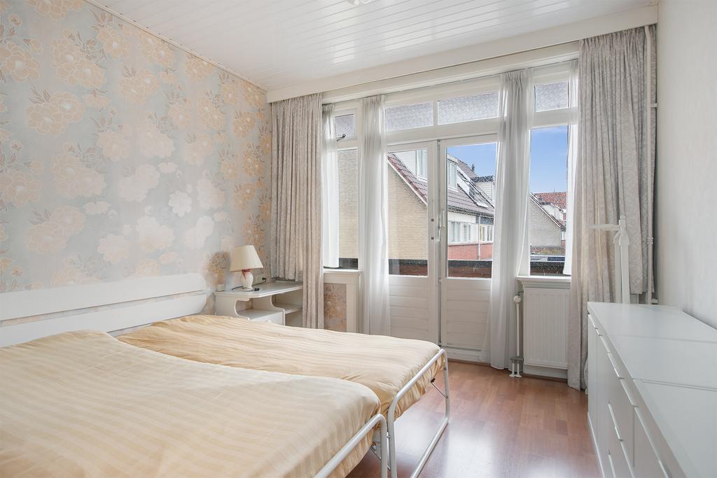 Via de trap in de hal betreed je de eerste verdieping van de woning. Aan de rechterzijde van de overloop is de badkamer gelegen. Deze is voorzien van een ruime wastafel, toilet, douche en verwarming die geschikt is voor het drogen van handdoeken. Het grote raam is voorzien van melkglas, waardoor er geen sprake is van inkijk, maar er wel veel natuurlijk licht wordt binnengelaten. Naast de badkamer is de eerste en tevens grootste slaapkamer te vinden. Door de afmeting van de kamer is er genoeg plaats voor een kingsize bed, kaptafel en dressoir. De openslaande deuren, met toegang tot het balkon, geven de kamer een welgestelde en riante uitstraling. De grote ingebouwde kasten bieden voldoende ruimte voor al het benodigde ?kleding en linnengoed. Aan de voorzijde van de woning is de tweede slaapkamer. Deze heeft net als de woonkamer een sfeervolle en knusse erker. De kamer is tevens voorzien van een inbouwkast en biedt voldoende ruimte voor een groot tweepersoonsbed en bureau. De kleinste slaapkamer van de woning is aan de andere kant van de voorzijde van de woning te vinden. Deze is ideaal in te delen als kantoorruimte. Voor startende gezinnen is dit de perfecte ruimte voor een knusse babykamer.