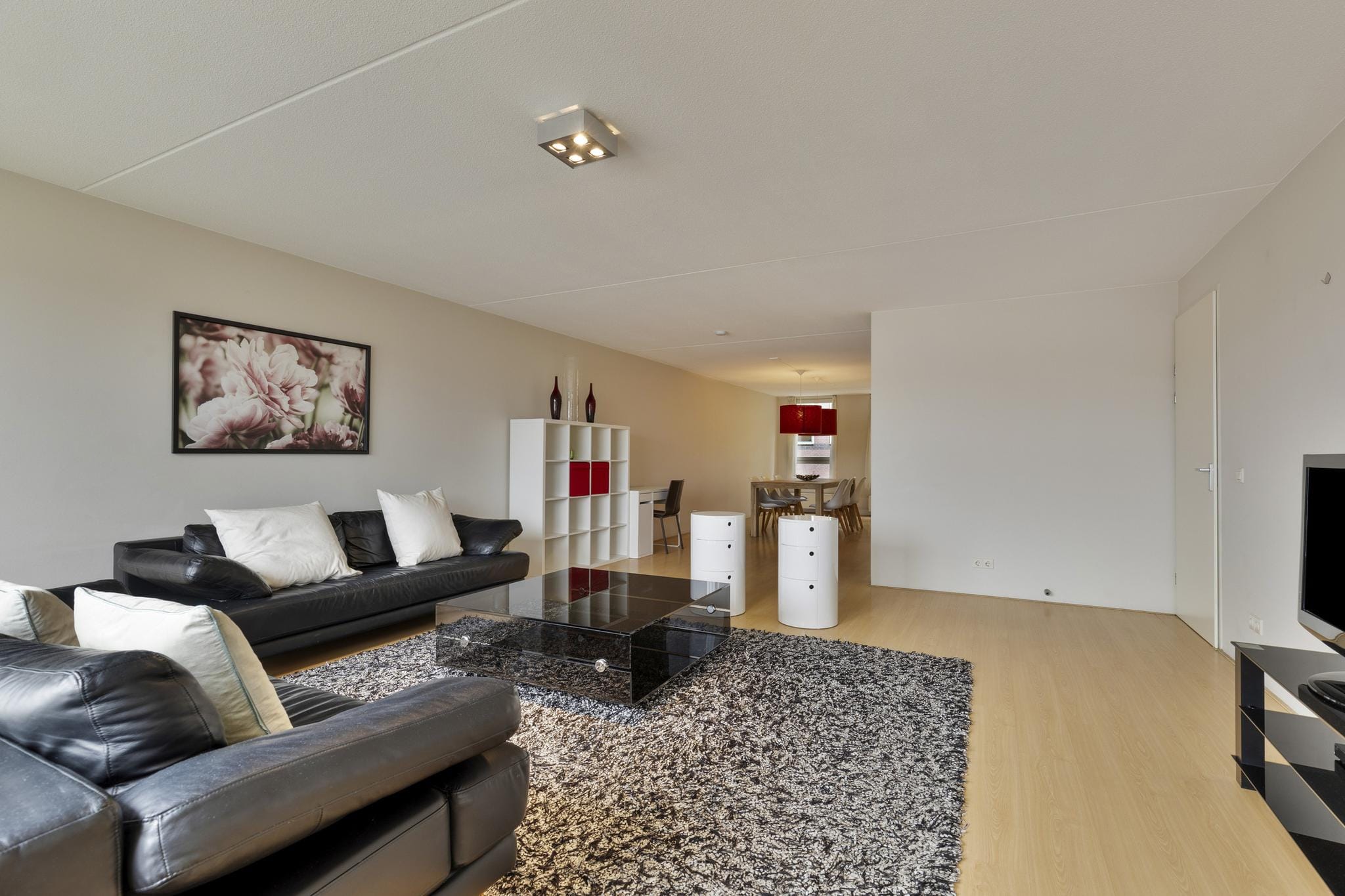 The living room is spacious and light thanks to the large windows with balcony door. This allows a pleasant amount of daylight to enter. There is enough space for both an attractive sitting area and a cozy dining area. The open kitchen is modern and spacious, with a corner unit in a light colour scheme and high-quality equipment such as an induction hob, extractor hood, combi oven, fridge/freezer and a dishwasher. The dark worktop provides a beautiful contrast.