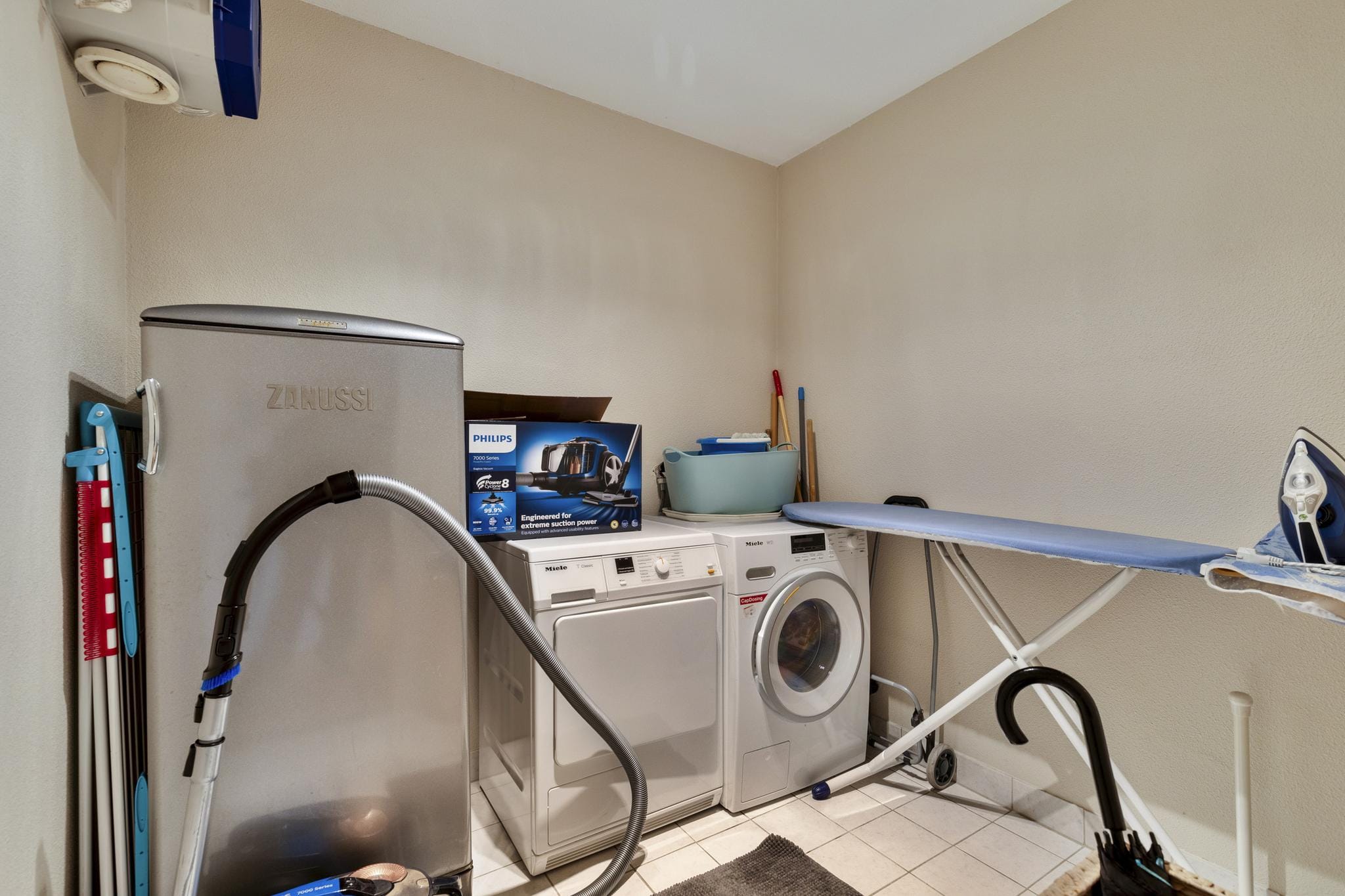 Through the shared entrance you enter a well-maintained complex. Here you will find a doorbell panel and mailboxes. The staircase and elevator provide you with access to the desired fifth floor. This is very convenient because you then have an unobstructed view of all roofs. Upon entering the apartment you are in a spacious entrance with light walls and a laminate floor that runs over the entire floor. In the entrance there is also a double storage cupboard and a spacious separate laundry room/storage room. In addition, there is a separate toilet and the bathroom. Through the entrance you have access to all living areas.