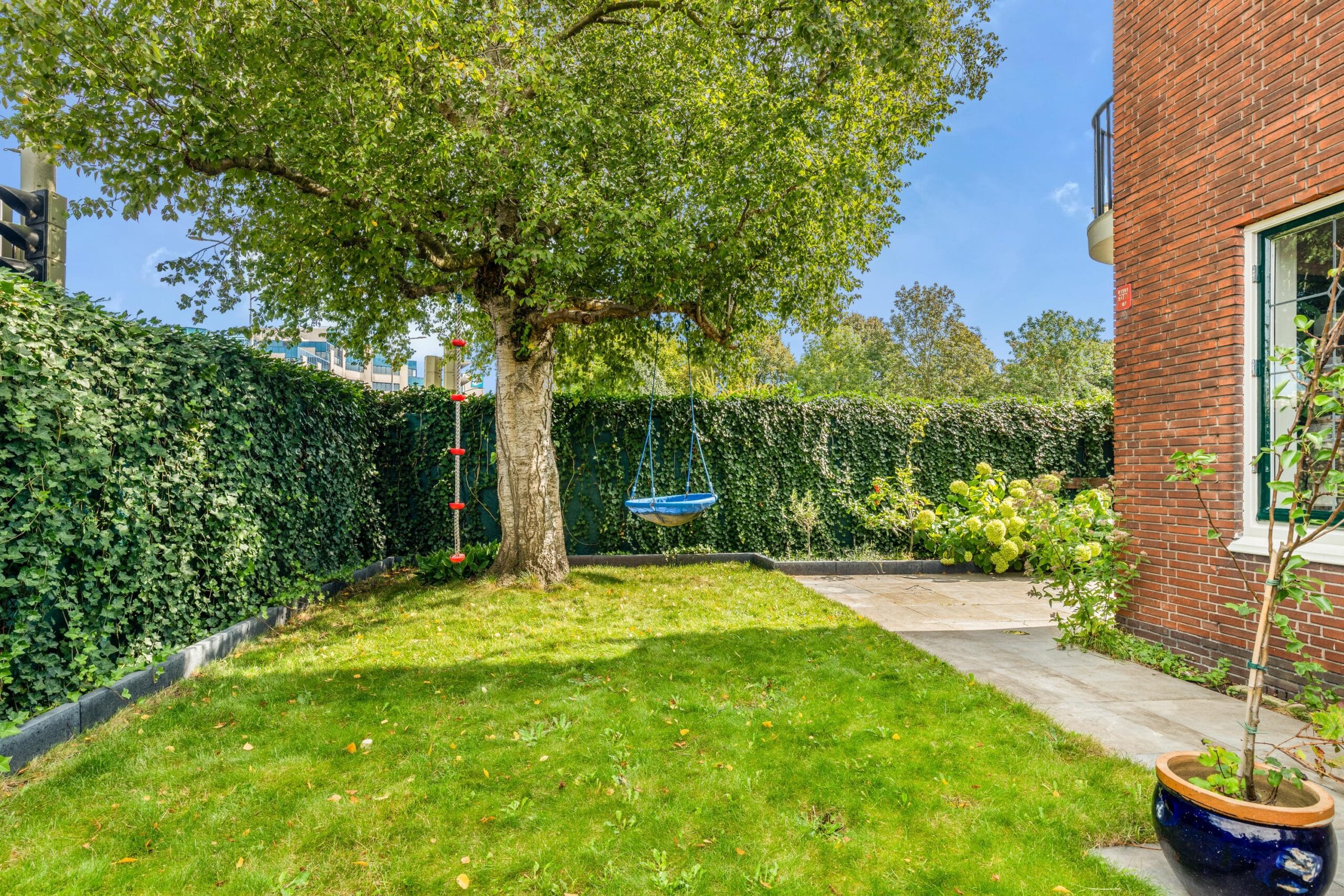 The generous garden offers lots of privacy and enough space for both a lounge set and a dining table. Thanks to the corner location, the garden almost wraps around the entire house. A wonderful place to spend long summer evenings outdoors.