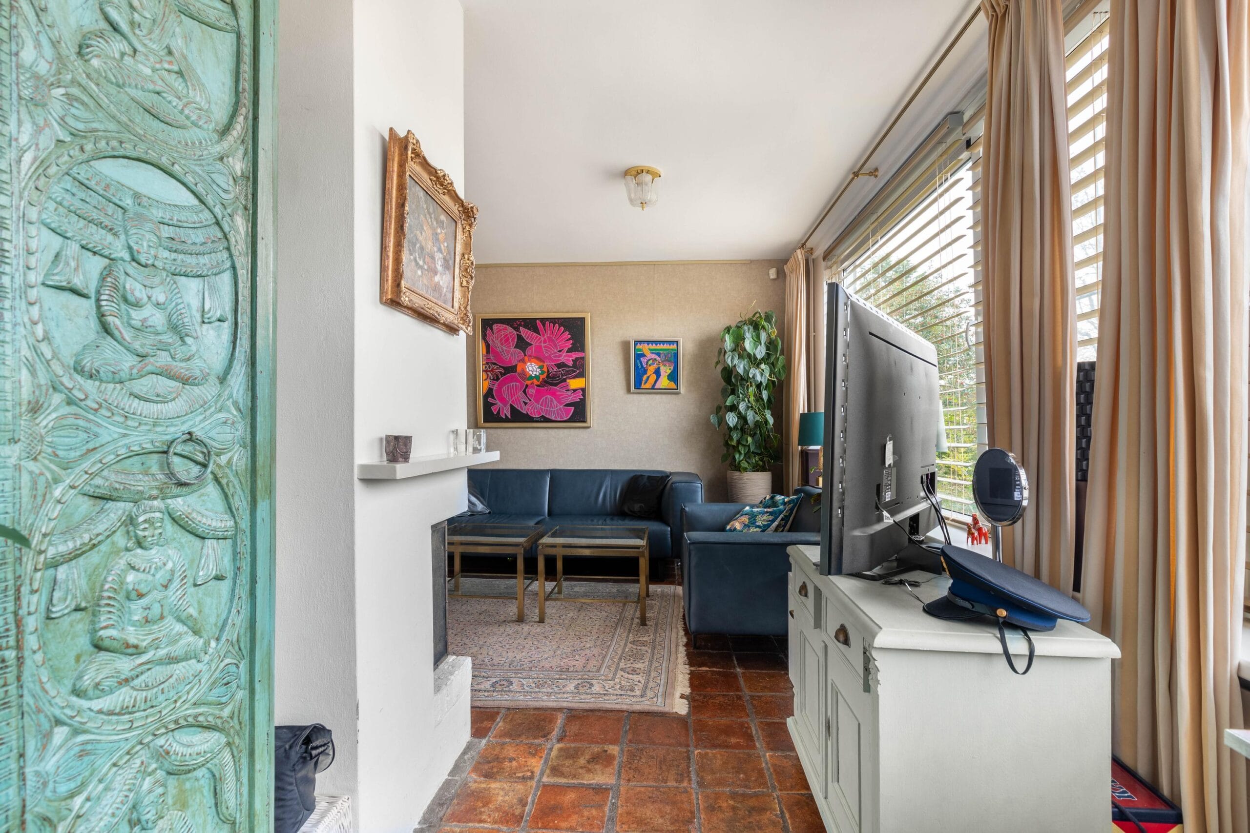 Upon entering the hall, you’ll find the meter cupboard and access to both the kitchen and living room. The living room has a playful layout, with several cozy spots to read, listen to music, or unwind. The extension has been cleverly used as a charming corner with a view of the garden. Thanks to the French doors and skylight, this space feels wonderfully bright and spacious.
