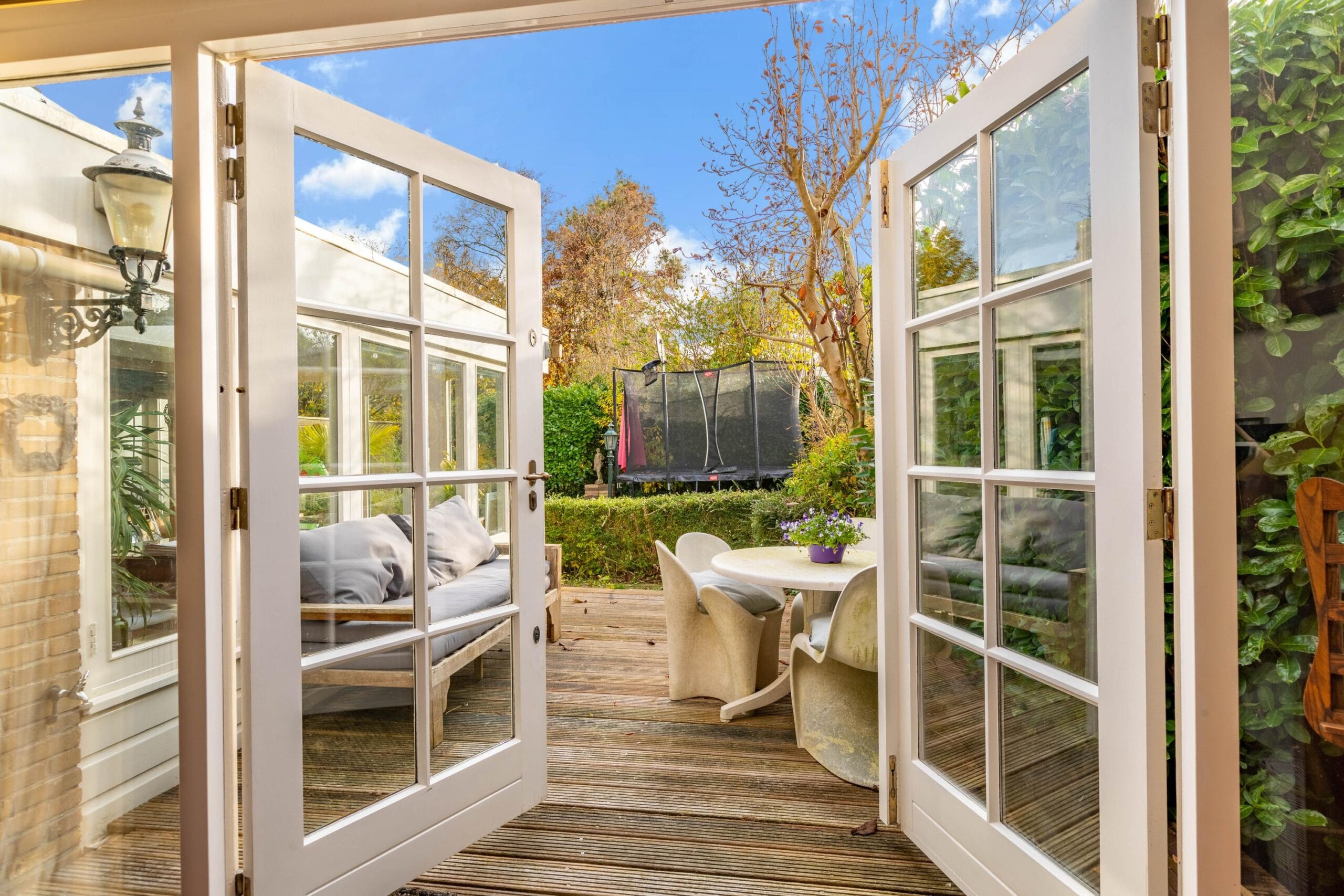 The sunny south-facing garden is surprisingly deep. With its various corners, there is space for a trampoline, a large dining table for long BBQ evenings, and a comfortable seating area to enjoy a morning coffee in the sun.