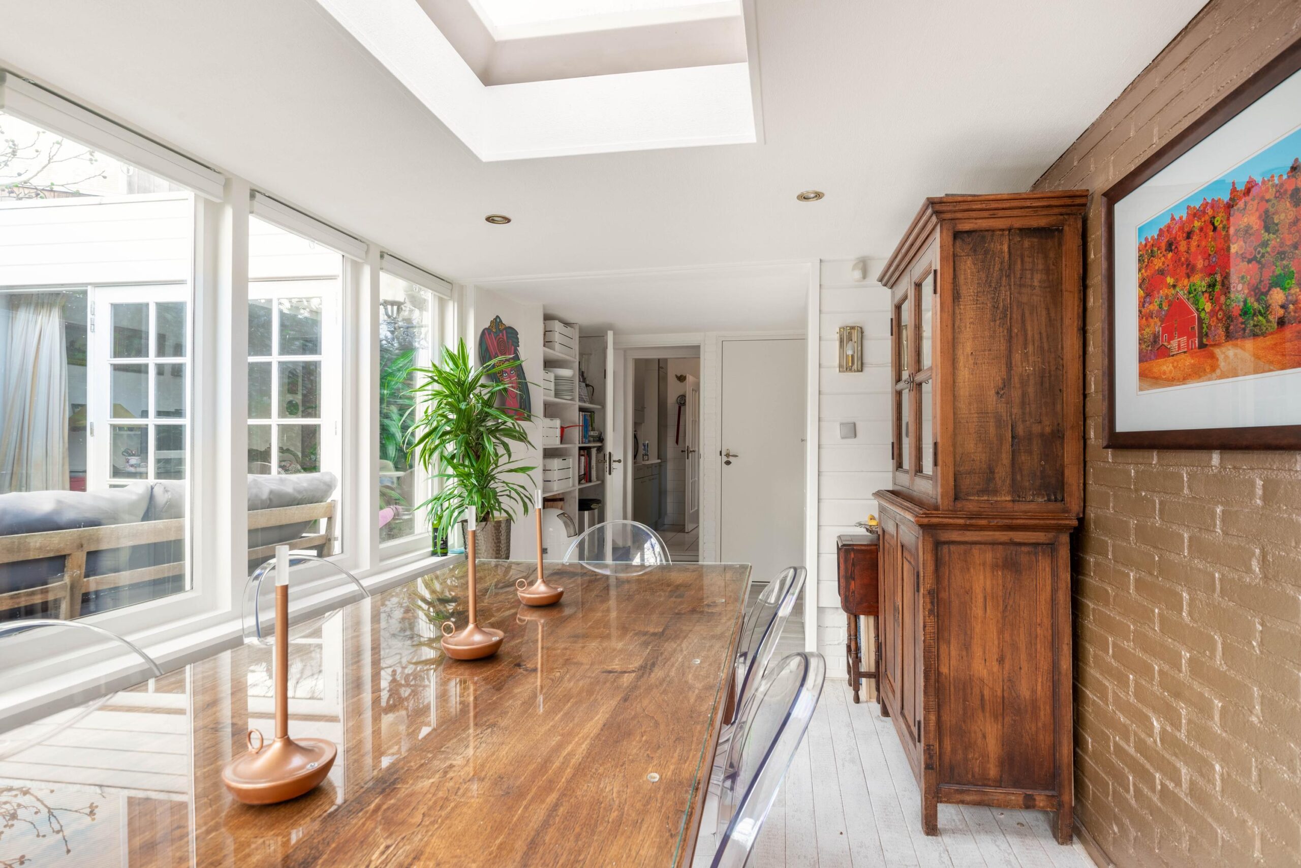 The second extension accommodates a generous dining room, easily fitting a large dining table for long evenings with family and friends. A skylight here also brings in abundant natural light and offers a lovely view of the garden. From the dining room, you can access the kitchen, which is practically designed and equipped with a 5-burner gas stove, dishwasher, and fridge-freezer. From the dining room, you can continue through to the garage which, thanks to the double doors and electrical connection, can also be perfectly used as an office or practice space.