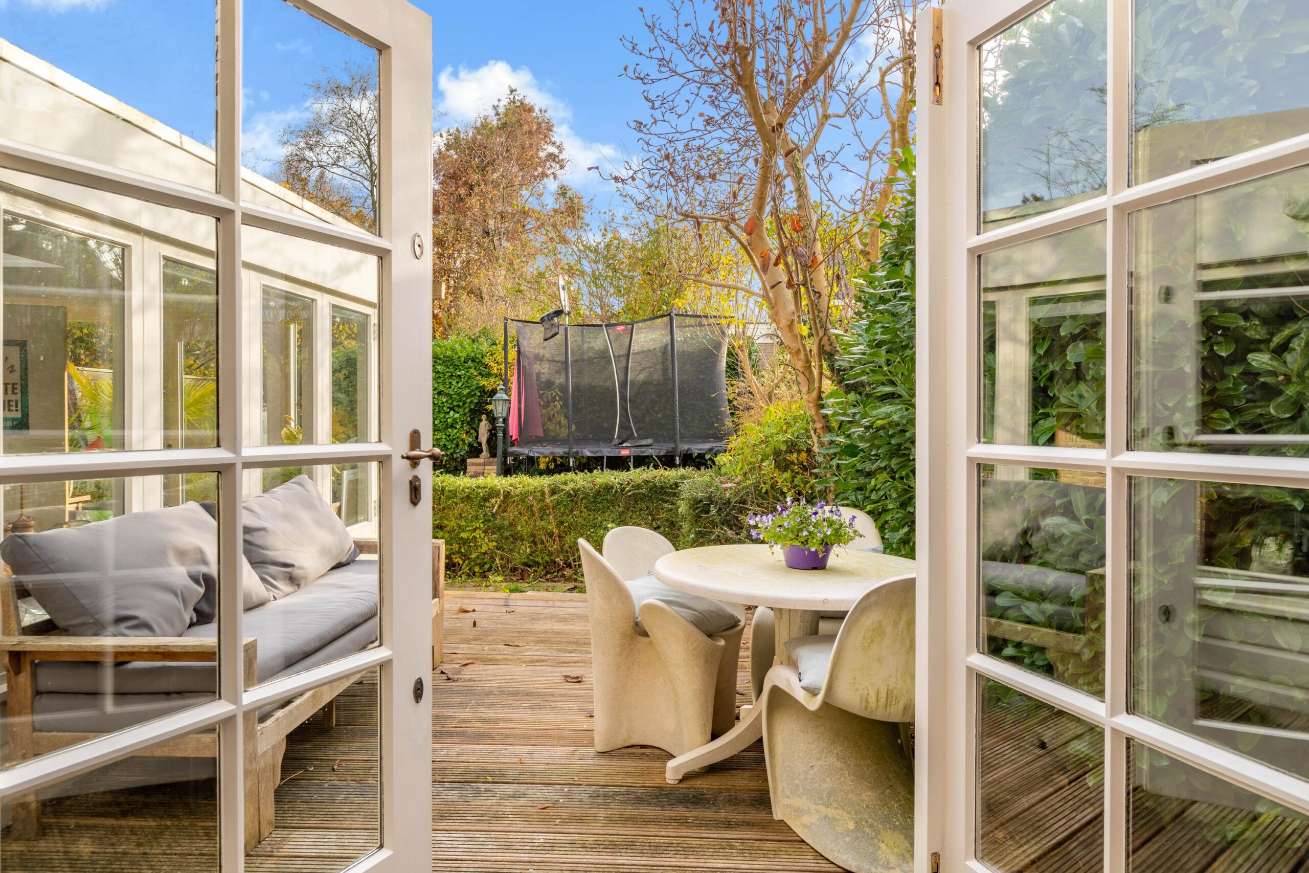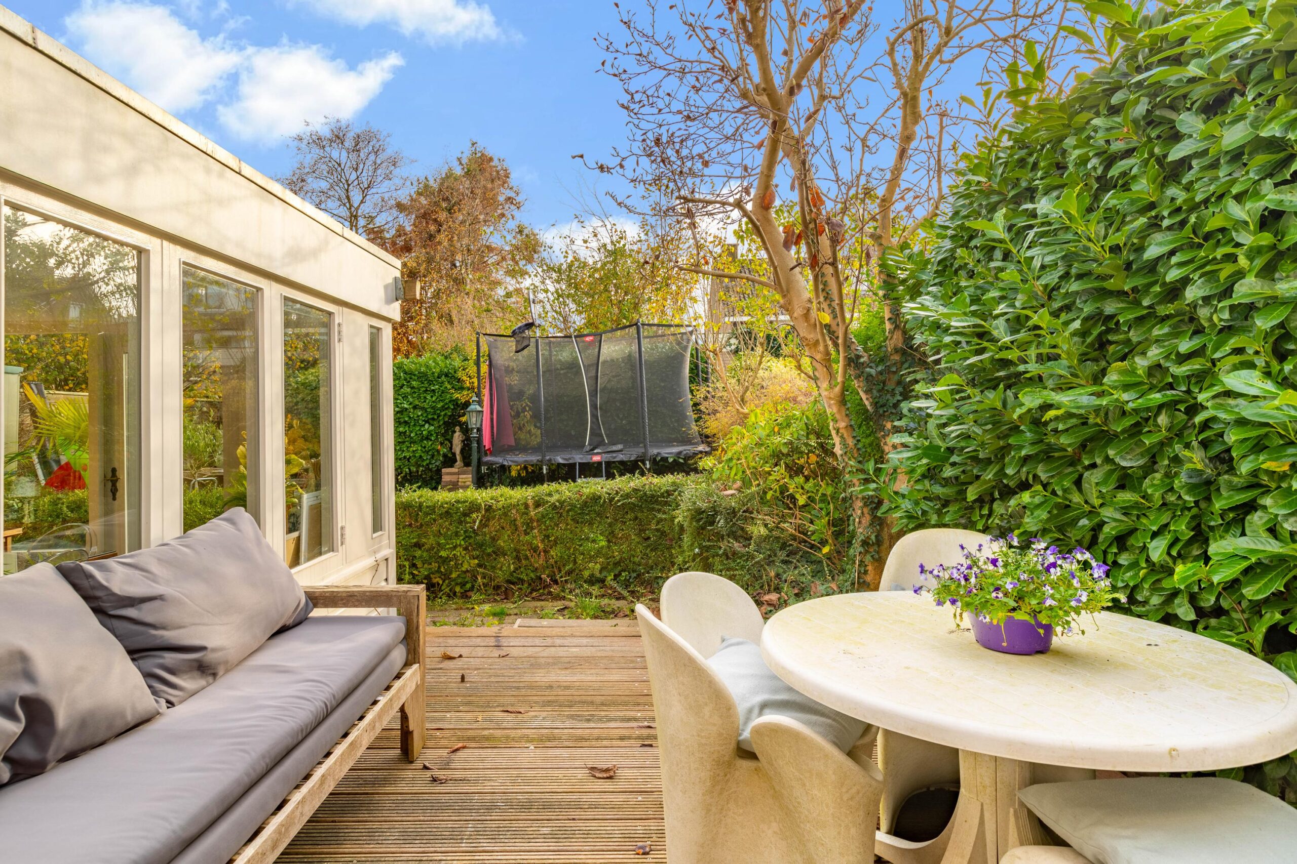 The sunny south-facing garden is surprisingly deep. With its various corners, there is space for a trampoline, a large dining table for long BBQ evenings, and a comfortable seating area to enjoy a morning coffee in the sun.