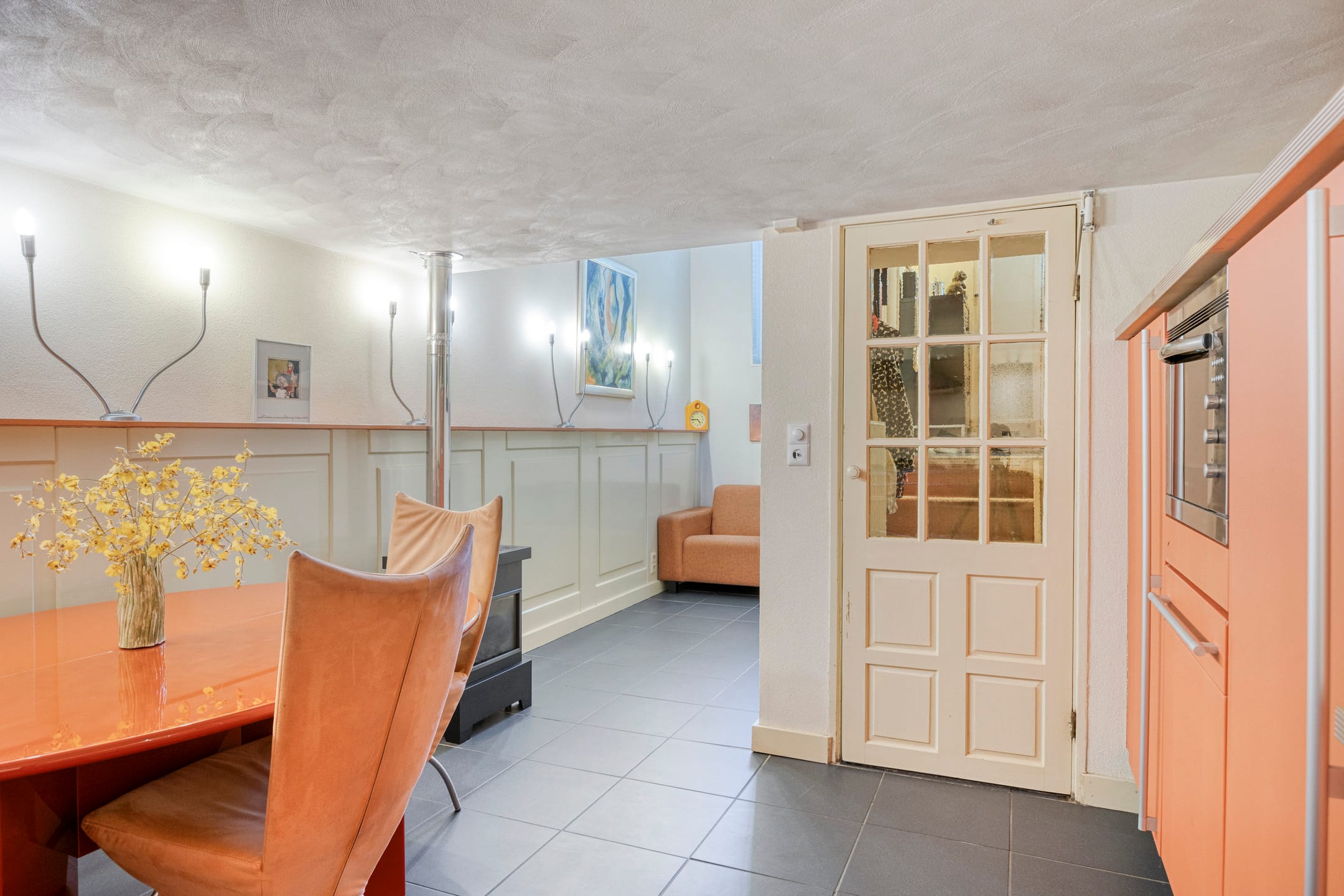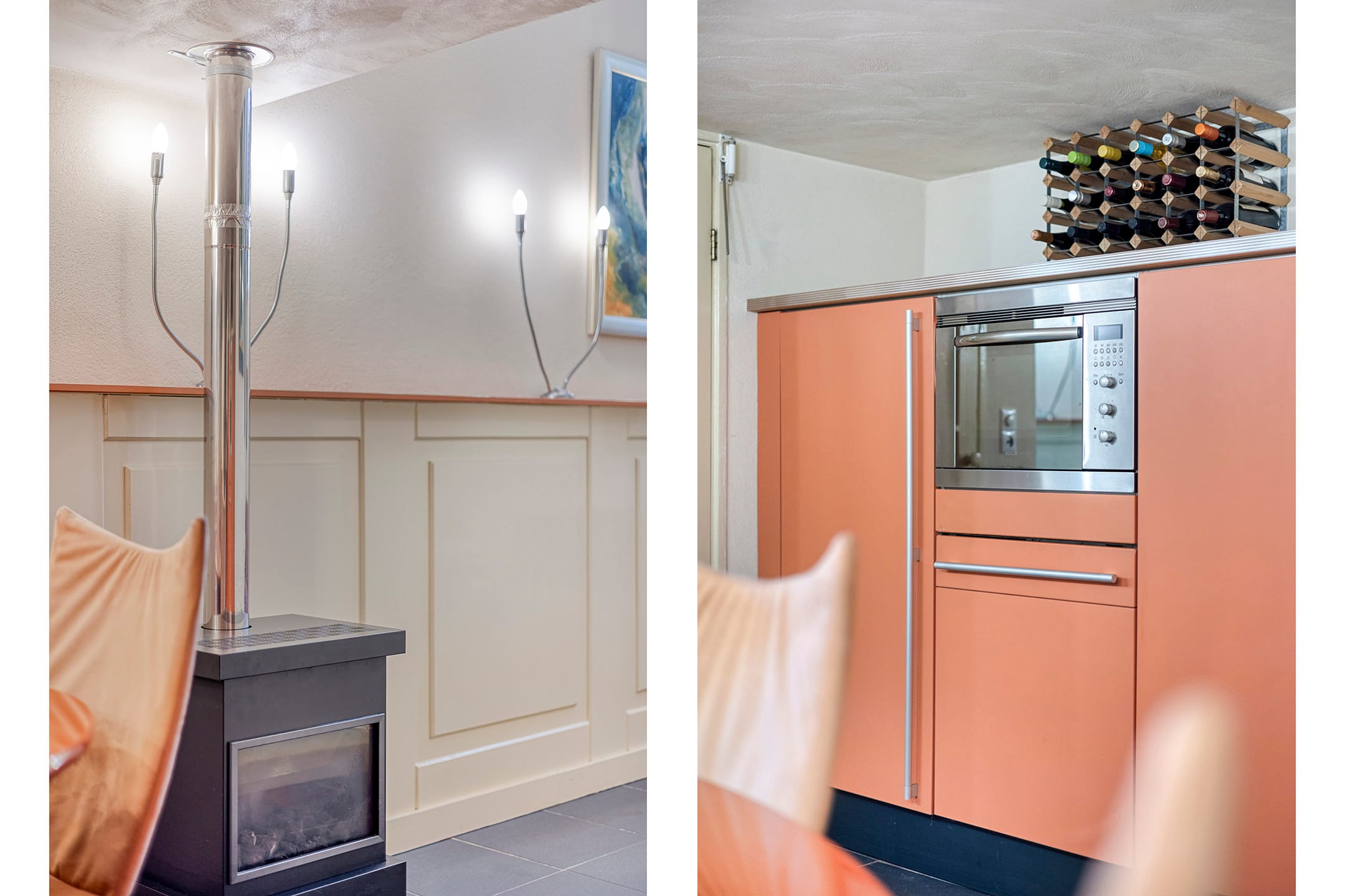 We start in the hall, which gives access to the souterrain. Here you’ll find the cozy kitchen-diner. This is a wonderful spot for long dinners or lounging with company. The kitchen is finished in warm, light tones and equipped with all conveniences: a 5-burner gas hob, dishwasher, refrigerator, freezer with drawers, washing machine, and a combi-oven. The open connection to the living room makes it a social place to cook, with the gas fireplace adding extra atmosphere.