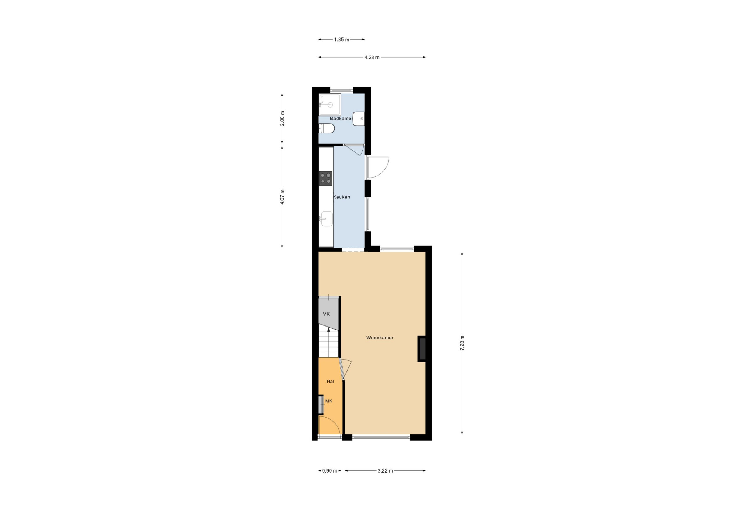Entree in de hal met meterkast en dichte trap. De lichte woonkamer is voorzien van strakke witte muren en een lichte laminaat vloer. De weggewerkte kachel biedt ruimte voor planten of boeken. De keuken bevind zich in de aanbouw en is voorzien van oven, koelkast, en heeft ruimte voor een vaatwasser. Hier is tevens de toegang tot de op het zuiden gelegen tuin. De badkamer is in dezelfde aanbouw en is praktisch ingedeeld met inloopdouche, wastafelmeubel en hangend toilet.