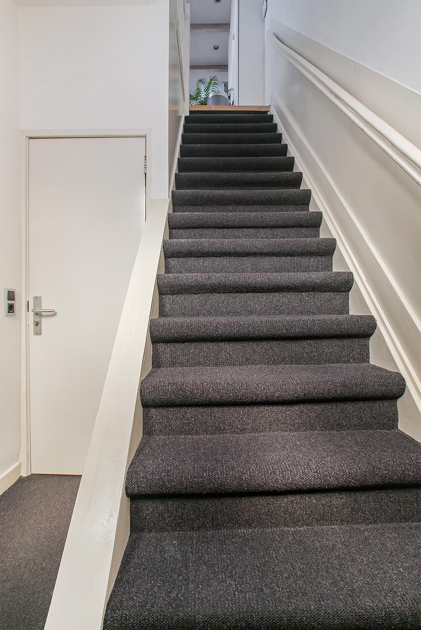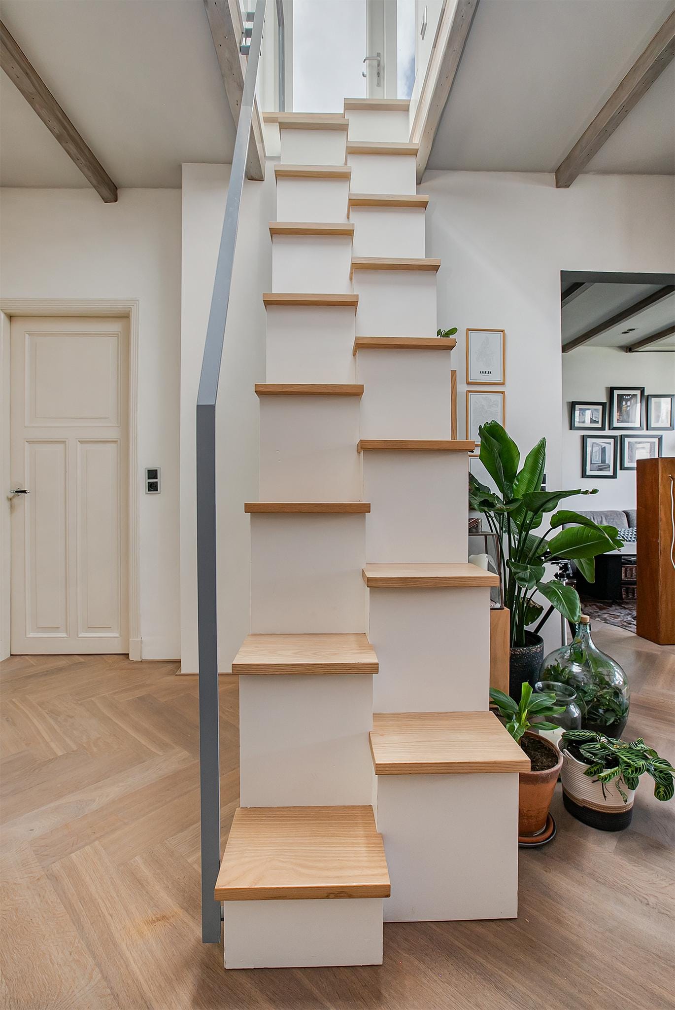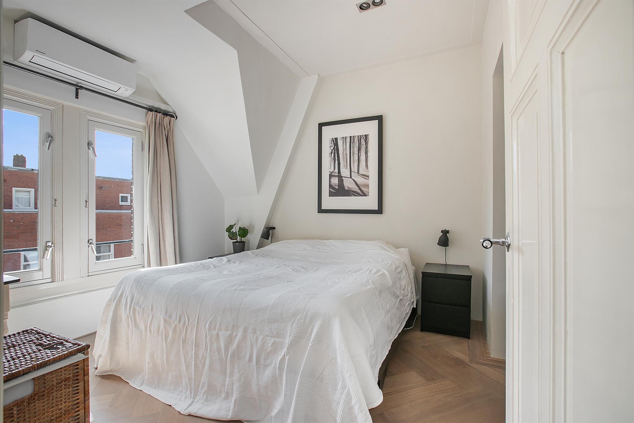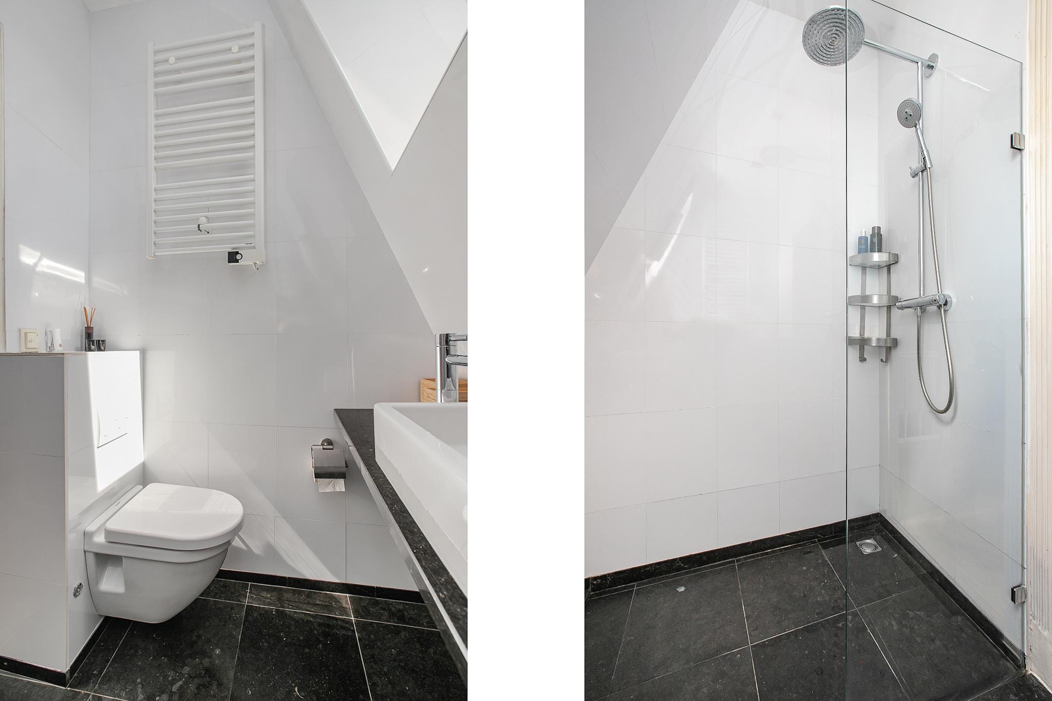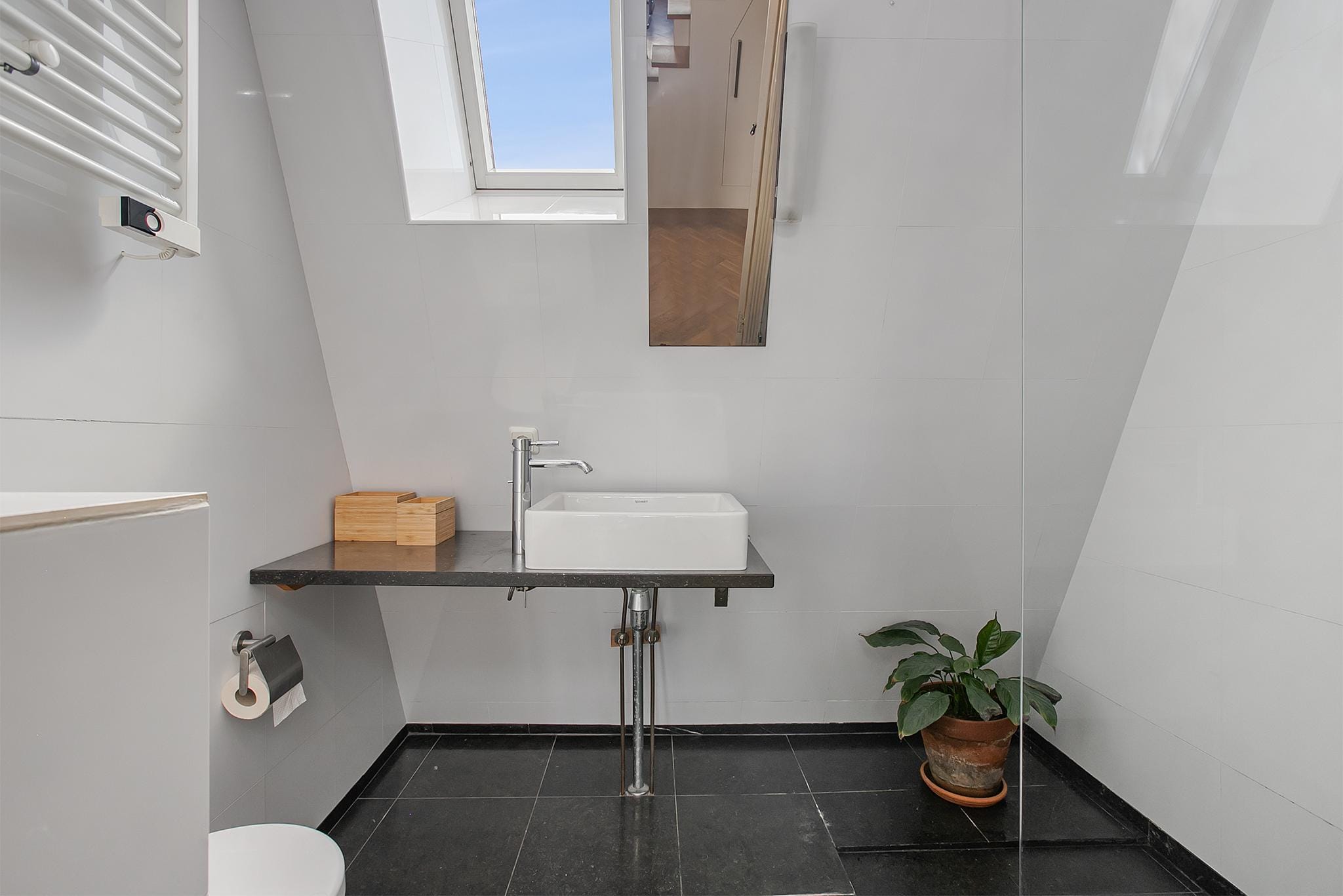 The bathroom is located next to the stairs at the front of the apartment. This is equipped with a walk-in shower, built-in toilet, floating bathroom furniture with mixer tap and modern black tiled floor. Next to the bathroom is the entrance to the master bedroom with airco system a view of Ruysdaelstraat. There is room for a large double bed and, your own a walk-in closet! A unique staircase has been placed in the middle of the landing that provides access to the beautiful roof terrace of more than 29 m2. So there is more than enough space for a large garden furniture. The panoramic view allows you to sit in the sun all day long and enjoy all the beauty that the Amsterdam skyline has to offer.