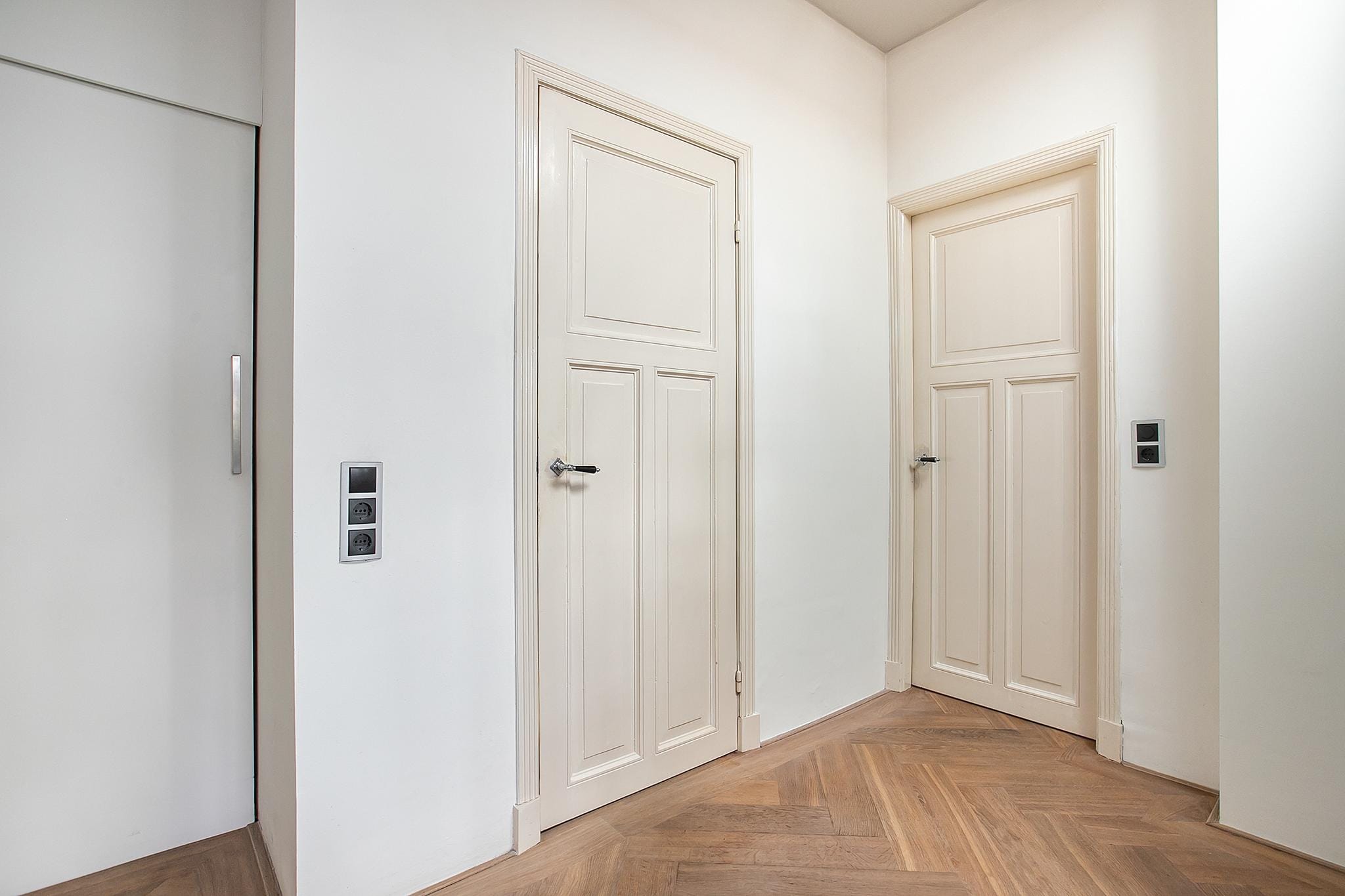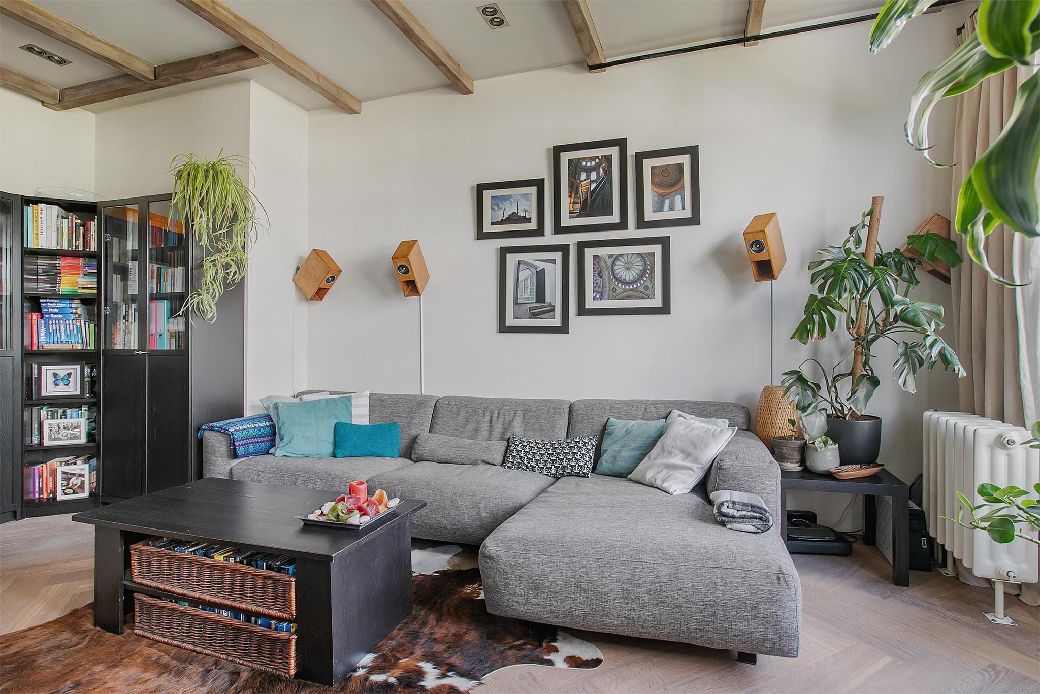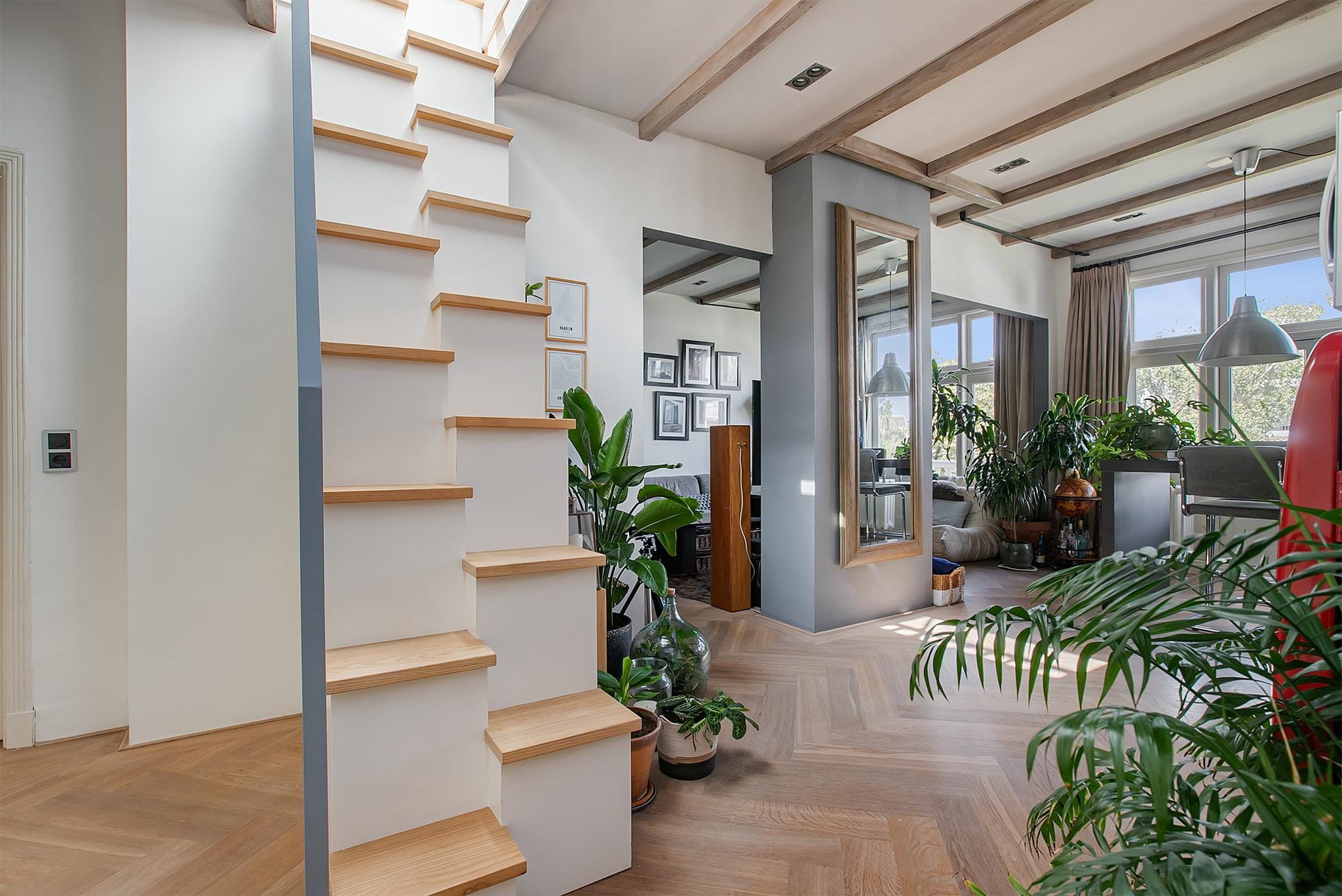 Via the entrance, coat rack, meter cupboard and central heating system, you walk up the stairs and step straight into this spacious and characteristic apartment. The historic details, such as the wooden herringbone floor, the high ceiling with recessed spotlights and the graceful doors, make you immediately feel at home. At the rear of the stairs is a cupboard with the boiler. Here is also a connection for a washing machine and extra storage space. From the landing you enter the modern kitchen. This has natural light through the large windows at the rear of the house. The kitchen has a metal-finished countertop, upper cabinets with built-in spotlighting, four-burner hob, designer extractor hood, dishwasher, separate Bosh refrigerator and a cozy bar. Here you can work efficiently and enjoy pleasant late evenings! To the left of the kitchen are two open passages to the lovely living room. There is room for a large corner sofa, lounge chairs and even a separate dining area. The French doors give the living room beautiful light. They also provide access to the 7 m2 balcony that covers the entire rear of the apartment.