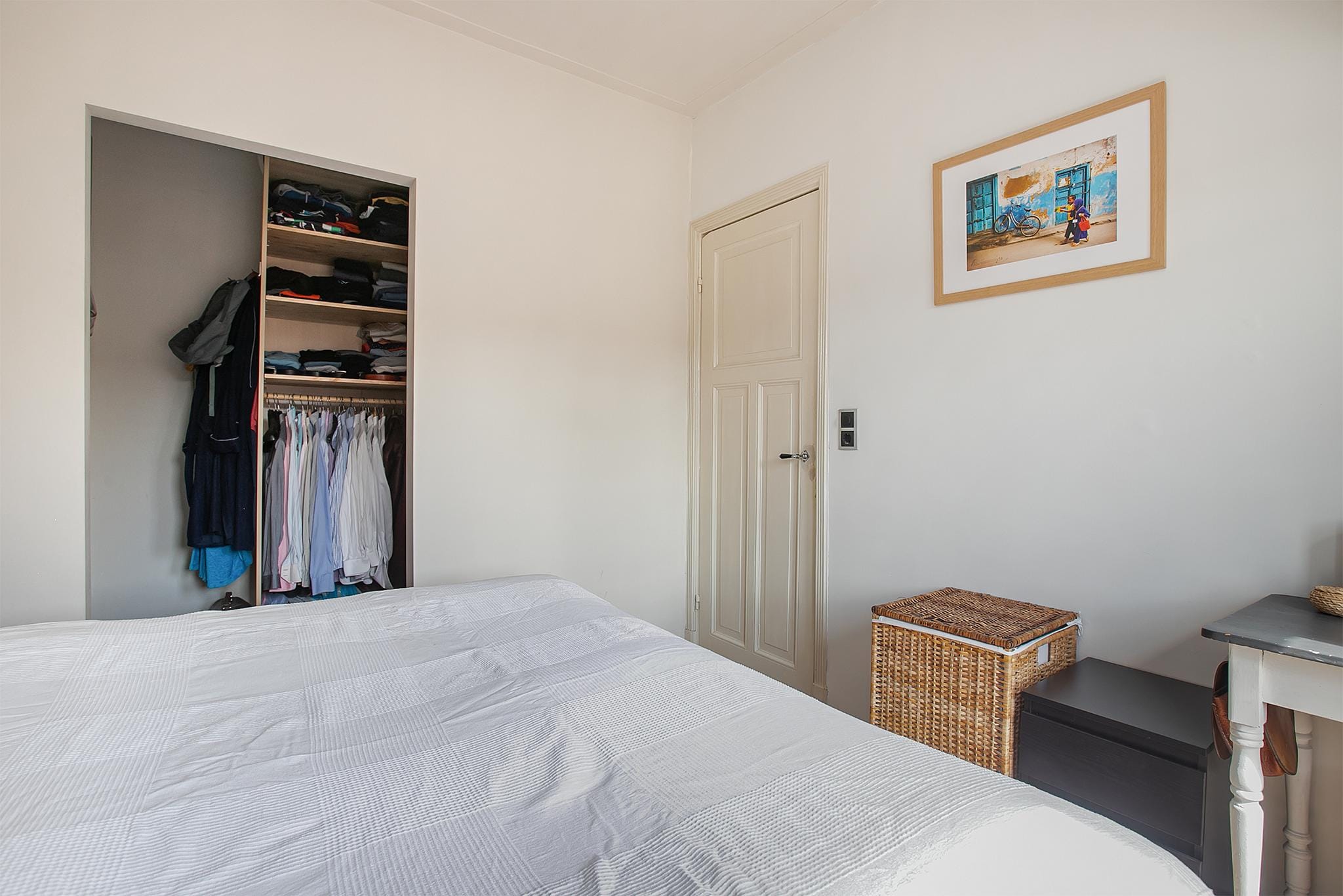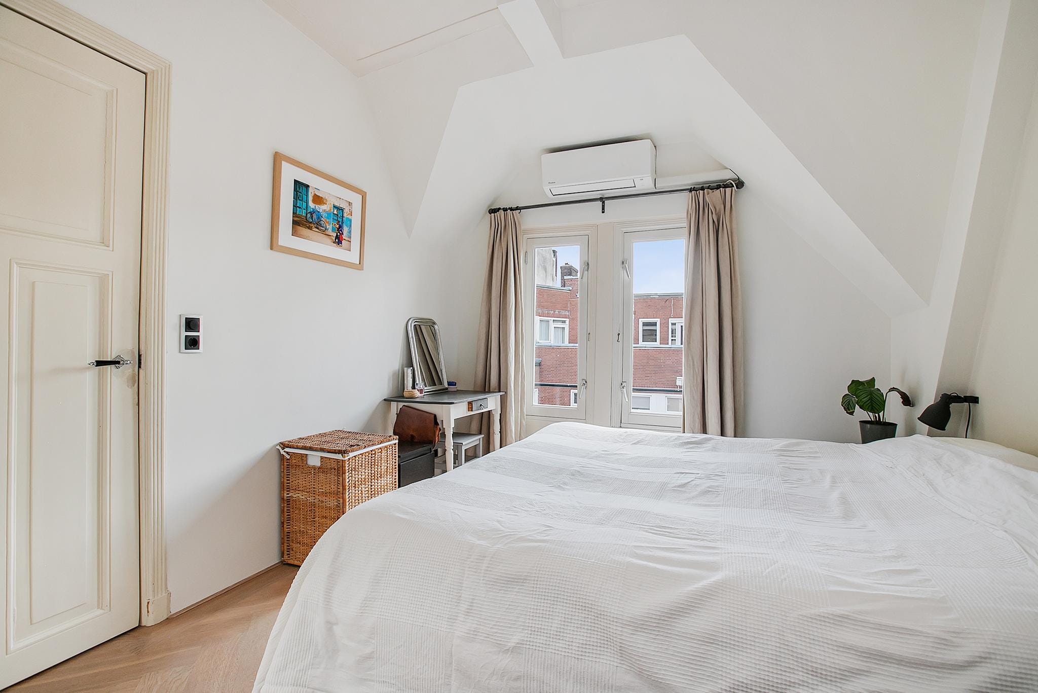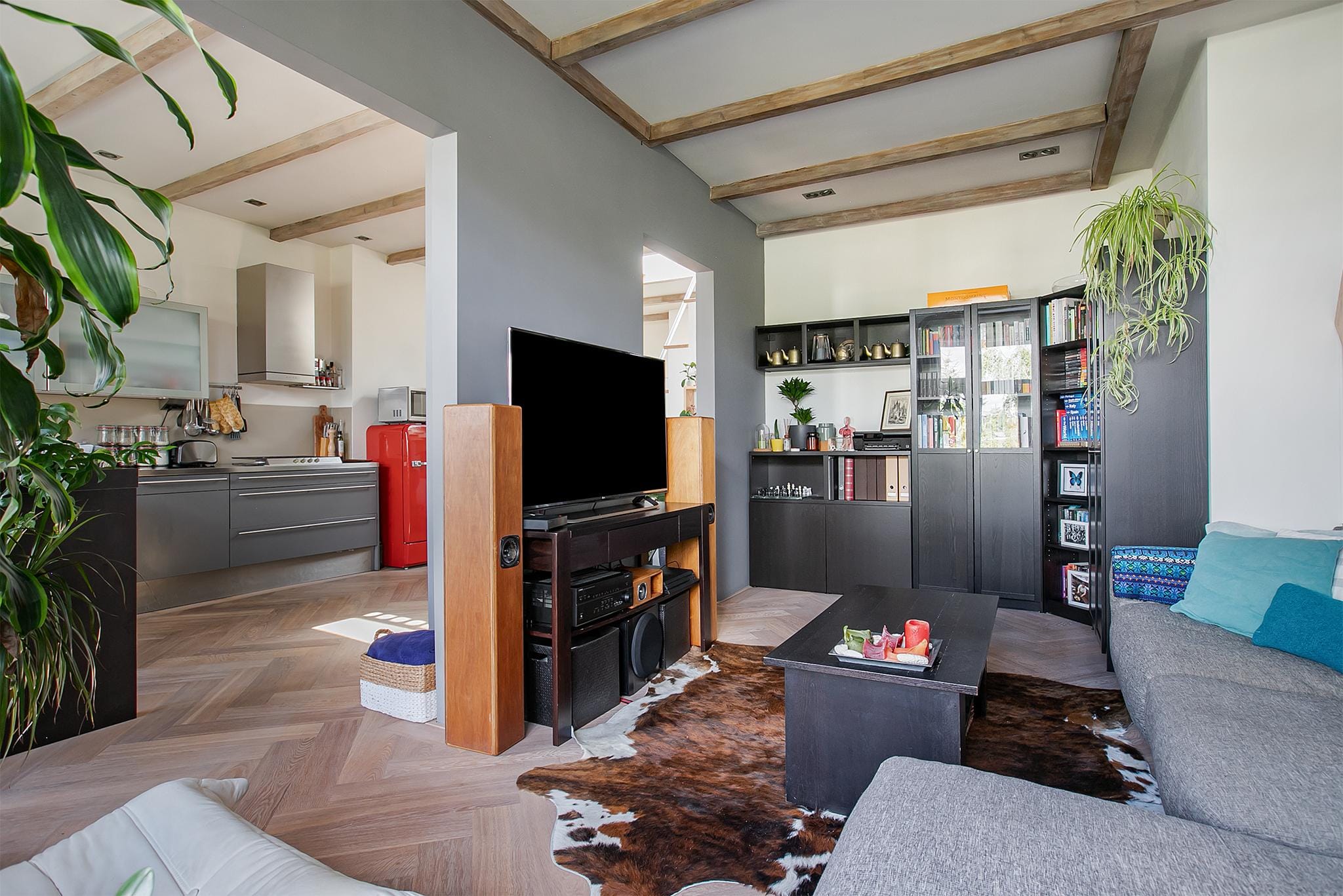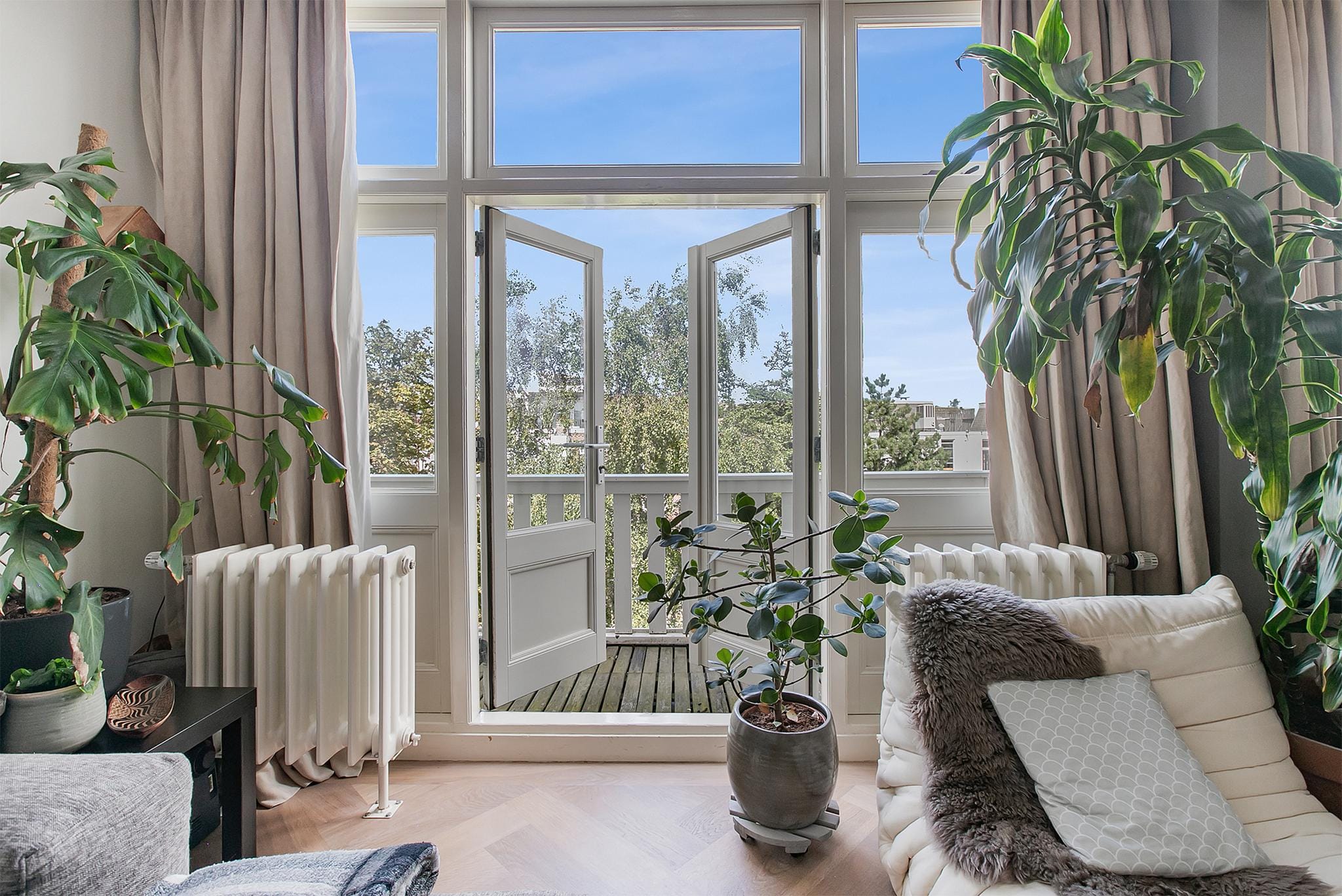 Via the entrance, coat rack, meter cupboard and central heating system, you walk up the stairs and step straight into this spacious and characteristic apartment. The historic details, such as the wooden herringbone floor, the high ceiling with recessed spotlights and the graceful doors, make you immediately feel at home. At the rear of the stairs is a cupboard with the boiler. Here is also a connection for a washing machine and extra storage space. From the landing you enter the modern kitchen. This has natural light through the large windows at the rear of the house. The kitchen has a metal-finished countertop, upper cabinets with built-in spotlighting, four-burner hob, designer extractor hood, dishwasher, separate Bosh refrigerator and a cozy bar. Here you can work efficiently and enjoy pleasant late evenings! To the left of the kitchen are two open passages to the lovely living room. There is room for a large corner sofa, lounge chairs and even a separate dining area. The French doors give the living room beautiful light. They also provide access to the 7 m2 balcony that covers the entire rear of the apartment.