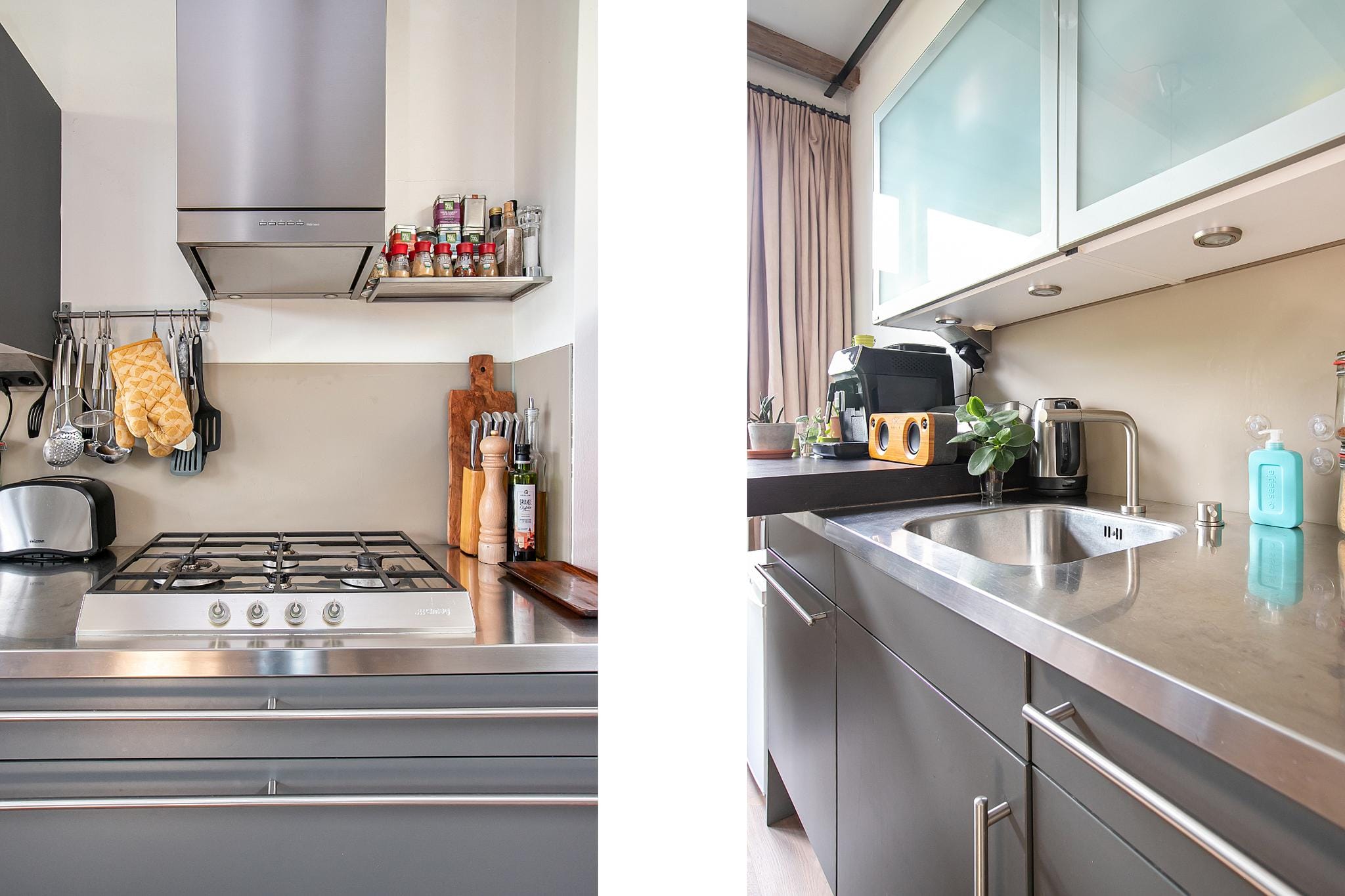 Via de entree, kapstok, meterkast en cv-installatie, loop je de trap omhoog en stap je direct in dit ruime en karakteristieke appartement. Door de historische details, zoals de houten balken, het hoge plafond met inbouwspots en de sierlijke deuren, voel je je onmiddellijk thuis. Aan de achterzijde van de trap is een kast met de warmteboiler. Hier is tevens een aansluiting voor een wasmachine en extra opbergruimte. Vanuit de overloop betreed je de moderne keuken. Deze heeft een natuurlijke lichtinval door de grote ramen aan de achterzijde van de woning. De keuken is voorzien van een met metaal afgewerkte aanrechtblad, bovenkastjes met ingebouwde spotverlichting, vierpits kookplaat, design afzuigkap, vaatwasser, separaat koelkast van Bosh en een gezellig bar. Hier kun je zowel efficiënt werken, als genieten van gezellige late avonden! Links van de keuken zijn twee open doorgangen naar de fijne woonkamer. Hier is ruimte voor een grote hoekbank, loungestoelen en zelfs een aparte eethoek. De openslaande deuren geven de woonkamer een prachtige lichtinval. Ze zijn tevens de toegang tot het balkon van 7 m2 dat over de volledige achterzijde van het appartement is gestationeerd.