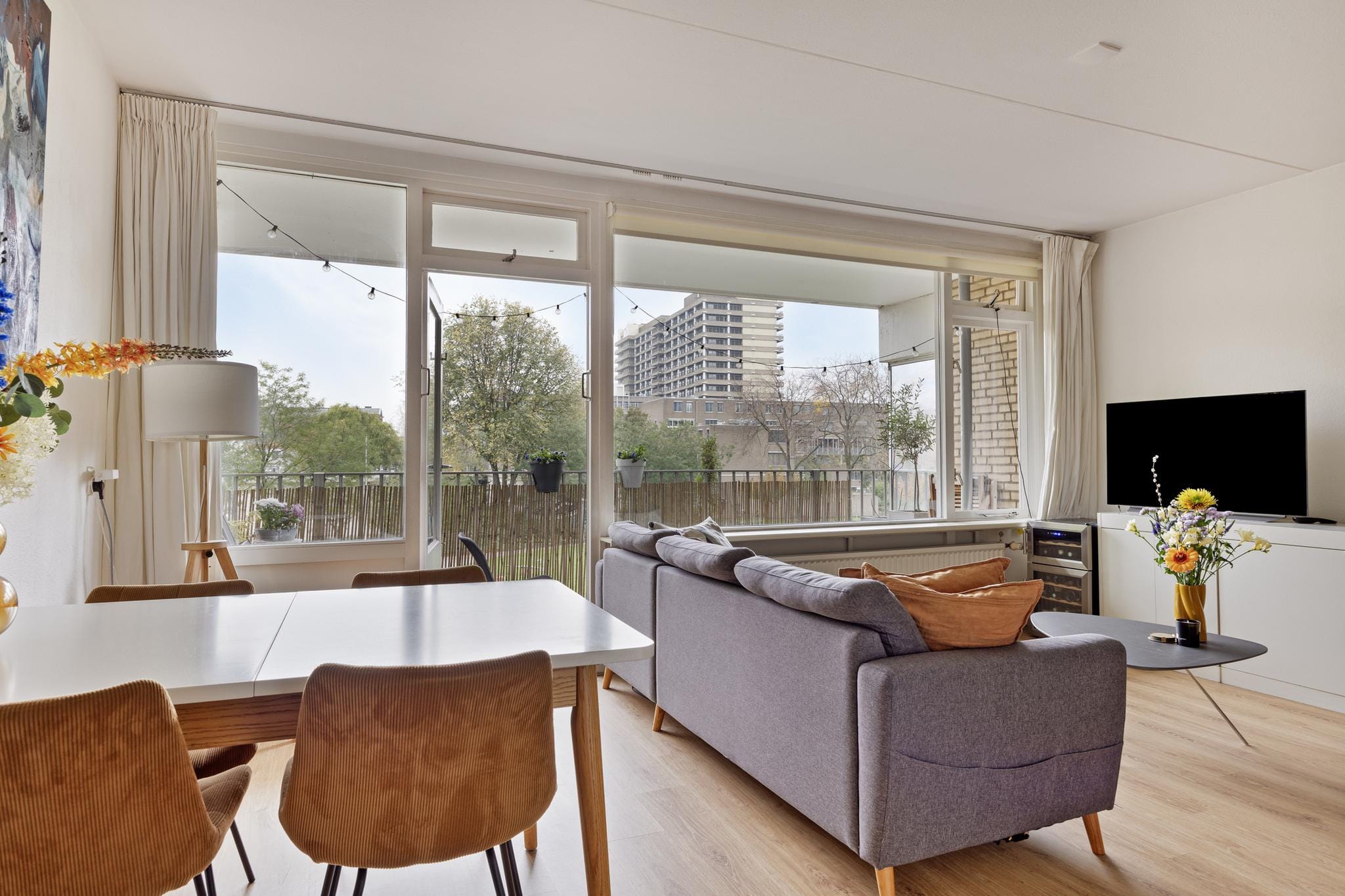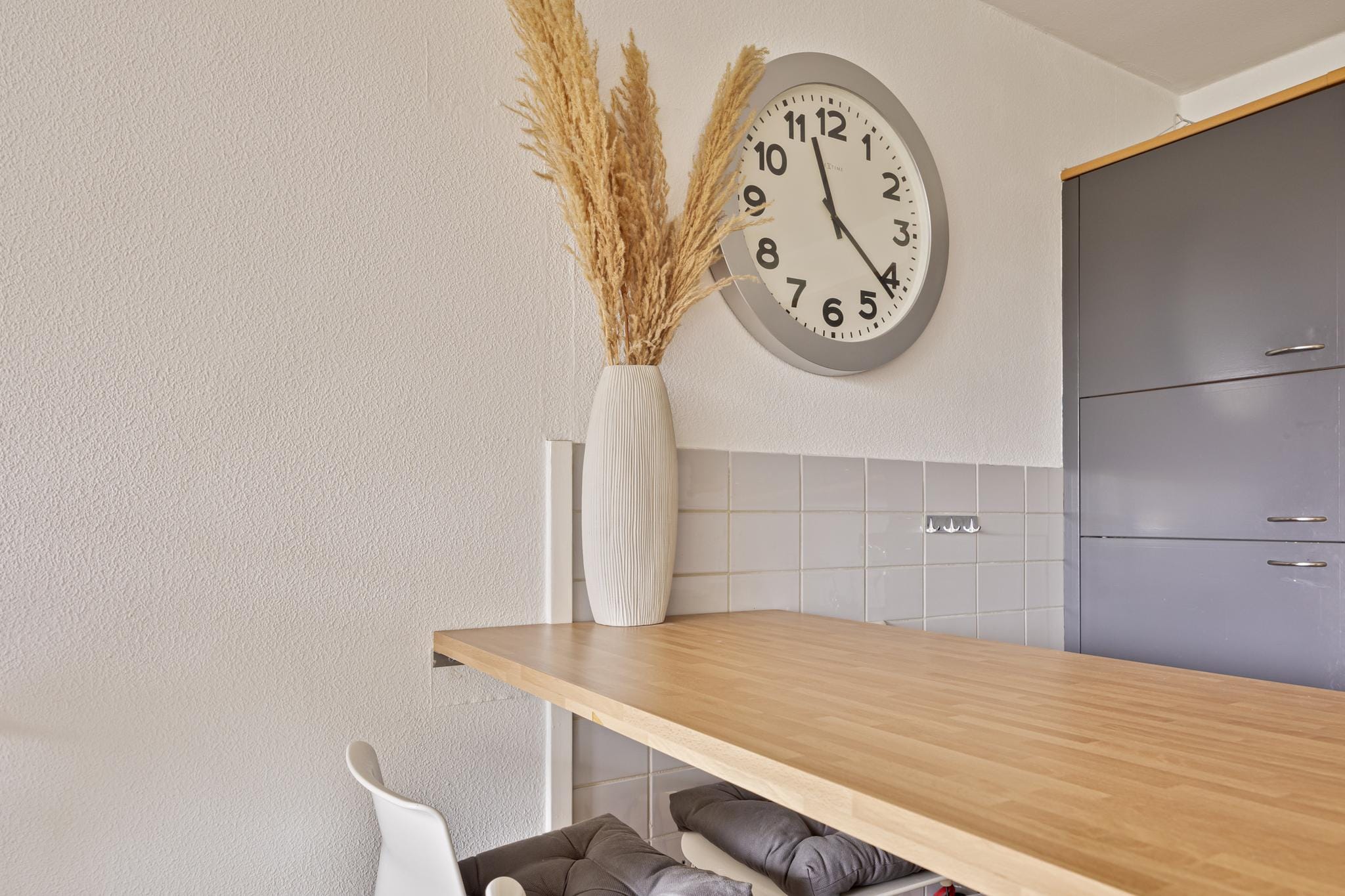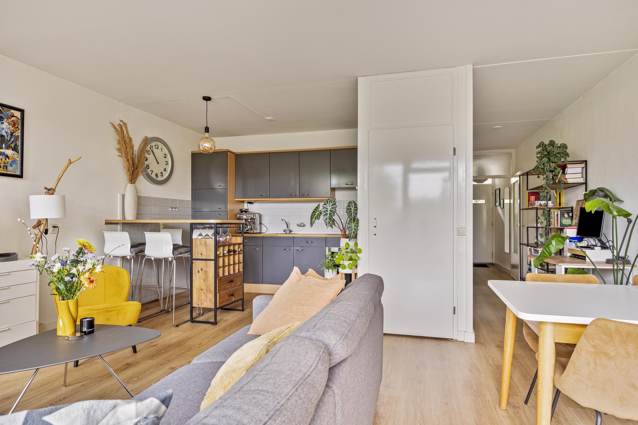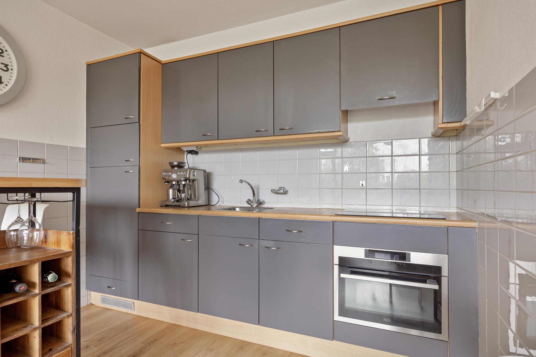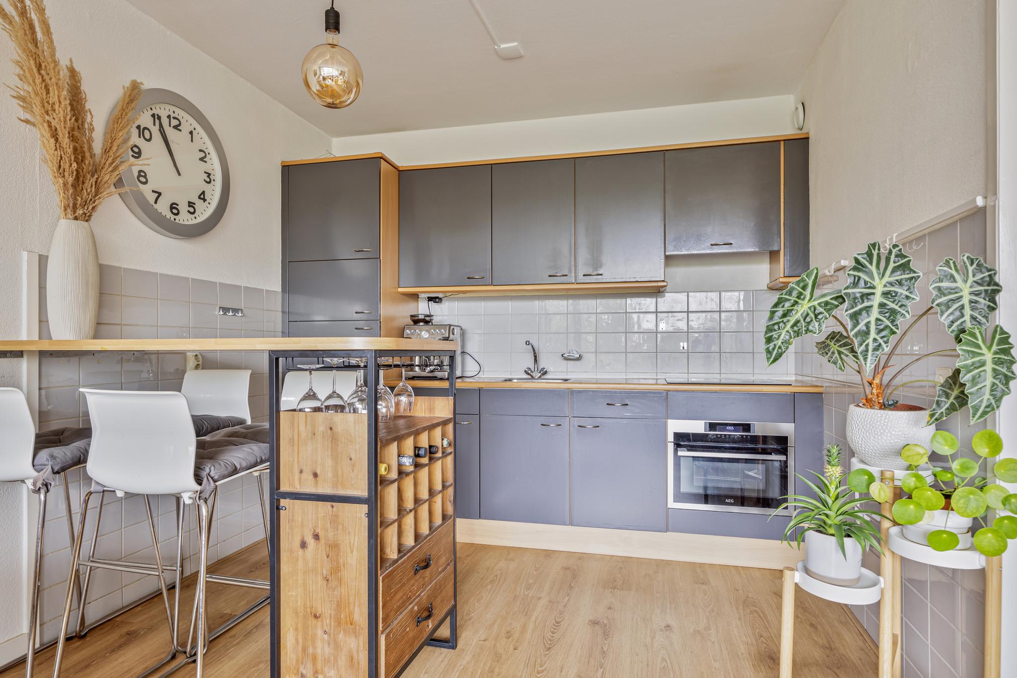 Deze royale woonkamer, het centrale punt van de woning, straalt licht en ruimte uit dankzij de grote raampartijen die volop natuurlijk daglicht binnenlaten. De open indeling biedt voldoende ruimte voor een comfortabele zithoek en een aparte eethoek, ideaal voor ontspanning en gezelligheid. Vanuit de woonkamer stapt u zo het balkon op, waardoor binnen en buiten op een natuurlijke manier in elkaar overlopen. Een moderne open keuken grenst aan de woonkamer en is van alle gemakken voorzien. Het lange aanrechtblad biedt ruime werkplek, en met een inductiekookplaat met afzuigkap, koelkast en spoelbak is alles binnen handbereik. De keuken beschikt daarnaast over slimme opbergmogelijkheden dankzij de vele lades en kastjes, zodat u uw spullen netjes en overzichtelijk kunt opbergen.