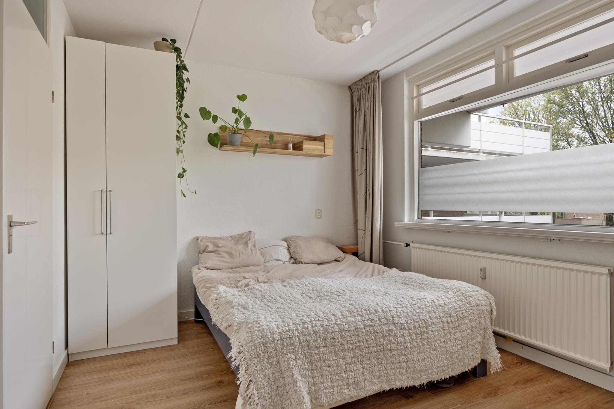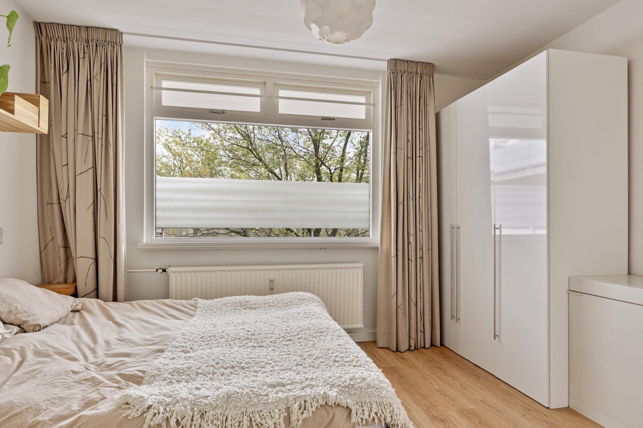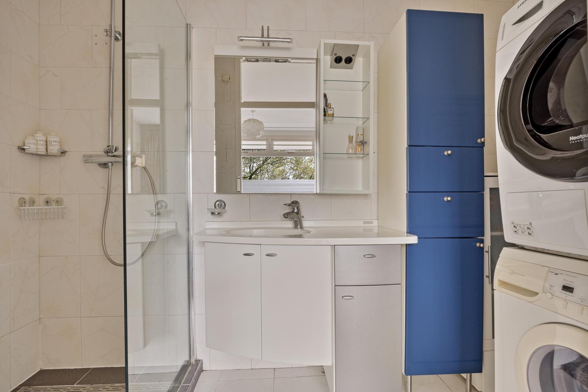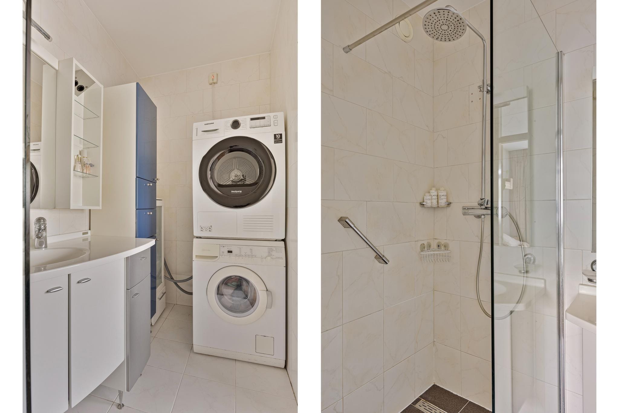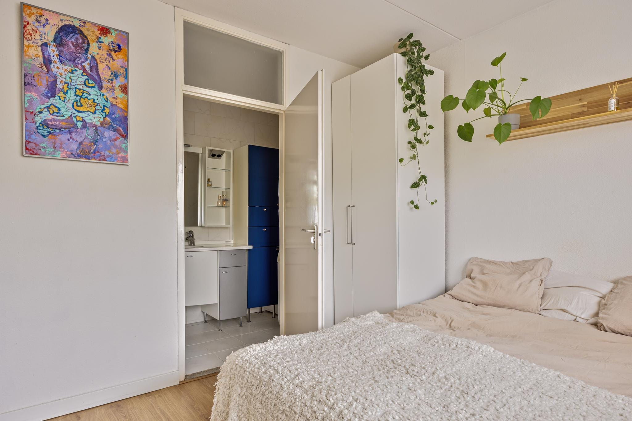 Deze ruime en goed onderhouden slaapkamer biedt een rustige plek om te ontspannen. Dankzij de royale afmetingen is er genoeg ruimte voor een comfortabel bed, een bureau of een extra opbergmeubel. De grote raampartijen zorgen voor een prettige hoeveelheid natuurlijk licht, wat bijdraagt aan de rustgevende sfeer in deze kamer. De woning beschikt over een nette, volledig betegelde badkamer die bereikbaar is vanuit de slaapkamer. Hier vindt u een ruime inloopdouche, een wastafel en een handige witgoedaansluiting. De wc bevindt zich in een separate ruimte, eveneens betegeld en uitgerust met een modern zwevend toilet, voor extra gemak en privacy.