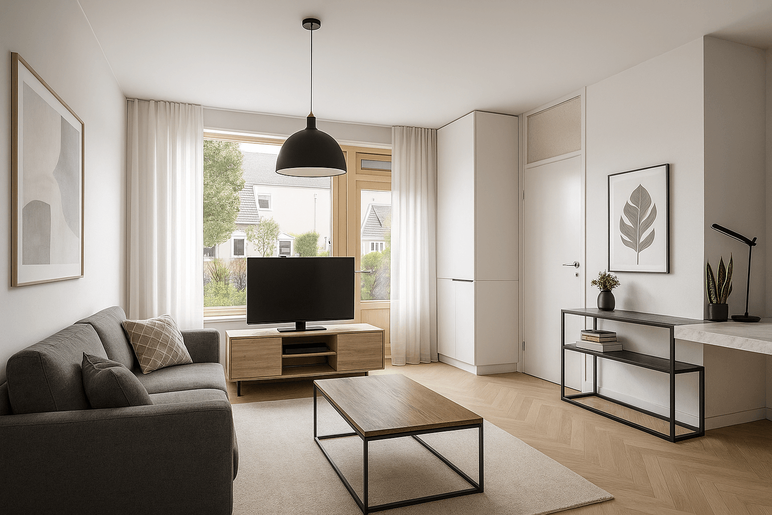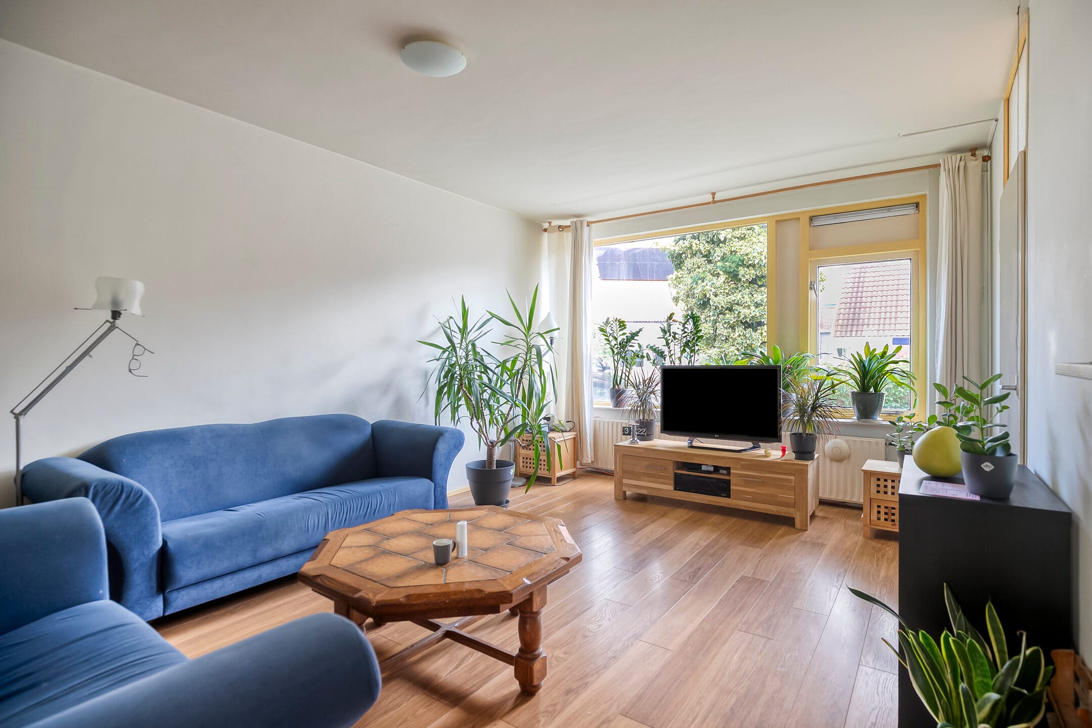 Je betreedt de woning via de ruime entree met garderobe, meterkast en toiletruimte. Vanuit hier stap je de lichte woonkamer binnen, waar de grote raampartijen zorgen voor een prettige hoeveelheid daglicht. De woonkamer biedt volop mogelijkheden om een gezellig zit- en eetgedeelte te creëren.
