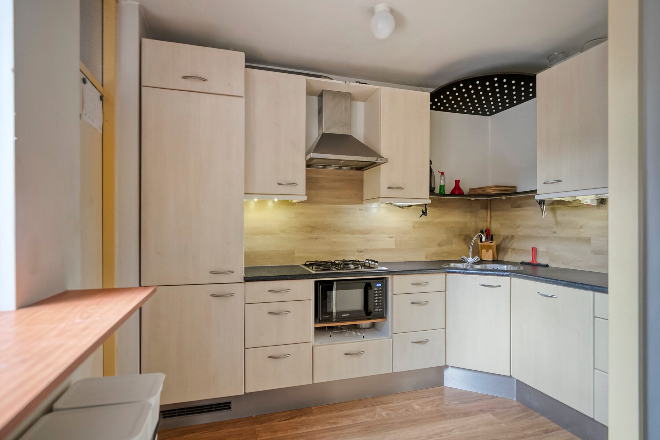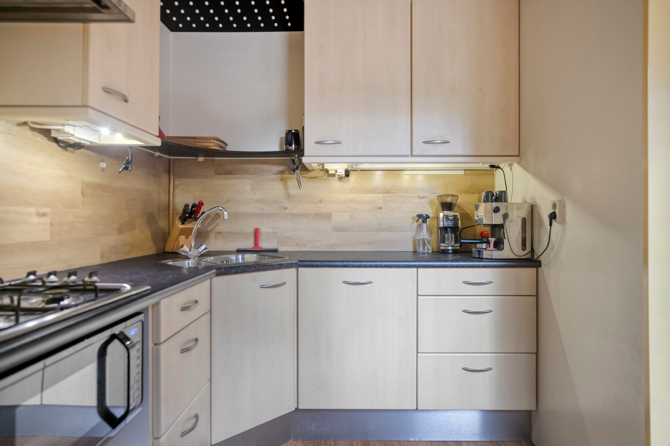 De halfopen keuken is ruim opgezet en voorzien van diverse inbouwapparatuur, waaronder een vierpits gasfornuis en vaatwasser. Dankzij de directe toegang tot de bergruimte is hier eenvoudig een bijkeuken of een royale woonkeuken te realiseren — ideaal voor wie houdt van koken en gezellig samenzijn.