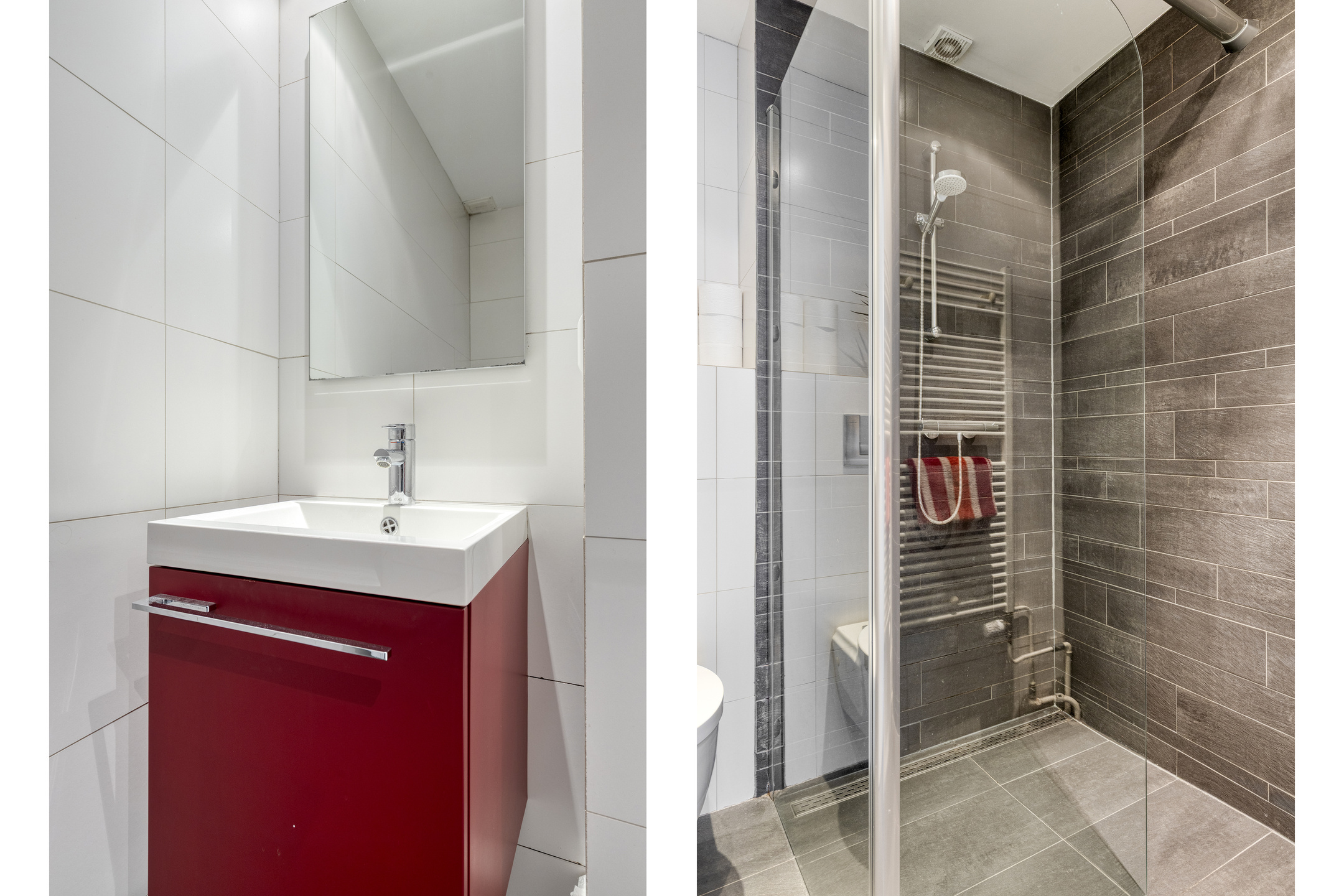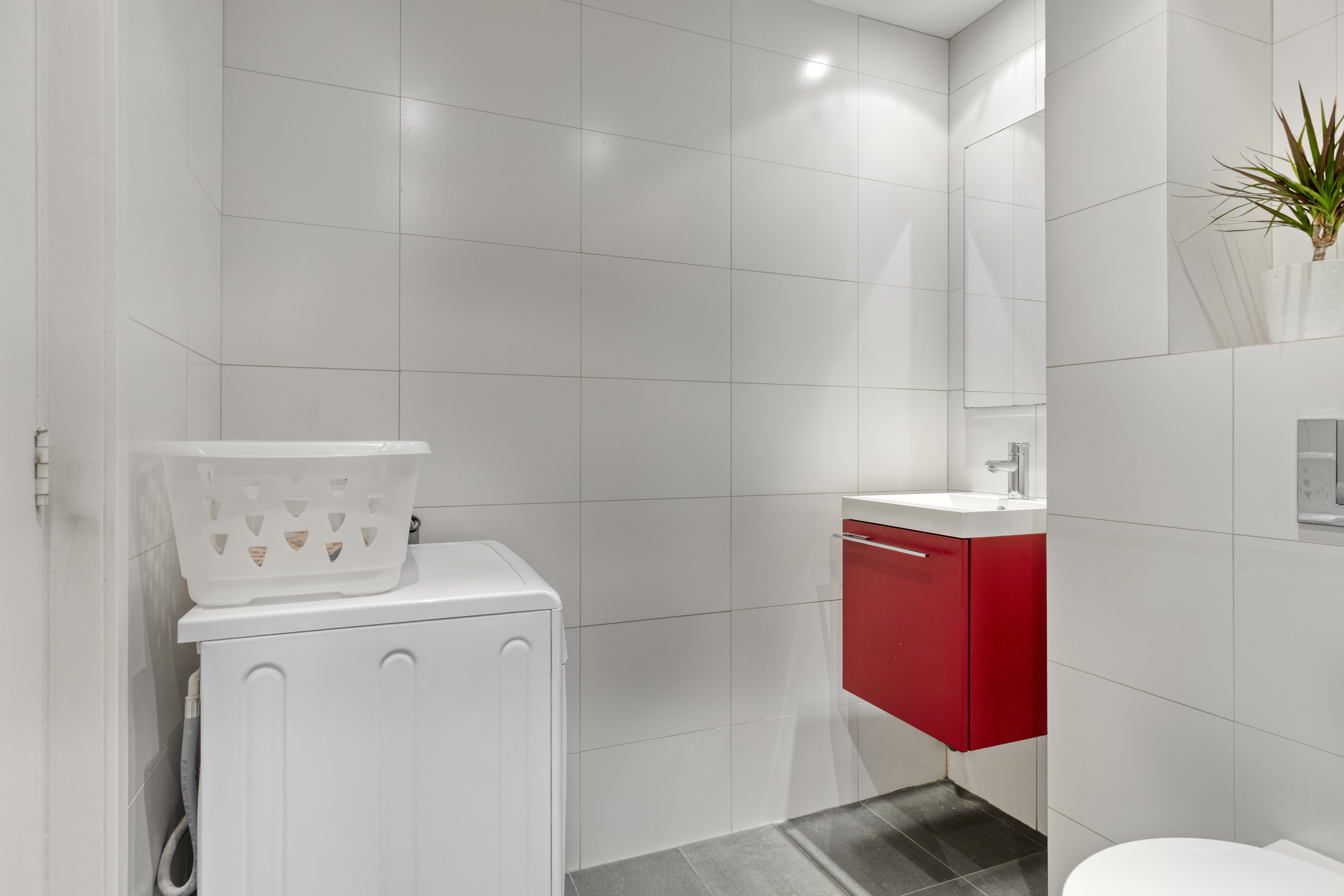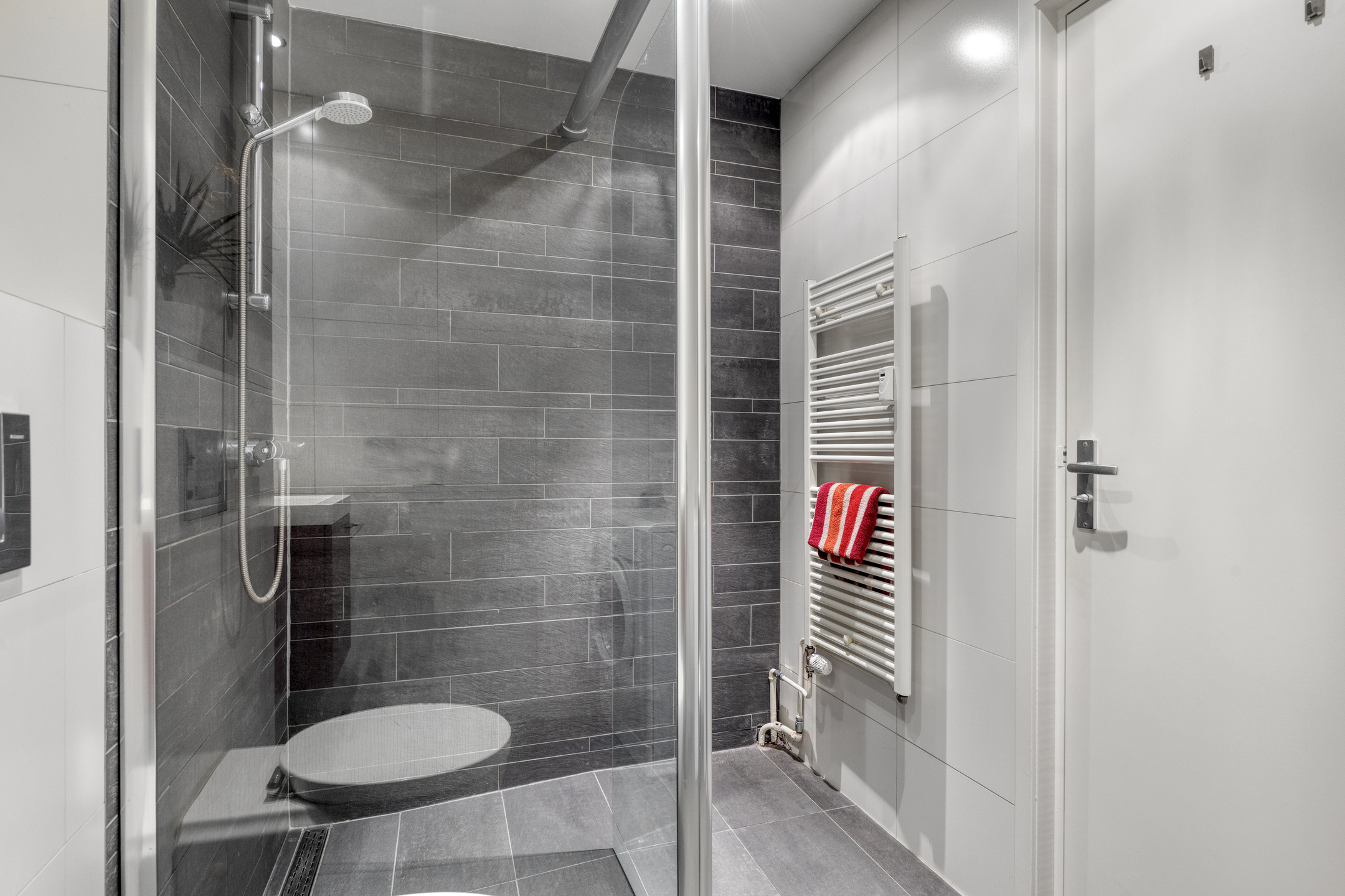 De moderne badkamer is van alle gemakken voorzien. Hier vind je een royale inloop douche, een wastafel met meubel, wasmachine aansluiting en tevens het toilet.