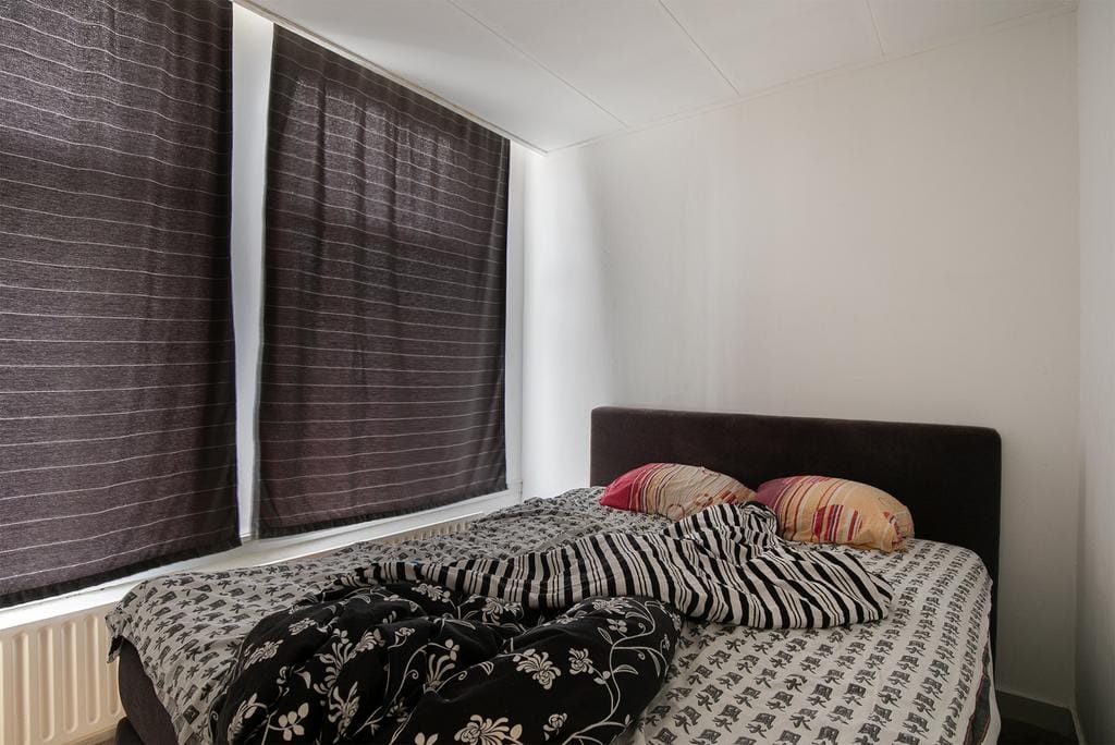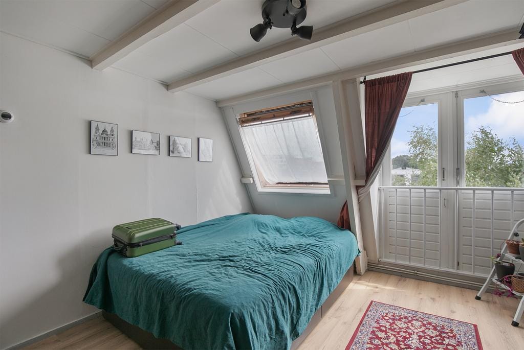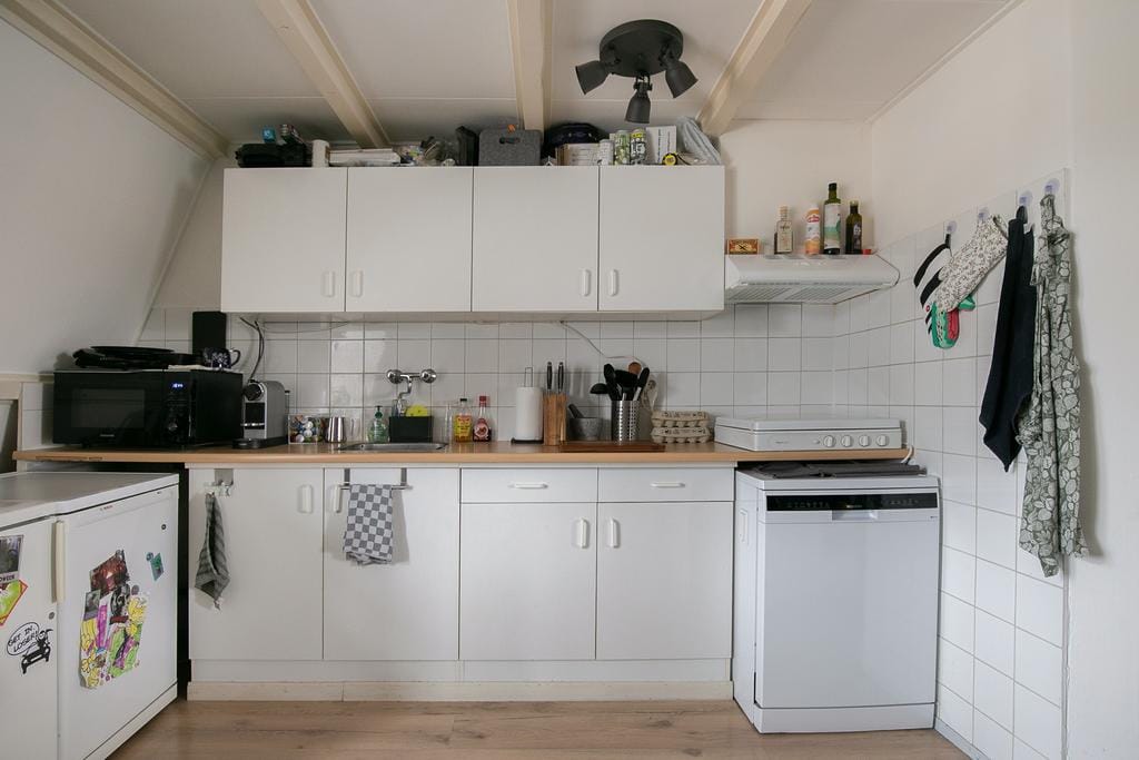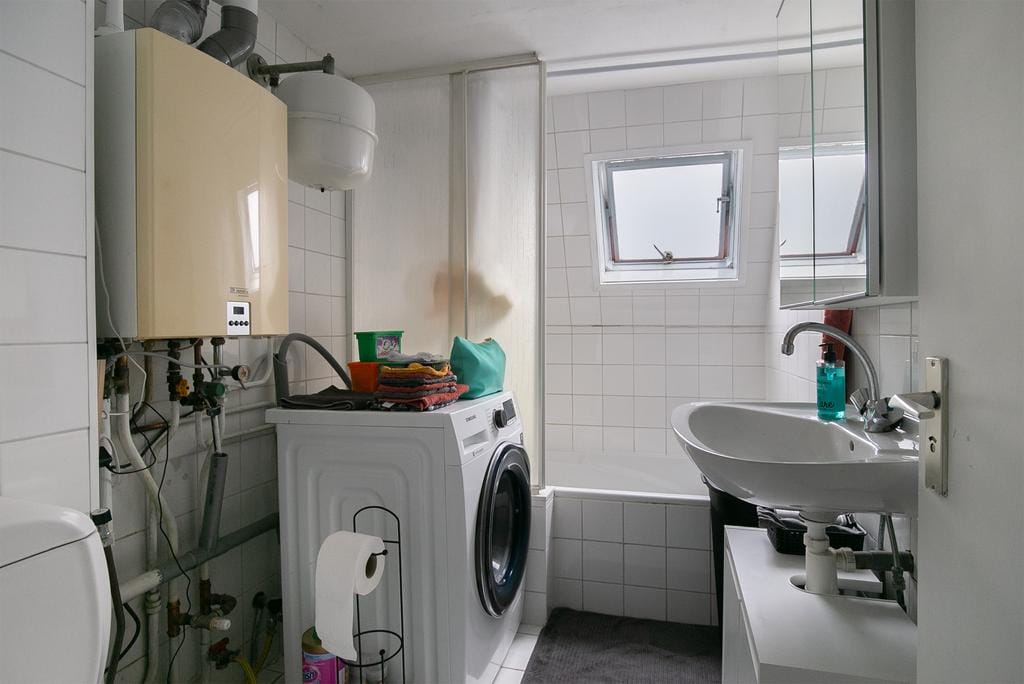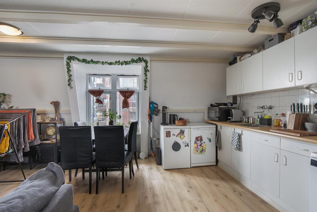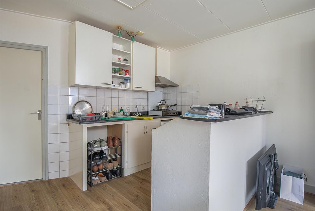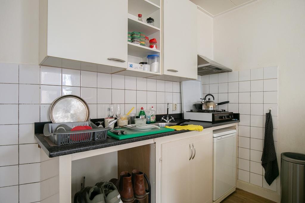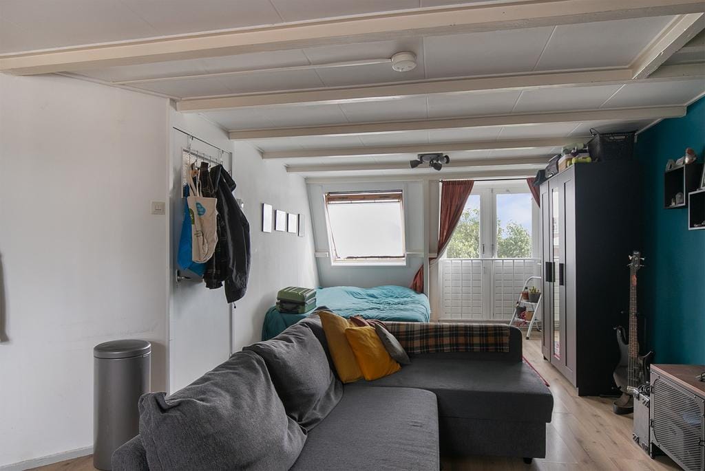 Bij binnenkomst wordt u verwelkomd in de sfeervolle woonkamer met open keuken. De keuken is uitgerust met alle benodigde voorzieningen en beschikt over twee handige aanrechten voor extra kookoppervlak. Dankzij de grote ramen die reiken tot aan het plafond, baadt de woonkamer in natuurlijk licht en creëren de fraai geplaatste radiatorkasten een warme sfeer. Langs de keuken vindt u een knusse slaapkamer, waar moeiteloos een comfortabel tweepersoonsbed in past. De badkamer is goed onderhouden en biedt alles wat u nodig heeft, inclusief een inloopdouche, toilet en wasmachineaansluiting. Via de badkamer heeft u toegang tot het ruime dakterras, waar u heerlijk kunt vertoeven.