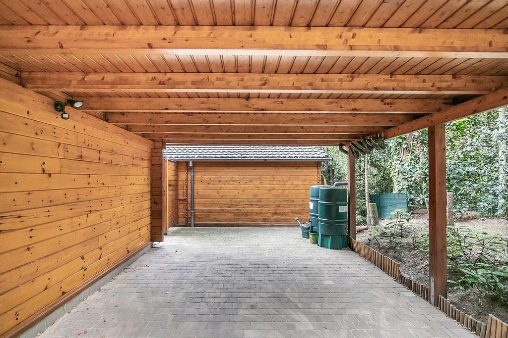 The garden is directly accessible via the driveway or the back entrance. This beautifully landscaped garden surrounds the house and offers a pleasant degree of privacy thanks to the high hedge. The current owners have always maintained the garden with care, and it extends completely around the house, allowing you to enjoy the sun at any time of day. In addition, the garden features a well-maintained shed with plenty of space for your bicycles. For added convenience, there is a canopy on the driveway, where you can effortlessly park two cars dry.