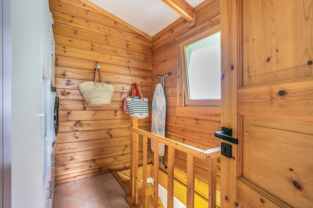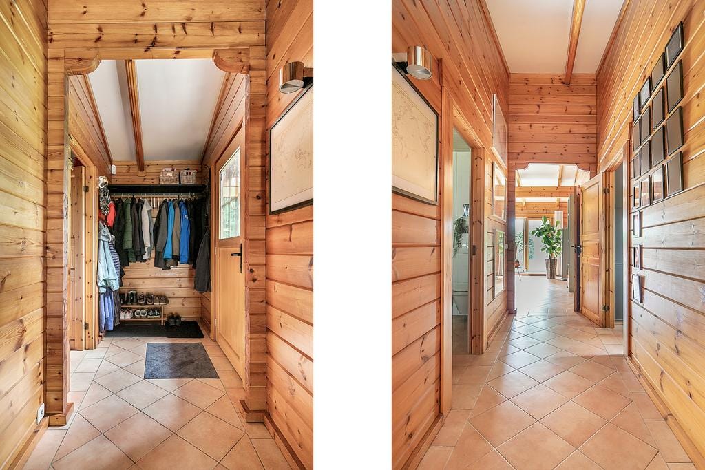 Ein Weg entlang des Vorgartens führt Sie zum Eingang des Hauses. Der erste Teil des Flurs ist der Garderobe und dem Durchgang zur Spülküche/Waschküche und dem Keller gewidmet. In der Waschküche befinden sich die notwendigen Installationen für die Waschmaschine sowie ein maßgefertigter Wäschetrockner mit viel Stauraum. Die Treppe nach unten führt Sie in den Keller. Keller mit Fliesenbelag und viel Stauraum.