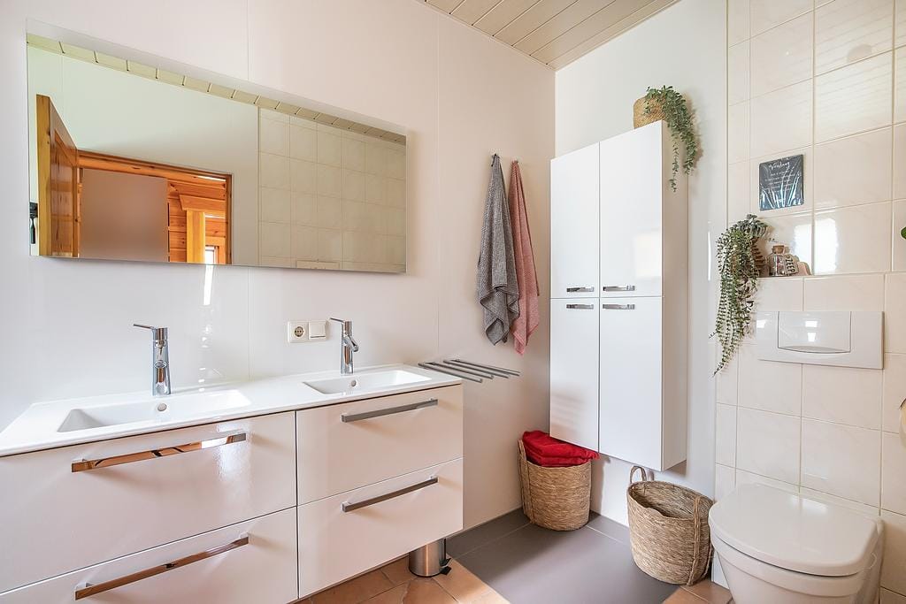 A path along the front garden leads you to the entrance of the house. The first part of the hall is dedicated to the coat rack and the passage to the utility/laundry room and basement. In the utility/laundry room are the necessary installation for the washing machine plus a custom-made ‘wastower’ with plenty of storage space. The stairs down lead you to the basement. Basement with tiling and lots of storage space. The second part of the hall gives access to the bathroom, first bedroom and living room. The bathroom was renovated in 2021 and equipped with a spacious walk-in shower with infrared heat lamp. In addition, there are two washbasins plus sink unit and a floating toilet.