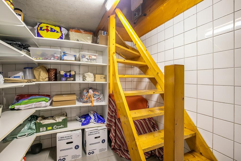Een pad langs de voortuin leidt u naar de entree van de woning. Het eerste deel van de hal is bestemd voor de kapstok en de doorgang naar de bijkeuken/wasruimte en kelder. In de bijkeuken/wasruimte zijn de nodige installatie voor de wasmachine plus een op maat gemaakte ‘wastower’ met veel bergruimte. De trap naar beneden leidt u naar de kelder. Kelder met betegeling en veel opbergruimte.